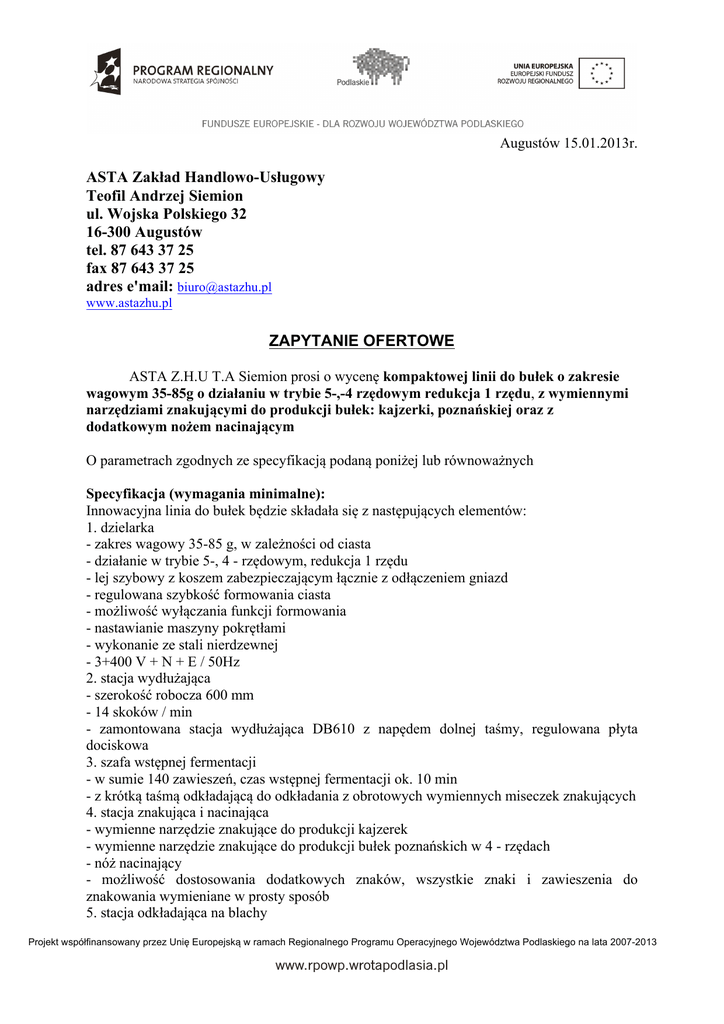 Augustów 15.01.2013r. ASTA Zakład Handlowo-Usługowy Teofil Andrzej Siemion ul. Wojska Polskiego 32 16-300 Augustów tel. 87 643 37 25 fax 87 643 37 25 adres e'mail: [email protected] www.astazhu.pl ZAPYTANIE OFERTOWE ASTA Z.H.U T.A Siemion prosi o wycenę kompaktowej linii do bułek o zakresie wagowym 35-85g o działaniu w trybie 5-,-4 rzędowym redukcja 1 rzędu, z wymiennymi narzędziami znakującymi do produkcji bułek: kajzerki, poznańskiej oraz z dodatkowym nożem nacinającym O parametrach zgodnych ze specyfikacją podaną poniżej lub równoważnych Specyfikacja (wymagania minimalne): Innowacyjna linia do bułek będzie składała się z następujących elementów: 1. dzielarka - zakres wagowy 35-85 g, w zależności od ciasta - działanie w trybie 5-, 4 - rzędowym, redukcja 1 rzędu - lej szybowy z koszem zabezpieczającym łącznie z odłączeniem gniazd - regulowana szybkość formowania ciasta - możliwość wyłączania funkcji formowania - nastawianie maszyny pokrętłami - wykonanie ze stali nierdzewnej - 3+400 V + N + E / 50Hz 2. stacja wydłużająca - szerokość robocza 600 mm - 14 skoków / min - zamontowana stacja wydłużająca DB610 z napędem dolnej taśmy, regulowana płyta dociskowa 3. szafa wstępnej fermentacji - w sumie 140 zawieszeń, czas wstępnej fermentacji ok. 10 min - z krótką taśmą odkładającą do odkładania z obrotowych wymiennych miseczek znakujących 4. stacja znakująca i nacinająca - wymienne narzędzie znakujące do produkcji kajzerek - wymienne narzędzie znakujące do produkcji bułek poznańskich w 4 - rzędach - nóż nacinający - możliwość dostosowania dodatkowych znaków, wszystkie znaki i zawieszenia do znakowania wymieniane w prosty sposób 5. stacja odkładająca na blachy Projekt współfinansowany przez Unię Europejską w ramach Regionalnego Programu Operacyjnego Województwa Podlaskiego na lata 2007-2013 - długość odkładania do maks. 1035 mm - odkładanie na blachy o wymiarach maksymalnych 580 x 780 mm lub 580 x 980 mm - odkładanie na krótką taśmę pośrednią prowadzącą do jednostki - sterylizacja pustych zawieszeń 6. sterowanie komputerowe - wyświetlacz graficzny z opisem w języku polskim Zamawiający nie dopuszcza składania ofert częściowych Zamawiający nie dopuszcza możliwości powierzenia części lub całości zamówienia podwykonawcom. Odpowiedzi prosimy kierować na nasz adres: ASTA Z.H.U T. A. Siemion ul. Wojska Polskiego 32 16-300 Augustów lub adres e'mail: [email protected] Maksymalny termin realizacji zamówienia: do 31.05.2013r. Kryterium wyboru oferty: -cena 60%-60pkt. -parametry techniczne 40%-40pkt a)zakres wagowy 20%-20pkt b)dodatkowy nóż nacinający 20%-20pkt Termin składania ofert: do 31.01.2013r. Oferta będzie ważna przez miesiąc od daty złożenia. Oferty złożone po terminie nie będą rozpatrywane. Dodatkowych informacji udziela Pan Teofil Andrzej Siemion pod nr tel. 87 643 37 25 oraz adresem e'mail: [email protected] Projekt współfinansowany przez Unię Europejską w ramach Regionalnego Programu Operacyjnego Województwa Podlaskiego na lata 2007-2013