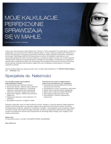 Lubimy, gdy nasi pracownicy mają ambitne cele. A jak jest w Twoim przypadku? Czy jesteś gotów rozwijać się podejmując nowe wyzwania? My w MAHLE jesteśmy jednym z trzech czołowych światowych dostawców w branży motoryzacyjnej w obszarach komponentów silnikowych, filtracji, elektryki/mechatroniki i zarządzania termicznego. Zatrudniając około 66 000 pracowników w ponad 150 zakładach produkcyjnych oraz dysponując dziesięcioma wielkimi centrami badawczo-rozwojowymi dążymy do tego, aby w pełni zadowolić naszego klienta. Dzięki pracy zespołowej łączymy istniejące już technologie z innowacyjnymi rozwiązaniami, opracowujemy inżynierskie pomysły oraz wyznaczamy nowe standardy. Przyczyniamy się także do poprawy klimatu poprzez redukcję emisji dwutlenku węgla (CO2) oraz zmniejszenie zużycia paliwa w co drugim pojeździe na świecie. Dziel się wiedzą praktyczną, realizuj pomysły i bierz na siebie odpowiedzialność. W MAHLE Polska Spółka z o.o. , Krotoszyn jako Specjalista ds. Należności Czy chciałbyś podjąć się szczególnie odpowiedzialnych zadań? • Kontrolowanie stanu należności klientów • Monitoring i dbanie o właściwy spływ należności • Wspieranie działań związanych z windykacją należności: potwierdzenia sald, księgowanie należności, naliczanie i księgowanie odsetek • Zapewnienie ciągłości i efektywności procesów księgowych • Księgowanie wpływów z tytułu należności i ich rozliczanie • Sporządzanie raportów z podjętych działań Pochwal się nam swoimi umiejętnościami zarówno tymi zawodowymi, jak i osobistymi. • Wykształcenie wyższe (preferowane kierunki finansowe lub ekonomia) • Doświadczenie w pracy na podobnym stanowisku • Bardzo dobra znajomość języka angielskiego • Bardzo dobra znajomość pakietu MS Office • Mile widziana znajomość systemu SAP • Samodzielność, zdolności negocjacyjne, asertywność Oferujemy doskonałe i szyte na miarę możliwości rozwoju. Jesteśmy w stanie je zapewnić dzięki regularnym zebraniom skoncentrowanym na omawianiu działań oraz programowi różnorodnych szkoleń. Doceniamy ponadprzeciętną wydajność, dlatego też chcielibyśmy nawiązać z Tobą długoterminową współpracę. Dajemy Ci nie tylko szansę wykorzystania swojego potencjału, ale także wynagrodzenie adekwatne do osiąganych wyników oraz elastyczne warunki pracy dopasowane do aktualnego etapu twojego życia. Podążaj z nami ścieżką swojej kariery. Aplikuj teraz. W razie pytań prosimy o kontakt: Pani MARTA KOWAL-KACZMAREK, jobs.mahle.com