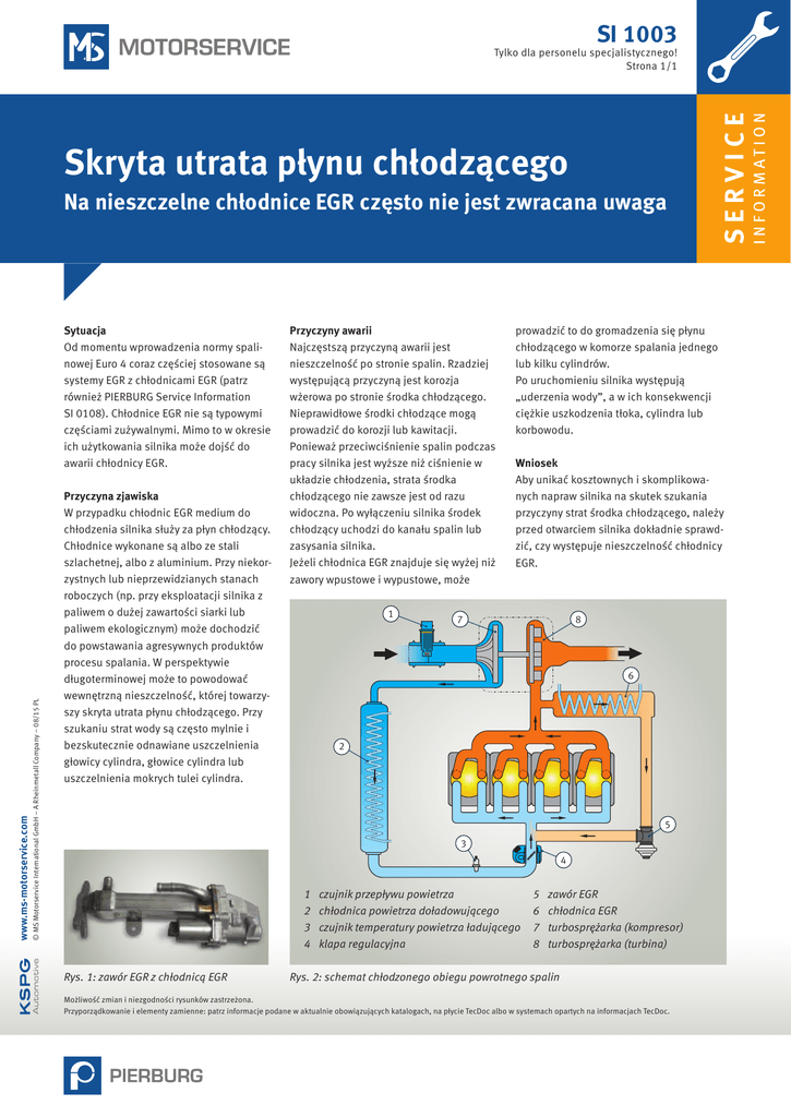 SI 1003 Tylko dla personelu specjalistycznego! Strona 1/1 Skryta utrata płynu chłodzącego Na nieszczelne chłodnice EGR często nie jest zwracana uwaga Przyczyna zjawiska W przypadku chłodnic EGR medium do chłodzenia silnika służy za płyn chłodzący. Chłodnice wykonane są albo ze stali szlachetnej, albo z aluminium. Przy niekorzystnych lub nieprzewidzianych stanach roboczych (np. przy eksploatacji silnika z paliwem o dużej zawartości siarki lub paliwem ekologicznym) może dochodzić do powstawania agresywnych produktów procesu spalania. W perspektywie długoterminowej może to powodować wewnętrzną nieszczelność, której towarzyszy skryta utrata płynu chłodzącego. Przy szukaniu strat wody są często mylnie i bezskutecznie odnawiane uszczelnienia głowicy cylindra, głowice cylindra lub uszczelnienia mokrych tulei cylindra. www.ms-motorservice.com © MS Motorservice International GmbH – A Rheinmetall Company – 08/15 PL Sytuacja Od momentu wprowadzenia normy spalinowej Euro 4 coraz częściej stosowane są systemy EGR z chłodnicami EGR (patrz również PIERBURG Service Information SI 0108). Chłodnice EGR nie są typowymi częściami zużywalnymi. Mimo to w okresie ich użytkowania silnika może dojść do awarii chłodnicy EGR. Przyczyny awarii Najczęstszą przyczyną awarii jest nieszczelność po stronie spalin. Rzadziej występującą przyczyną jest korozja wżerowa po stronie środka chłodzącego. Nieprawidłowe środki chłodzące mogą prowadzić do korozji lub kawitacji. Ponieważ przeciwciśnienie spalin podczas pracy silnika jest wyższe niż ciśnienie w układzie chłodzenia, strata środka chłodzącego nie zawsze jest od razu widoczna. Po wyłączeniu silnika środek chłodzący uchodzi do kanału spalin lub zasysania silnika. Jeżeli chłodnica EGR znajduje się wyżej niż zawory wpustowe i wypustowe, może 1 prowadzić to do gromadzenia się płynu chłodzącego w komorze spalania jednego lub kilku cylindrów. Po uruchomieniu silnika występują „uderzenia wody”, a w ich konsekwencji ciężkie uszkodzenia tłoka, cylindra lub korbowodu. Wniosek Aby unikać kosztownych i skomplikowanych napraw silnika na skutek szukania przyczyny strat środka chłodzącego, należy przed otwarciem silnika dokładnie sprawdzić, czy występuje nieszczelność chłodnicy EGR. 7 8 6 2 5 3 4 1 2 3 4 Rys. 1: zawór EGR z chłodnicą EGR czujnik przepływu powietrza chłodnica powietrza doładowującego czujnik temperatury powietrza ładującego klapa regulacyjna 5 6 7 8 zawór EGR chłodnica EGR turbosprężarka (kompresor) turbosprężarka (turbina) Rys. 2: schemat chłodzonego obiegu powrotnego spalin Możliwość zmian i niezgodności rysunków zastrzeżona. Przyporządkowanie i elementy zamienne: patrz informacje podane w aktualnie obowiązujących katalogach, na płycie TecDoc albo w systemach opartych na informacjach TecDoc.