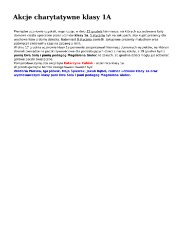 Akcje charytatywne klasy 1A Pieniądze uczniowie uzyskali, organizując w dniu 15 grudnia kiermasze, na których sprzedawane były domowe ciasta upieczone przez uczniów klasy 1a. 5 stycznia byli na zakupach, aby kupić prezenty dla wychowanków z domu dziecka. Natomiast 9 stycznia zanieśli zakupione prezenty maluchom oraz poświęcali swój wolny czas na zabawę z nimi. W dniu 17 grudnia uczniowie klasy 1a ponownie zorganizowali kiermasz domowych wypieków, na którym zbierali pieniądze na paczki żywnościowe dla potrzebujących dzieci z naszej szkoły, a 19 grudnia byli z panią Ewą Solą i panią pedagog Magdaleną Gielec na zakuch. 20 grudnia dzieci mogły juz odbierać gotowe paczki świąteczne. Pomysłodawczynią obu akcji była Katarzyna Kubiak - uczennica klasy 1a. W przedsięwzięcie bardzo zaangażowani również byli: Wiktoria Wolska, Iga Jóźwik, Maja Śpiewak, Jakub Bąbel, rodzice uczniów klasy 1a oraz wychowawczyni klasy pani Ewa Sola i pani pedagog Magdalena Gielec.