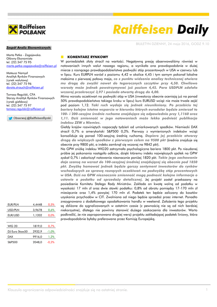 BIULETYN DZIENNY, 24 maja 2016, GODZ 9.10 Zespół Analiz Ekonomicznych: Marta Petka - Zagajewska. Główny Ekonomista tel. (22) 347 75 95 [email protected] Mateusz Namysł Analityk Rynków Finansowych (rynek walutowy) tel. (22) 347 75 96 [email protected] Tomasz Regulski, CFA Starszy Analityk Rynków Finansowych (rynek giełdowy) tel. (22) 347 75 97 [email protected] EUR/PLN 4,4448 0,5% USD/PLN 3,9678 0,6% EUR/USD 1,1202 0,0% WIG 20 1819,0 0,7% DJ Euro Stoxx50 2932,9 -1,0% DAX 9916,0 1,2% S&P500 2048,0 -0,2% KOMENTARZ RYNKOWY W poniedziałek złoty stracił na wartości. Negatywną presję obserwowaliśmy również w notowaniach innych walut naszego regionu, a wynikała ona prawdopodobnie w dużej mierze z rosnącego prawdopodobieństwa podwyżki stóp procentowych w USA w czerwcu lub w lipcu. Kurs EURPLN wzrósł z poziomu 4,42 w okolice 4,45 i tym samym pokonał lokalne maksima z pierwszej połowy maja, co z punktu widzenia analizy technicznej otwiera mu drogę do zwyżki nawet do tegorocznych szczytów przy 4,50. Chwilowo wzrosty może jednak powstrzymywać już poziom 4,45. Para USDPLN zdołała wczoraj przekroczyć 3,97 i posiada otwartą drogę do 4,00. Mimo wzrostu oczekiwań na podwyżki stóp w USA (inwestorzy obecnie oceniają już na ponad 50% prawdopodobieństwo takiego kroku w lipcu) kurs EURUSD wciąż nie może trwale zejść pod poziom 1,12. Taki ruch wydaje się jednak nieunikniony. Po przebiciu tej bariery kolejne istotne wsparcia w kierunku których eurodolar będzie zmierzał to 100- i 200-sesyjne średnie ruchome znajdujące się odpowiednio przy 1,1160 oraz 1,11. Dziś zmienność w jego notowaniach może lekko podnieść publikacja indeksu ZEW z Niemiec. Giełdy krajów rozwiniętych rozpoczęły tydzień od umiarkowanych spadków. Niemiecki DAX stracił 0,7% a amerykański S&P500 0,2%. Pierwszy z wymienionych indeksów wciąż konsoliduje się ponad 100-sesyjną średnią ruchomą. Dopiero jej przebicie otworzy drogę do większych spadków z pierwszym celem na 9500 pkt (średnia znajduje się obecnie przy 9800 pkt, a indeks zamknął się wczoraj na 9842 pkt). Na GPW zniżkę indeksu WIG20 zatrzymała psychologiczna bariera 1800 pkt. Po nieudanej próbie jej pokonania nastąpiło odbicie, dzięki któremu indeks największych spółek na GPW zyskał 0,7% i zakończył notowania nieznacznie poniżej 1820 pkt. Takie jego zachowanie daje szansę na wzrost do 100-sesyjnej średniej znajdującej się obecnie pod 1850 pkt. Zwyżkę hamować jednak będzie gorszy sentyment inwestorów do rynków wschodzących za sprawą rosnących oczekiwań na podwyżkę stóp procentowych w USA. Dziś na GPW nieznacznie zmienność mogą podnosić kolejne informacje o ustawie o podatku od sprzedaży detalicznej. Jej projekt został przekazany na posiedzenie Komitetu Stałego Rady Ministrów. Zakłada on kwotę wolną od podatku w wysokości 17 mln zł oraz dwie stawki podatku: 0,8% od obrotu pomiędzy 17-170 mln zł miesięcznie oraz 1,4% powyżej 170 mln zł. Podatek ten będzie zaliczany do kosztów uzyskania przychodów w CIT. Zwolniona od niego będzie sprzedaż przez internet. Ponadto zrezygnowano z dodatkowego opodatkowania handlu w weekend. Założenia tego projektu są zbliżone do sygnalizowanych w ostatnim czasie (z pewnością nie są od nich bardziej niekorzystne), dlatego nie powinny stanowić dużego zaskoczenia dla inwestorów. Warto podkreślić, że nie zaproponowano drugiej wersji projektu zakładającej podatek liniowy, która prawdopodobnie byłaby preferowana przez Komisję Europejską. Klauzula ograniczenia odpowiedzialności znajduje się na ostatniej stronie. 1 BIULETYN DZIENNY, 24 maja 2016, GODZ 9.10 Stan na początek dnia Waluty EUR/PLN Zamkn. 4,4448 Zmiana % Zmiana % 5 sesji 4,4438 0,50% 1,72% 0,57% 2,64% USD/PLN 3,9678 3,9606 Wyniki sesji: Polska Zamkn. Zmiana % WIG 46042,2 0,56% -1,67% 526 598,19 WIG 20 1819,0 0,70% -1,88% 436 286,88 Zmiana % 5 sesji obroty (w tys PLN) CHF/PLN 4,0031 4,0030 0,63% 1,42% WIG 30 2019,2 0,68% -1,97% 457 225,84 EUR/USD 1,1202 1,1220 -0,04% -0,89% mWIG40 3496,9 0,50% -1,34% 73 659,91 GBP/PLN 5,7453 5,7382 0,30% 3,26% sWIG80 13689,3 0,06% -1,42% 16 591,70 WIG Banki 5863,0 2,03% -1,46% 151 249,30 WIG Telkom 737,9 -1,83% -2,40% 17 736,64 WIG Budow 2797,5 0,16% -0,98% 7 197,24 0,0020 WIG Paliwa 4620,4 0,20% 0,98% 58 012,57 Zmiana (pb) Wyniki sesji: Świat Indeks *Zamkniecie z poprzedniego dnia z godziny 22:00 FIXINGI Data 3M Euribor Wartość 2016-05-23 3M Libor CHF 2016-05-20 FIXINGI Zmiana (pb) - -0,258% -0,733% Wartość 1,58% - 3M Wibor fixing 1,67% - Czechy PX 6M Wibor fixing 1,74% - Węgry BUX FIXING NBP Wartość Zmiana % Zmiana % 5 sesji Europa Środkowa i Wschodnia 1M Wibor fixing *Fixing z dnia poprzedniego Zamkn. 874,8 -0,04% -0,89% 26368,3 -0,25% -0,71% 881,9 0,26% -5,35% 76688,0 -0,10% -0,40% Rosja RTS Turcja BIST100 Europa DJ Euro Stoxx50 2932,9 -0,99% -0,63% Niemcy DAX 9916,0 1,23% 0,55% -0,24% Zmiana % Europa Zachodnia EUR/PLN 4,4293 0,29% GBP/PLN 5,7449 0,16% UK FTSE 100 6136,4 -0,32% CHF/PLN 3,9862 0,35% Francja CAC 40 4325,1 -0,66% 0,30% FTSE MIB 17325,1 -2,74% -2,32% *Fixing z dnia poprzedniego Włochy Ameryka Północna i Południowa Surowiec jednostka S&P GSCI punkty Ropa Brent barylka Złoto uncja Srebro uncja Miedź tona Zamkn. Zmiana % (USD) Zmiana % 5 sesji USA DJIA 17492,9 -0,05% -1,23% USA S&P500 2048,0 -0,21% -0,90% Brazylia IBX50 8304,8 -0,78% -4,70% -2,79% Japonia NIKKEI 225 16498,8 -0,94% -0,93% -0,78% -5,74% Chiny SSE Composite 2819,9 -0,84% -0,84% -0,35% -1,79% Indie SENSEX 25230,6 0,00% -2,11% 364,89 -0,66% -0,75% 47,93 -0,87% -2,74% 1 243,31 -0,47% 16,26 4 562,00 Azja 2 Klauzula ograniczenia odpowiedzialności znajduje się na ostatniej stronie. BIULETYN DZIENNY, 24 maja 2016, GODZ 9.10 Kalendarium Godz. Kraj Wskaźnik Ostateczna dana Prognoza Średnia Poprzedni Raiffeisen oczekiwań PIĄTEK 20 MAJA 16:00 US Sprzedaż domów - rynek wtórny (Kwiecień, mln) 5,45 5,40 5,30 PONIEDZIAŁEK 23 MAJA 0