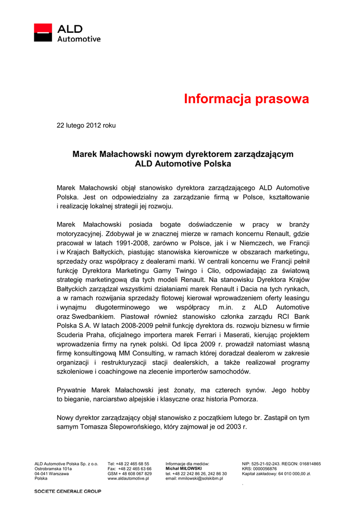 Informacja prasowa 22 lutego 2012 roku Marek Małachowski nowym dyrektorem zarządzającym ALD Automotive Polska Marek Małachowski objął stanowisko dyrektora zarządzającego ALD Automotive Polska. Jest on odpowiedzialny za zarządzanie firmą w Polsce, kształtowanie i realizację lokalnej strategii jej rozwoju. Marek Małachowski posiada bogate doświadczenie w pracy w branży motoryzacyjnej. Zdobywał je w znacznej mierze w ramach koncernu Renault, gdzie pracował w latach 1991-2008, zarówno w Polsce, jak i w Niemczech, we Francji i w Krajach Bałtyckich, piastując stanowiska kierownicze w obszarach marketingu, sprzedaży oraz współpracy z dealerami marki. W centrali koncernu we Francji pełnił funkcję Dyrektora Marketingu Gamy Twingo i Clio, odpowiadając za światową strategię marketingową dla tych modeli Renault. Na stanowisku Dyrektora Krajów Bałtyckich zarządzał wszystkimi działaniami marek Renault i Dacia na tych rynkach, a w ramach rozwijania sprzedaży flotowej kierował wprowadzeniem oferty leasingu i wynajmu długoterminowego we współpracy m.in. z ALD Automotive oraz Swedbankiem. Piastował również stanowisko członka zarządu RCI Bank Polska S.A. W latach 2008-2009 pełnił funkcję dyrektora ds. rozwoju biznesu w firmie Scuderia Praha, oficjalnego importera marek Ferrari i Maserati, kierując projektem wprowadzenia firmy na rynek polski. Od lipca 2009 r. prowadził natomiast własną firmę konsultingową MM Consulting, w ramach której doradzał dealerom w zakresie organizacji i restrukturyzacji stacji dealerskich, a także realizował programy szkoleniowe i coachingowe na zlecenie importerów samochodów. Prywatnie Marek Małachowski jest żonaty, ma czterech synów. Jego hobby to bieganie, narciarstwo alpejskie i klasyczne oraz historia Pomorza. Nowy dyrektor zarządzający objął stanowisko z początkiem lutego br. Zastąpił on tym samym Tomasza Ślepowrońskiego, który zajmował je od 2003 r. ALD Automotive Polska Sp. z o.o. Ostrobramska 101a 04-041 Warszawa Polska Tel: +48 22 465 68 55 Fax: +48 22 465 63 66 GSM + 48 608 067 829 www.aldautomotive.pl Informacje dla mediów: Michał MIŁOWSKI tel. +48 22 242 86 26, 242 86 30 email: [email protected] NIP: 525-21-92-243. REGON: 016814865 KRS: 0000056876 Kapitał zakładowy: 64 010 000,00 zł. . ### Informacje o ALD Automotive ALD Automotive należy do grupy Société Générale i specjalizuje się w świadczeniu usług wynajmu długoterminowego, finansowania oraz zarządzania flotami pojazdów. Istniejąca od 1946 r. firma zarządza parkiem ponad 900 tys. samochodów w 37 krajach i zajmuje 2. miejsce na rynku europejskim. W Polsce ALD Automotive zarządza flotą ponad 6 tys. pojazdów i należy do czołówki graczy na naszym rynku. Działa na nim od 2003 r., kontynuując działalność Multifleet Partners. Firma ALD Automotive należy do Polskiego Związku Wynajmu i Leasingu Pojazdów. Więcej informacji na jej temat znajduje się na stronie www.aldautomotive.pl. Dodatkowych informacji udziela: Michał Miłowski Senior Associate Solski Burson-Marsteller ul. Krakowskie Przedmieście 47/51 00-071 Warszawa Tel. +48 (22) 242 86 26, 242 86 00 Kom. +48 696 843 641 Email: [email protected] 2