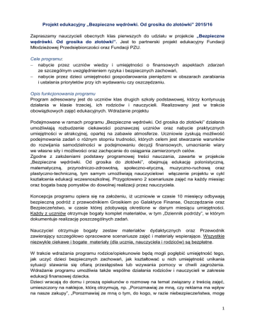 Projekt edukacyjny „Bezpieczne wędrówki. Od grosika do złotówki” 2015/16 Zapraszamy nauczycieli obecnych klas pierwszych do udziału w projekcie „Bezpieczne wędrówki. Od grosika do złotówki”. Jest to partnerski projekt edukacyjny Fundacji Młodzieżowej Przedsiębiorczości oraz Fundacji PZU. Cele programu: nabycie przez uczniów wiedzy i umiejętności o finansowych aspektach zdarzeń ze szczególnym uwzględnieniem ryzyka i bezpiecznych zachowań, nabycie przez dzieci umiejętności gospodarowania pieniędzmi w obszarach zarabiania i ustalania priorytetów przy ich wydawaniu czy oszczędzaniu. Opis funkcjonowania programu Program adresowany jest do uczniów klas drugich szkoły podstawowej, którzy kontynuują działania w klasie trzeciej, ich rodziców i nauczycieli. Realizowany jest w trakcie obowiązkowych zajęć edukacyjnych. Wdrażanie projektu Podejmowane w ramach programu „Bezpieczne wędrówki. Od grosika do złotówki” działania umożliwiają rozbudzenie ciekawości poznawczej uczniów oraz nabycie praktycznych umiejętności w atrakcyjnej, opartej na zabawie atmosferze. Uczniowie zyskują możliwość podejmowania zadań o różnym stopniu trudności, których celem jest stwarzanie warunków do rozwijania samodzielności w podejmowaniu decyzji finansowych, umacnianie wiary we własne siły i możliwości oraz zachęcanie do osiągania zamierzonych celów. Zgodne z założeniami podstawy programowej treści nauczania, zawarte w projekcie „Bezpieczne wędrówki. Od grosika do złotówki”, obejmują edukację polonistyczną, matematyczną, przyrodniczo-zdrowotną, społeczno-etyczną, muzyczno-ruchową oraz plastyczno-techniczną, tym samym umożliwiają nauczycielowi włączenie projektu w cykl kształcenia edukacji wczesnoszkolnej. Przygotowano 2 scenariusze zajęć na każdy miesiąc oraz bogata bazę pomysłów do dowolnej realizacji przez nauczyciela. Koncepcja programu opiera się na założeniu, iż uczniowie w czasie 10 miesięcy odbywają bezpieczną podróż z przewodnikiem Grosikiem po Galaktyce Finanse, Oszczędzanie oraz Bezpieczeństwo, w czasie której zdobywają określone w danym miesiącu umiejętności. Każdy z uczniów otrzymuje bogaty komplet materiałów, w tym „Dziennik podróży”, w którym dokumentuje realizację poszczególnych zadań. Nauczyciel otrzymuje bogaty zestaw materiałów dydaktycznych oraz Przewodnik zawierający szczegółowo opracowane scenariusze zajęć i materiały wspierające. Wszystkie niezwykle ciekawe i bogate materiały (dla ucznia, nauczyciela i rodziców) są bezpłatne. W trakcie wdrażania programu rodzice/opiekunowie będą mogli pogłębić umiejętność tego, jak uczyć dzieci bezpiecznych zachowań, jak kształtować u nich umiejętność unikania sytuacji stawania się ofiarą przestępstwa lub wzywania pomocy w chwili zagrożenia. Wdrażanie programu umożliwia także wspólne działania rodziców i nauczycieli w zakresie edukacji finansowej dziecka. Dzieci wracają do domu i proszą opiekunów o rozmowę na temat związany z treścią zajęć, umieszczony na naklejce, którą otrzymują, np. „Porozmawiaj ze mną, czy reklama ma wpływ na nasze zakupy”, „Porozmawiaj ze mną o tym, do kogo, w razie niebezpieczeństwa, mogę 1 zwrócić się o pomoc”. Wiedza z zakresu bezpieczeństwa gromadzona jest przez uczniów na Karcie bezpieczeństwa. W trakcie podróży jest też czas, w którym rodzice pełnią rolę konsultantów i w ciągu 14 dni dokonują analizy, w jakiej dziedzinie ich dziecko oszczędza najlepiej. Najistotniejsze umiejętności nabyte przez uczniów podczas realizacji programu Uczeń: utrwali wiedzę i umiejętność bezpiecznego zachowania się wobec zagrożeń i sytuacji nadzwyczajnych, rozwinie umiejętność racjonalnego gospodarowania pieniędzmi oraz zwiększy swoją wiedzę na temat bezpiecznego ich przechowywania, pozna znaczenie pojęć: moneta, banknot, nominał, bilon, awers i rewers, mennica, emisja, dług, lokata, karta płatnicza, konto, debet, karta kredytowa, inwestor, bankowiec, lokata, bankomat, kredyt, saldo, obligacja, pozna wartość i potrzebę pracy oraz wartość nabywczą pieniędzy, zapozna się ze sposobami zarabiania pieniędzy na drobne wydatki, pozna pojęcia: recykling, segregacja odpadów, surowce wtórne, ochrona środowiska, oszczędzanie przyrody, oszczędzanie domowego budżetu, bogactwo, skarby, dobro narodowe, gotówka, utrwali wiedzę dotyczącą wpływu reklamy na zachowanie konsumenta. Rodzice poznają sposoby kształtowania u dzieci umiejętności związanych z bezpieczeństwem i gospodarowaniem finansami, podejmą rozmowy z dziećmi z zakresu gospodarowania finansami i bezpiecznych zachowań. Nauczyciele włączą do zajęć dydaktycznych prowadzonych w klasie II i III zagadnienia z zakresu edukacji finansowej i bezpiecznych zachowań z wykorzystaniem pakietu dydaktycznego opracowanego do projektu „Bezpieczne wędrówki. Od grosika do złotówki”. Nauczyciele dokumentują realizację projektu poprzez zapis realizowanej tematyki w swoim dzienniku lekcyjnym. Harmonogram projektu: marzec - maj 2015 – nabór uczestników projektu (nauczyciele klas drugich w roku szkolnym 2015/16) październik - listopad 2015 – szkolenie nauczycieli (5 godz.) październik - grudzień 2015 – spotkania nauczycieli z rodzicami grudzień 2015, styczeń - czerwiec 2016, wrzesień - grudzień 2016 – wdrażanie projektu kwiecień-maj 2016 – warsztaty dla nauczycieli (3 godz.) Program finansowany jest ze środków Fundacji PZU. Więcej informacji: http://od-grosika-dozlotowki.junior.org.pl/pl Zgłoszenia przyjmuje i udziela wszystkich informacji Koordynator Projektu Bogusława Rajska [email protected] Bogusława Rajska nauczyciel - konsultant Wojewódzkiego Ośrodka Doskonalenia Nauczycieli w Łodzi 2