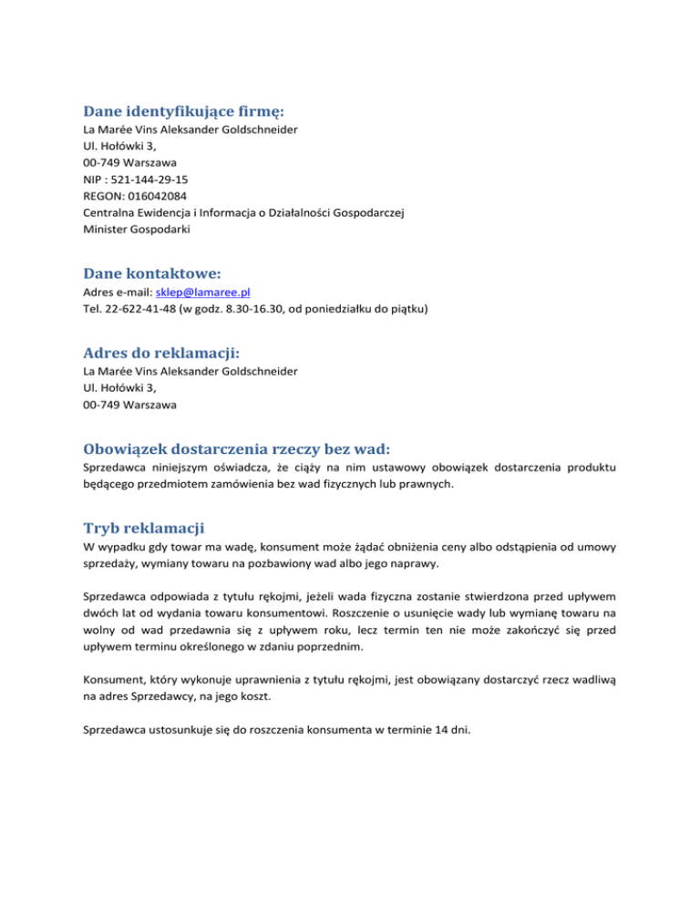 Dane identyfikujące firmę: La Marée Vins Aleksander Goldschneider Ul. Hołówki 3, 00-749 Warszawa NIP : 521-144-29-15 REGON: 016042084 Centralna Ewidencja i Informacja o Działalności Gospodarczej Minister Gospodarki Dane kontaktowe: Adres e-mail: [email protected] Tel. 22-622-41-48 (w godz. 8.30-16.30, od poniedziałku do piątku) Adres do reklamacji: La Marée Vins Aleksander Goldschneider Ul. Hołówki 3, 00-749 Warszawa Obowiązek dostarczenia rzeczy bez wad: Sprzedawca niniejszym oświadcza, że ciąży na nim ustawowy obowiązek dostarczenia produktu będącego przedmiotem zamówienia bez wad fizycznych lub prawnych. Tryb reklamacji W wypadku gdy towar ma wadę, konsument może żądać obniżenia ceny albo odstąpienia od umowy sprzedaży, wymiany towaru na pozbawiony wad albo jego naprawy. Sprzedawca odpowiada z tytułu rękojmi, jeżeli wada fizyczna zostanie stwierdzona przed upływem dwóch lat od wydania towaru konsumentowi. Roszczenie o usunięcie wady lub wymianę towaru na wolny od wad przedawnia się z upływem roku, lecz termin ten nie może zakończyć się przed upływem terminu określonego w zdaniu poprzednim. Konsument, który wykonuje uprawnienia z tytułu rękojmi, jest obowiązany dostarczyć rzecz wadliwą na adres Sprzedawcy, na jego koszt. Sprzedawca ustosunkuje się do roszczenia konsumenta w terminie 14 dni. Możliwość skorzystania z pozasądowych sposobów rozwiązywania sporów. Każdy Klient może skorzystać z pozasądowych sposobów rozpatrywania reklamacji i dochodzenia roszczeń. W tym zakresie możliwe jest skorzystanie przez Klienta z mediacji. Listy stałych mediatorów oraz istniejących ośrodkach mediacyjnych przekazywane są i udostępniane przez Prezesów właściwych Sądów Okręgowych.