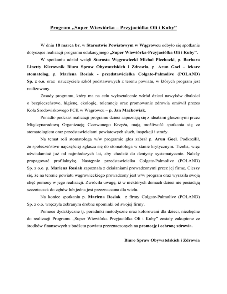Program „Super Wiewiórka – Przyjaciółka Oli i Kuby” W dniu 18 marca br. w Starostwie Powiatowym w Wągrowcu odbyło się spotkanie dotyczące realizacji programu edukacyjnego „Super Wiewiórka-Przyjaciółka Oli i Kuby”. W spotkaniu udział wzięli Starosta Wągrowiecki Michał Piechocki, p. Barbara Linetty Kierownik Biura Spraw Obywatelskich i Zdrowia, p. Arun Goel – lekarz stomatolog, p. Marlena Rosiak - przedstawicielka Colgate-Palmolive (POLAND) Sp. z o.o. oraz nauczyciele szkół podstawowych z terenu powiatu, w których program jest realizowany. Zasady programu, który ma na celu wykształcenie wśród dzieci nawyków dbałości o bezpieczeństwo, higienę, ekologię, tolerancję oraz promowanie zdrowia omówił prezes Koła Środowiskowego PCK w Wągrowcu – p. Jan Maćkowiak. Ponadto podczas realizacji programu dzieci zapoznają się z ideałami głoszonymi przez Międzynarodową Organizację Czerwonego Krzyża, mają możliwość spotkania się ze stomatologiem oraz przedstawicielami powiatowych służb, inspekcji i straży. Na temat roli stomatologa w/w programie głos zabrał p. Arun Goel. Podkreślił, że społeczeństwo najczęściej zgłasza się do stomatologa w stanie krytycznym. Trzeba, więc uświadamiać już od najmłodszych lat, aby chodzić do dentysty systematycznie. Należy propagować profilaktykę. Następnie przedstawicielka Colgate-Palmolive (POLAND) Sp. z o.o. p. Marlena Rosiak zapoznała z działaniami prowadzonymi przez jej firmę. Cieszy się, że na terenie powiatu wągrowieckiego prowadzony jest w/w program oraz wyraziła swoją chęć pomocy w jego realizacji. Zwróciła uwagę, iż w niektórych domach dzieci nie posiadają szczoteczek do zębów lub jedna jest przeznaczona dla wielu. Na koniec spotkania p. Marlena Rosiak z firmy Colgate-Palmolive (POLAND) Sp. z o.o. wręczyła zebranym drobne upominki od swojej firmy. Pomoce dydaktyczne tj. poradniki metodyczne oraz kolorowani dla dzieci, niezbędne do realizacji Programu „Super Wiewiórka Przyjaciółka Oli i Kuby” zostały zakupione ze środków finansowych z budżetu powiatu przeznaczonych na promocję i ochronę zdrowia. Biuro Spraw Obywatelskich i Zdrowia