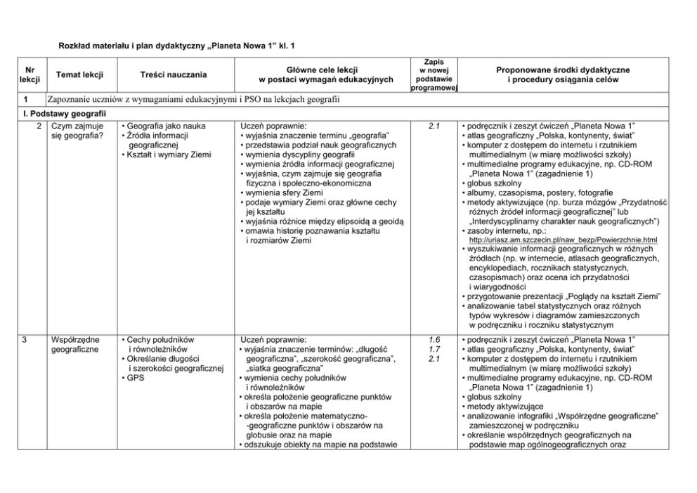 Rozkład materiału i plan dydaktyczny „Planeta Nowa 1” kl. 1 Nr lekcji 1 Temat lekcji Zapis w nowej podstawie programowej Proponowane środki dydaktyczne i procedury osiągania celów Zapoznanie uczniów z wymaganiami edukacyjnymi i PSO na lekcjach geografii I. Podstawy geografii 2 Czym zajmuje się geografia? 3 Treści nauczania Główne cele lekcji w postaci wymagań edukacyjnych Współrzędne geograficzne • Geografia jako nauka • Źródła informacji geograficznej • Kształt i wymiary Ziemi • Cechy południków i równoleżników • Określanie długości i szerokości geograficznej • GPS Uczeń poprawnie: • wyjaśnia znaczenie terminu „geografia” • przedstawia podział nauk geograficznych • wymienia dyscypliny geografii • wymienia źródła informacji geograficznej • wyjaśnia, czym zajmuje się geografia fizyczna i społeczno-ekonomiczna • wymienia sfery Ziemi • podaje wymiary Ziemi oraz główne cechy jej kształtu • wyjaśnia różnice między elipsoidą a geoidą • omawia historię poznawania kształtu i rozmiarów Ziemi 2.1 Uczeń poprawnie: • wyjaśnia znaczenie terminów: „długość geograficzna”, „szerokość geograficzna”, „siatka geograficzna” • wymienia cechy południków i równoleżników • określa położenie geograficzne punktów i obszarów na mapie • określa położenie matematyczno-geograficzne punktów i obszarów na globusie oraz na mapie • odszukuje obiekty na mapie na podstawie 1.6 1.7 2.1 • podręcznik i zeszyt ćwiczeń „Planeta Nowa 1” • atlas geograficzny „Polska, kontynenty, świat” • komputer z dostępem do internetu i rzutnikiem multimedialnym (w miarę możliwości szkoły) • multimedialne programy edukacyjne, np. CD-ROM „Planeta Nowa 1” (zagadnienie 1) • globus szkolny • albumy, czasopisma, postery, fotografie • metody aktywizujące (np. burza mózgów „Przydatność różnych źródeł informacji geograficznej” lub „Interdyscyplinarny charakter nauk geograficznych”) • zasoby internetu, np.: http://uriasz.am.szczecin.pl/naw_bezp/Powierzchnie.html • wyszukiwanie informacji geograficznych w różnych źródłach (np. w internecie, atlasach geograficznych, encyklopediach, rocznikach statystycznych, czasopismach) oraz ocena ich przydatności i wiarygodności • przygotowanie prezentacji „Poglądy na kształt Ziemi” • analizowanie tabel statystycznych oraz różnych typów wykresów i diagramów zamieszczonych w podręczniku i roczniku statystycznym • podręcznik i zeszyt ćwiczeń „Planeta Nowa 1” • atlas geograficzny „Polska, kontynenty, świat” • komputer z dostępem do internetu i rzutnikiem multimedialnym (w miarę możliwości szkoły) • multimedialne programy edukacyjne, np. CD-ROM „Planeta Nowa 1” (zagadnienie 1) • globus szkolny • metody aktywizujące • analizowanie infografiki „Współrzędne geograficzne” zamieszczonej w podręczniku • określanie współrzędnych geograficznych na podstawie map ogólnogeograficznych oraz podanych współrzędnych geograficznych • podaje zasady działania oraz możliwości wykorzystania odbiornika GPS • oblicza odległość (rozciągłość) między dwoma punktami na mapie 4 5 samouczka zamieszczonego w podręczniku • obliczanie odległości (rozciągłości) między dwoma punktami na mapie, korzystając z zależności 1° = 111,2 km • zajęcia terenowe z wykorzystaniem odbiornika GPS Mapa i jej skala • Elementy mapy • Skala mapy • Przekształcanie skali • Obliczanie odległości na mapie Uczeń poprawnie: • wyjaśnia znaczenie terminów: „skala”, „siatka kartograficzna” • wymienia rodzaje skal i ich przykłady • wymienia elementy mapy • wyjaśnia różnice między siatką kartograficzną a geograficzną • podaje różnice między planem a mapą • posługuje się skalą mapy do obliczania odległości w terenie i na mapie • oblicza skalę mapy, znając odległość rzeczywistą między obiektami przedstawionymi na mapie • posługuje się w terenie mapą topograficzną i planem miasta 1.1 1.4 1.5 1.7 1.8 • podręcznik i zeszyt ćwiczeń „Planeta Nowa 1” • atlas geograficzny „Polska, kontynenty, świat” • komputer z dostępem do internetu i rzutnikiem multimedialnym (w miarę możliwości szkoły) • multimedialne programy edukacyjne, np. CD-ROM „Planeta Nowa 1” (zagadnienie 1) • zestaw map ściennych, mapy topograficzne • metody aktywizujące • ćwiczenia w przeliczaniu skali oraz obliczaniu odległości na mapie i w terenie na podstawie samouczka zamieszczonego w podręczniku • analizowanie treści map wykonanych w różnych skalach • identyfikowanie obiektów na planie, mapie i zdjęciach, np. satelitarnych Rodzaje map. Generalizacja • Podział map • Generalizacja • Plan • dokonuje podziału map ze względu na ich skalę oraz treść •wyjaśnia znaczenie terminu „generalizacja mapy” • wyjaśnia, na czym polega generalizacja mapy oraz uzasadnia jej przydatność • wyjaśnia różnice między mapą i planem • posługuje się planem miasta 1.1 1.4 1.5 1.7 1.8 • podręcznik i zeszyt ćwiczeń „Planeta Nowa 1” • atlas geograficzny „Polska, kontynenty, świat” • komputer z dostępem do internetu i rzutnikiem multimedialnym (w miarę możliwości szkoły) • multimedialne programy edukacyjne, np. CD-ROM „Planeta Nowa 1” (zagadnienie 1) • zestaw map ściennych, mapy topograficzne, plany miast • metody aktywizujące • analiza schematu „Generalizacja” zamieszczonej w podręczniku • analiza porównawcza fragmentów map zamieszczonych w podręczniku • analizowanie treści planu centrum Krakowa zamieszczonego w podręczniku 8 6 Przedstawianie zjawisk na mapach • Metody przedstawiania zjawisk na mapach • Wysokość względna 7 Czytamy mapę • Praca z mapą • Orientowanie mapy • Mapy samochodowe i turystyczne Uczeń poprawnie: • wyjaśnia znaczenie terminów