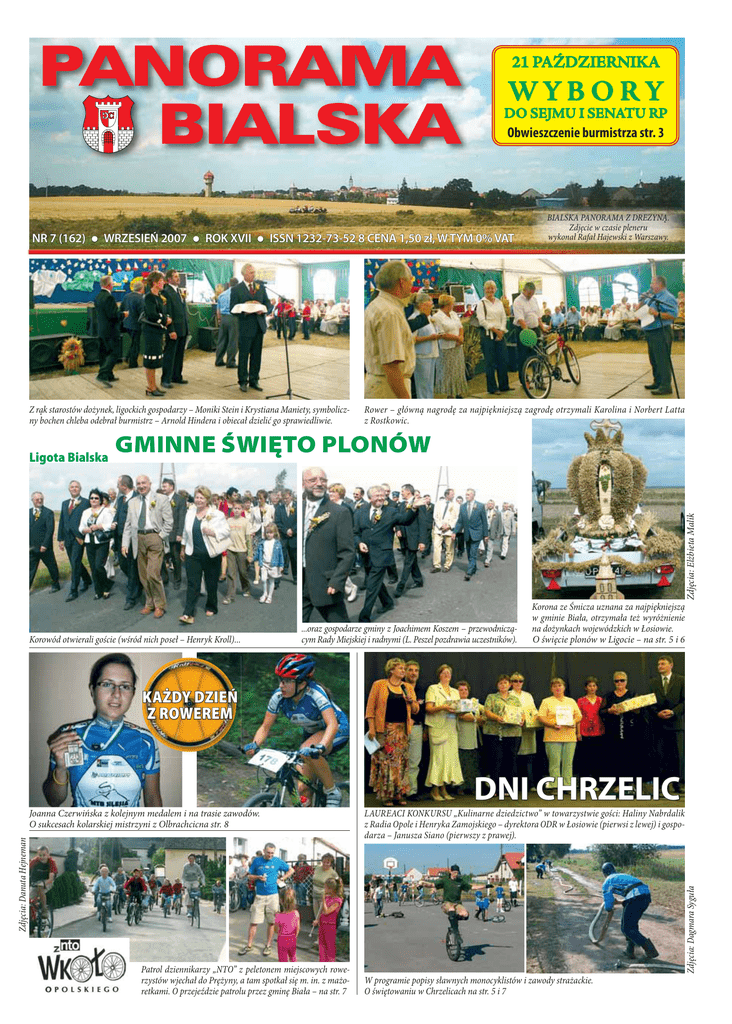 PANORAMA BIALSKA NR 7 (162) G WRZESIEŃ 2007 G ROK XVII G WYB O RY DO SEJMU I SENATU RP Obwieszczenie burmistrza str. 3 ISSN 1232-73-52 8 CENA 1,50 zł, W TYM 0% VAT Z rąk starostów dożynek, ligockich gospodarzy – Moniki Stein i Krystiana Maniety, symboliczny bochen chleba odebrał burmistrz – Arnold Hindera i obiecał dzielić go sprawiedliwie. BIALSKA PANORAMA Z DREZYNĄ. Zdjęcie w czasie pleneru wykonał Rafał Hajewski z Warszawy. Rower – główną nagrodę za najpiękniejszą zagrodę otrzymali Karolina i Norbert Latta z Rostkowic. GMINNE ŚWIĘTO PLONÓW Zdjęcia: Elżbieta Malik Ligota Bialska 21 PAŹDZIERNIKA Korowód otwierali goście (wśród nich poseł – Henryk Kroll)... ...oraz gospodarze gminy z Joachimem Koszem – przewodniczącym Rady Miejskiej i radnymi (L. Peszel pozdrawia uczestników). Korona ze Śmicza uznana za najpiękniejszą w gminie Biała, otrzymała też wyróżnienie na dożynkach wojewódzkich w Łosiowie. O święcie plonów w Ligocie – na str. 5 i 6 KAŻDY DZIEŃ Z ROWEREM DNI CHRZELIC Patrol dziennikarzy „NTO” z peletonem miejscowych rowerzystów wjechał do Prężyny, a tam spotkał się m. in. z mażoretkami. O przejeździe patrolu przez gminę Biała – na str. 7 LAUREACI KONKURSU „Kulinarne dziedzictwo” w towarzystwie gości: Haliny Nabrdalik z Radia Opole i Henryka Zamojskiego – dyrektora ODR w Łosiowie (pierwsi z lewej) i gospodarza – Janusza Siano (pierwszy z prawej). Zdjęcia: Dagmara Syguła Zdjęcia: Danuta Hejneman Joanna Czerwińska z kolejnym medalem i na trasie zawodów. O sukcesach kolarskiej mistrzyni z Olbrachcicna str. 8 W programie popisy sławnych monocyklistów i zawody strażackie. O świętowaniu w Chrzelicach na str. 5 i 7 2 PANORAMA BIALSKA H WRZESIEŃ H 2007 ZŁOTE GODY - czyli 50 – lecie pożycia małżeńskiego świętowali ( Krystyna i Paweł KOCZULOWIE z Pogórza – 4 sierpnia ( Stefania i Stefan ZAŁĘSCY z Prężyny – 4 sierpnia ( Maria i Otto NOWOTNI z Browińca Polskiego – 15 sierpnia Erika i Günther CZELLIKOWIE z Radostyni – 15 września Jubilatom życzymy wielu jeszcze wspólnych lat w zdrowiu i radości ( Wilków – Vlčice PARTNERSKA WIZYTA W zajemne wizyty pomiędzy mieszkańcami – po podpisaniu partnerskiej umowy – stały się już tradycją. Na kolejne, sierpniowe spotkanie grupa mieszkańców Wilkowa pojechała do Vlčic, zaproszona na odpust świętego Bartłomieja. Krystyna Sobota, Rita Przywara i Rozalia Wybraniec, które uczestniczyły w wyjeździe do Czech wspominają jak tam było: - W części bardziej oficjalnej było spotkanie ze starostą i mieszkańcami wsi, również z gościną przy stołach biesiadnych. Najbardziej utkwił nam w pamięci odpustowy program artystyczny, a w nim żonglerka ognistymi kulami i dzidami przygotowana przez miejscowych Romów. Braliśmy udział w zabawie tanecznej na wolnym powietrzu, była też okazja do rozmów z przy- Tegoroczne żniwa rozpoczęły się 23 czerwca i trwały do 20 lipca, przy pięknej słonecznej pogodzie. Były to w ostatnich 20 latach najwcześniej rozpoczęte i przeprowadzone żniwa. Po łagodnej zimie, ciepłej wiośnie i słonecznym lipcu zbiory tegoroczne są rekordowe. W rejonie Białej tj. sołectw Prężyna, Józefów, Olbrachcice, Solec, Browiniec Polski, Gostomia, Rostkowice, Wilków i Krobusz plony pszenicy oscylowały w granicy 80 dt /ha, w okolicy Łączni- ka, gdzie wskaźnik bonitacji jest niższy i wynosi około 0,7 plony pszenicy były na poziomie 50 dt/ha. Podobnie przedstawiały się plony jęczmienia. Rewela- poprzednim wydaniu „Panoramy”, w relacji z sesji Rady Miejskiej wymieniając wszystkie wsie w gminie Biała, które przystąpiły do realizacji programu „Odnowa wsi” przez przeoczenie pominięte zostały Rostkowice. „A przecież Rostkowice były jedne z pierwszych” – jak powiedział sołtys – Alfred Krupa. I to prawda. W roku 1997, kiedy program „Odnowy wsi” był wprowadzany w gminie, do jego realizacji jako pierwszy zgłosił się Łącznik, a zaraz po nim Rostkowice i Gostomia, potem Prężyna i aktualnie jest już 10 wsi. Przez te lata w Rostkowicach zrobiono dużo i nie raz o tym pisaliśmy, ale chcąc znowu napisać o aktualnościach, „trzeba przyjechać i zobaczyć”. Tak twierdzi sołtys i ma rację. Tak też pewnie w jakiejś perspektywie czasowej się stanie. Na już – przepraszamy mieszkańców Rostkowic za niedopatrzenie. Redakcja PANORAMA BIALSKA Wydawca: Miejsko – Gminny Ośrodek Kultury Sportu Turystyki i Rekreacji 48 – 210 Biała, ul. Prudnicka 35 tel. / fax: / 77/ 43 87 026 e-mail: [email protected] [email protected] Redaktor naczelny: Rafał Magosz Opracowanie: Danuta Hejneman Marek Karp Druk: Drukarnia „Sady” Osiedle Sady 2 47 – 303 Krapkowice Redakcja zastrzega sobie prawo skracania nadsyłanych materiałów oraz nie odpowiada za treść ogłoszeń i reklam. (em – m) „świńską górkę”, gdyż rolnik po skalkulowaniu przychodów i rozchodów będzie wolał sprzedać zboże niż hodować trzodę chlewną, co z kolei spowoduje wzrost cen skupu trzody chlewnej. Wysokie plony przewidywane są też w uprawie ziemniaków i buraka cukrowego. Tegoroczne zbiory (te dotychczasowe i te szacowane), pozwalają stwierdzić, że jest to rok bardzo korzystny dla bialskich rolników. Oby takich lat jak najwięcej. (D.H.) ROK DOBRYCH PLONÓW cyjnie plonował rzepak. W niektórych rejonach gminy do 40 dt/ha. Rekordowe o tej porze roku są także ceny płacone przez skupujących pszenicę. Dochodzą do 800,00 zł /t. Wysokie ceny skupu zbóż zapewne zlikwidują „Odnowa wsi” Dekanalny Dzień Chorych w Białej w Rostkowicach W jaciółmi m. in. z Wandą i Karolem, którzy do dzisiaj wspominają wizytę w Wilkowie, jako „coś fantastycznego”. Pełni wrażeń i w bardzo wesołych nastrojach wróciliśmy późnym wieczorem do Polski. Niektórzy obserwatorzy polsko – czeskich kontaktów w gminie nawet z zazdrością patrzą na podejmowane w Wi