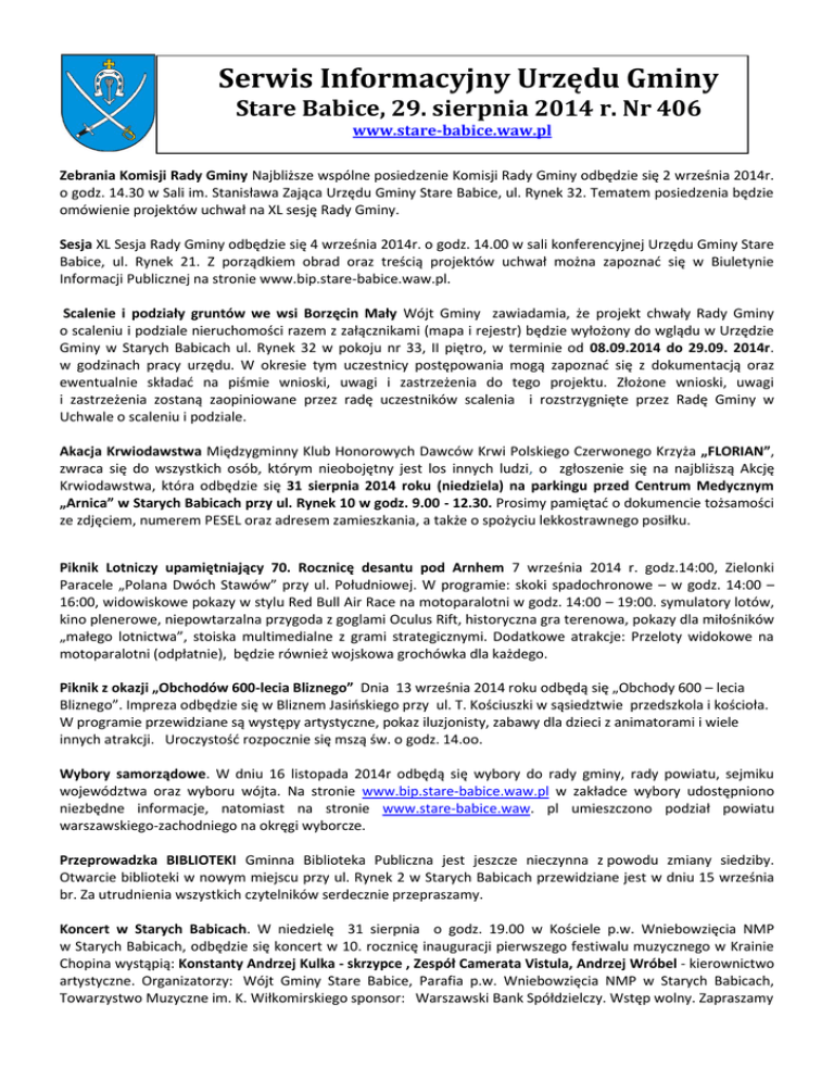 Serwis Informacyjny Urzędu Gminy Stare Babice, 29. sierpnia 2014 r. Nr 406 www.stare-babice.waw.pl Zebrania Komisji Rady Gminy Najbliższe wspólne posiedzenie Komisji Rady Gminy odbędzie się 2 września 2014r. o godz. 14.30 w Sali im. Stanisława Zająca Urzędu Gminy Stare Babice, ul. Rynek 32. Tematem posiedzenia będzie omówienie projektów uchwał na XL sesję Rady Gminy. Sesja XL Sesja Rady Gminy odbędzie się 4 września 2014r. o godz. 14.00 w sali konferencyjnej Urzędu Gminy Stare Babice, ul. Rynek 21. Z porządkiem obrad oraz treścią projektów uchwał można zapoznać się w Biuletynie Informacji Publicznej na stronie www.bip.stare-babice.waw.pl. Scalenie i podziały gruntów we wsi Borzęcin Mały Wójt Gminy zawiadamia, że projekt chwały Rady Gminy o scaleniu i podziale nieruchomości razem z załącznikami (mapa i rejestr) będzie wyłożony do wglądu w Urzędzie Gminy w Starych Babicach ul. Rynek 32 w pokoju nr 33, II piętro, w terminie od 08.09.2014 do 29.09. 2014r. w godzinach pracy urzędu. W okresie tym uczestnicy postępowania mogą zapoznać się z dokumentacją oraz ewentualnie składać na piśmie wnioski, uwagi i zastrzeżenia do tego projektu. Złożone wnioski, uwagi i zastrzeżenia zostaną zaopiniowane przez radę uczestników scalenia i rozstrzygnięte przez Radę Gminy w Uchwale o scaleniu i podziale. Akacja Krwiodawstwa Międzygminny Klub Honorowych Dawców Krwi Polskiego Czerwonego Krzyża „FLORIAN”, zwraca się do wszystkich osób, którym nieobojętny jest los innych ludzi, o zgłoszenie się na najbliższą Akcję Krwiodawstwa, która odbędzie się 31 sierpnia 2014 roku (niedziela) na parkingu przed Centrum Medycznym „Arnica” w Starych Babicach przy ul. Rynek 10 w godz. 9.00 - 12.30. Prosimy pamiętać o dokumencie tożsamości ze zdjęciem, numerem PESEL oraz adresem zamieszkania, a także o spożyciu lekkostrawnego posiłku. Piknik Lotniczy upamiętniający 70. Rocznicę desantu pod Arnhem 7 września 2014 r. godz.14:00, Zielonki Paracele „Polana Dwóch Stawów” przy ul. Południowej. W programie: skoki spadochronowe – w godz. 14:00 – 16:00, widowiskowe pokazy w stylu Red Bull Air Race na motoparalotni w godz. 14:00 – 19:00. symulatory lotów, kino plenerowe, niepowtarzalna przygoda z goglami Oculus Rift, historyczna gra terenowa, pokazy dla miłośników „małego lotnictwa”, stoiska multimedialne z grami strategicznymi. Dodatkowe atrakcje: Przeloty widokowe na motoparalotni (odpłatnie), będzie również wojskowa grochówka dla każdego. Piknik z okazji „Obchodów 600-lecia Bliznego” Dnia 13 września 2014 roku odbędą się „Obchody 600 – lecia Bliznego”. Impreza odbędzie się w Bliznem Jasińskiego przy ul. T. Kościuszki w sąsiedztwie przedszkola i kościoła. W programie przewidziane są występy artystyczne, pokaz iluzjonisty, zabawy dla dzieci z animatorami i wiele innych atrakcji. Uroczystość rozpocznie się mszą św. o godz. 14.oo. Wybory samorządowe. W dniu 16 listopada 2014r odbędą się wybory do rady gminy, rady powiatu, sejmiku województwa oraz wyboru wójta. Na stronie www.bip.stare-babice.waw.pl w zakładce wybory udostępniono niezbędne informacje, natomiast na stronie www.stare-babice.waw. pl umieszczono podział powiatu warszawskiego-zachodniego na okręgi wyborcze. Przeprowadzka BIBLIOTEKI Gminna Biblioteka Publiczna jest jeszcze nieczynna z powodu zmiany siedziby. Otwarcie biblioteki w nowym miejscu przy ul. Rynek 2 w Starych Babicach przewidziane jest w dniu 15 września br. Za utrudnienia wszystkich czytelników serdecznie przepraszamy. Koncert w Starych Babicach. W niedzielę 31 sierpnia o godz. 19.00 w Kościele p.w. Wniebowzięcia NMP w Starych Babicach, odbędzie się koncert w 10. rocznicę inauguracji pierwszego festiwalu muzycznego w Krainie Chopina wystąpią: Konstanty Andrzej Kulka - skrzypce , Zespół Camerata Vistula, Andrzej Wróbel - kierownictwo artystyczne. Organizatorzy: Wójt Gminy Stare Babice, Parafia p.w. Wniebowzięcia NMP w Starych Babicach, Towarzystwo Muzyczne im. K. Wiłkomirskiego sponsor: Warszawski Bank Spółdzielczy. Wstęp wolny. Zapraszamy