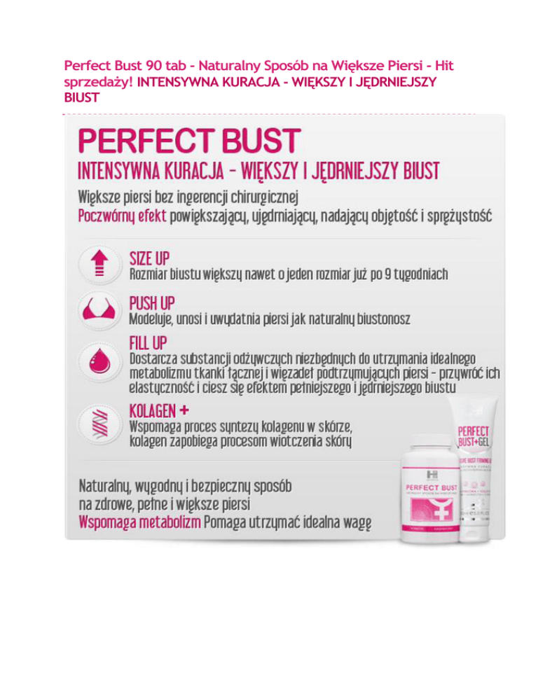 Perfect Bust 90 tab - Naturalny Sposób na Większe Piersi - Hit sprzedaży! INTENSYWNA KURACJA - WIĘKSZY I JĘDRNIEJSZY BIUST Perfect Bust ziołowa formuła dla Twoich piersi Perfect Bust to naturalny, innowacyjny i wyjątkowo efektywny program suplementacji pomagający ujędrniać, modelować i powiększać biust. Stworzony z myślą o kobietach, dbających o pełny kształt i jędrność swoich piersi. Szczególnie polecany dla skóry pozbawionej elastyczności, po okresie ciąży i kuracji odchudzającej oraz przy pierwszych oznakach wiotczenia skóry. Receptura Perfect Bust to połączenie tradycyjnej wiedzy botanicznej z najnowszymi odkryciami kosmetologii, dietetyki i fizjologii człowieka. Dzięki rewelacyjnej ziołowej recepturze, Perfect Bust pomaga ujędrnić i podnieść biust oraz poprawić wygląd skóry i dekoltu. DOWIEDZ SIĘ WIĘCEJ Perfect Bust przyczynia się do stymulacji wzrostu tkanek biustu, dzięki czemu jest pełniejszy, piękniejszy i bardziej sprężysty. Działają wzmacniająco i nawilżająco na skórę. Dostarczają substancji odżywczych koniecznych do utrzymania idealnego metabolizmu tkanki łącznej i więzadeł podtrzymujących piersi, co przywraca ich elastyczność i daje efekt pełniejszego i jędrniejszego biustu. Naturalnie wspomagają proces syntezy kolagenu w skórze, co pomaga w zapobieganiu procesom jej wiotczenia i utraty elastyczności. Perfect Bust uzupełnia również niedobory ważnych składników odżywczych w diecie, działając kompleksowo na cały organizm. Dzięki opartej na wyciągach ziołowych formule jest silny i skuteczny w działaniu, ale zarazem łagodny dla organizmu. To bezpieczny i sprawdzony klinicznie suplement diety zawierający najskuteczniejsze ekstrakty roślinne. Głównymi składnikami suplementu są ekstrakty z kopru włoskiego, jagód palmy sabalowej i nasion kozieradki lekarskiej, korzenia dzięgla chińskiego, drapacza lekarskiego i owoców pieprzowca zwierające znaczną ilości całkowicie naturalnych substancji roślinnych, między innymi fitoestrogenów, witamin, olejków eterycznych. Aktywne związki roślinne zawarte w Perfect Bust: wspomagają proces gromadzenia lipidów w adipocytach wpływają korzystnie na elastyczność i napięcie skóry wspomagają procesy syntezy kolagenu w skórze, co pomaga w zapobieganiu procesom jej wiotczenia dzięki naturalnie występującym antyoksydantom wzmacniają ochronę przed wolnymi rodnikami odpowiedzialnymi za proces starzenia głęboko odżywiają i wzmacniają skórę piersi intensywnie nawilżają ujędrniają i wygładzają naskórek Dla kogo jest Perfect Bust? Stworzyliśmy Perfect Bust z myślą o wszystkich kobietach. Jednak szczególnie polecamy jego stosowanie jeśli: dbasz o swoją urodę odchudzasz się chciałabyś dodać swym piersiom jędrności uważasz że Twoje piersi powinny być większe, pełniejsze i bardziej kształtne skóra Twojego dekoltu jest sucha i zmęczona twój biust stał się obwisły w wyniku ciąży lub wieku często czujesz się zmęczona i osłabiona, żyjesz w stresie odżywiasz się nieregularnie stosujesz dietę ubogą w substancje mineralne Powiększanie piersi bez operacji! Jeśli nie jesteś zadowolona ze swoich naturalnych kształtów, to pewnością myślałaś kiedyś o ewentualnej operacji plastycznej. W prasie i w telewizji dużo się o tym mówi, jednak nikt nie wspomina o konsekwencjach takiej drogi powiększenia biustu. Jak każdy zabieg chirurgiczny pozostawia blizny, a efekt często nie jest trwały. Po jakimś czasie silikonowe wkładki trzeba wymienić na nowe, więc decydując się na zabieg musisz się liczyć z tym, że to nie będzie ostatnia kosztowna operacja w Twoim życiu. W dodatku co jakiś czas słyszy się że komponenty używane przy wykonywaniu zabiegów powiększania piersi nie są bezpieczne. Niosą ryzyko raka piersi lub innych powikłań. Wiele kobiet po przeprowadzeniu zabiegu powiększania piersi narzeka na komplikacje z tym związane (takie jak: zapalenia sutka, nie gojące się blizny, pęknięcie torebeczki silikonowej, powikłania pooperacyjne). Zamiast ryzykować warto spróbować alternatywnych metod, które mogą przynieść zdecydowanie lepsze i trwalsze efekty. Zaawansowana pielęgnacja Perfect Bust Aktywne składniki roślinne, pieczołowicie dobrane formuły, kosmetyka wspierająca kobiecość to prawdziwa sztuka. Rezultat naszych długoletnich doświadczeń i nieustających poszukiwań najskuteczniejszych rozwiązań. Badania terenowe, odtwarzanie i pogłębianie wiedzy etnobotanicznej, nadzór upraw i zbiorów – właściwa pielęgnacja biustu wymaga zarówno doskonałej jakości, jak i dogłębnej znajomości stosowanych składników. Efekt zależy często do najmniejszych detali, dlatego przygotowanie naszych produktów cechuje niezwykła staranność. Właśnie dlatego możemy zaproponować produkty o niezwykłej jakości i w przystępnej cenie. Zgodnie z naszą podstawową misją: pomocy kobietom. Jesteśmy by was wspierać, żebyście czuły się piękniejsze. Aktywne związki roślinne zawarte w Perfekt Bust: Powiększa i ujędrnia piersi, stymulując wzrost komórek w gruczołach sutkowych Zmniejsza tendencję do opadania biustu, poprzez utrzymywanie odpowiedniego stosunku tkanki gruczołowej do tłuszczowej w organizmie Nawilża i uelastycznia skórę, powoduje, że skóra jest odpowiednio napięta na całej powierzchni ciała, utrzymując odpowiednią ilość i usieciowanie włókien elastynowych Odżywia, regeneruje i chroni wszystkie warstwy skóry, także te, do których nie docierają żadne kremy Opóźniają proces starzenia się skóry, powstawanie zmarszczek i przebarwień Łagodzą trądzik, wypryski i niedoskonałości skóry Wspomaga usuwanie toksyny z organizmu, dzięki dużej zawartości roślinnych antyoksydantów Pobudzają mikrocyrkulację w komórkach skóry co poprawia jej wygląd dając efekt rozświetlenia Stanowią zastrzyk energii znoszą uczucie 