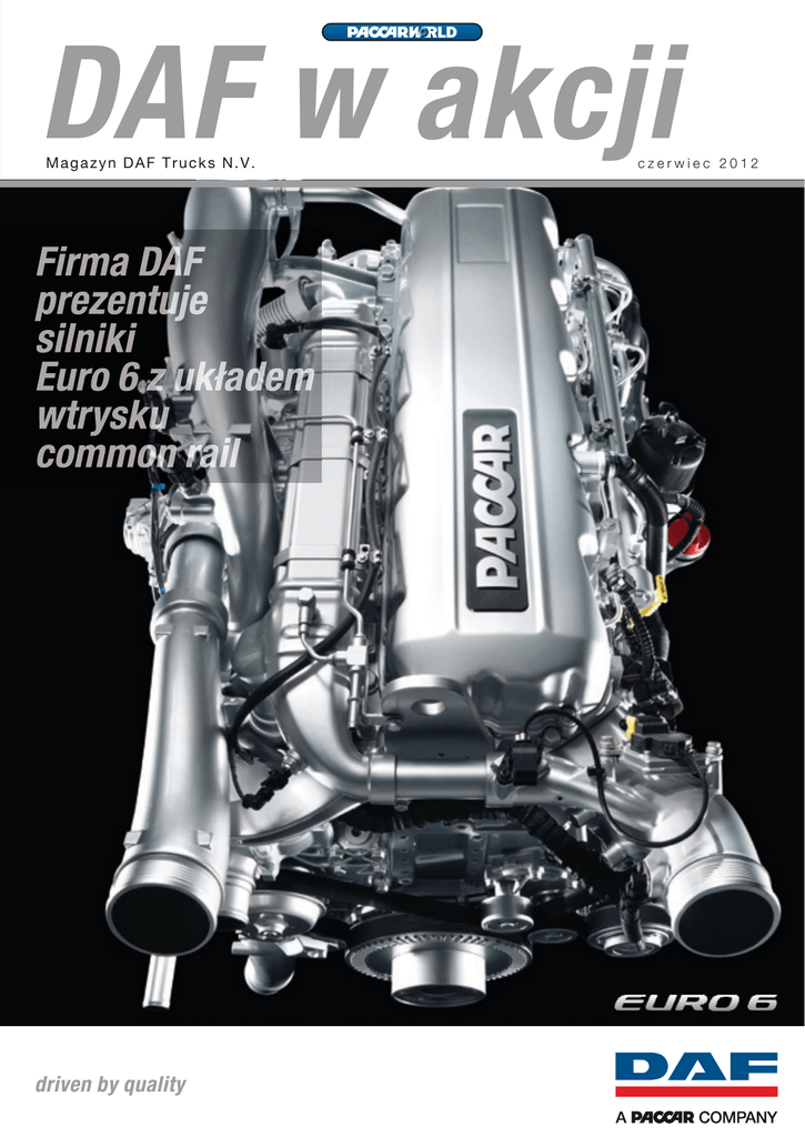 DAF w akcji Magazyn DAF Trucks N.V. driven by quality czerwiec 2012 R>8m^\agheh`r8¨88 ma^8bgm^eeb`^gm8\ahb\^ 9nmhfZmb\Zeer8^_y\b^gm8pbma88 9K¦Lkhgb\8¸8AgmZk]^k8hg8[hZk] ppps_\hf >gj8dgf_¤\aklYf[]8ljYfkhgjl8\akljaZmlagf8ljY^x[8gj8kh][aYd8n]`a[d]k8¦8ljm[ck8\jan]8Y`]Y\8g^8l`]8hY[c8oal`8 l`]8Fµ8}8YmlgeYla[8ljYfkeakkagf8L`]8<9>89K¤Ljgfa[8¶8AflYj\]j8YmlgeYla[Yddq8eYc]8ljm[ck8egj]8]^x[a]fl8 dgo]jaf_8[gklk8^gj8^m]d8Yf\8k]jna[]8<9>89K¤Ljgfa[8¶8AflYj\]j89mlgeYla[Yddq8Fµ8} <kbo^ebg^8Zg]8;aZllbl8L^\agheh`r DAF w akcji „DAF w akcji” jest publikacją DAF Trucks N.V. w tym wydaniu DAF i Euro 6 4. 6. 10. 12. 14. 16. 18. 20. 22. 24. 27. Aktualności DAF. Stworzone, by chronić środowisko naturalne i zapewnić maksymalną wydajność: Firma DAF prezentuje silniki Euro 6 z układem wtrysku common rail. Firma DAF na wystawie BedrijfsautoRAI 2012: Program ATe w centrum uwagi. Lider w dziedzinie technologii silników od 55 lat. Silnik PACCAR MX sukcesem w Ameryce Północnej. Jan de Rijk Logistics: „ATe spełnia pokładane w nim nadzieje!.” DAF ATe: Pozytywna reakcja rynku. Pojazdy EcoCombi – szeroko omawiane, lecz nadal za mało eksploatowane. Znaczne zaległości w wymaganych dyrektywą, 35-godzinnych szkoleniach zawodowych: Kierowcy nie są dostatecznie wyszkoleni. PACCAR Parts Europe:„Liczy się maksymalne wykorzystanie pojazdu.” Firma DAF uruchomiła specjalną stronę internetową dla producentów zabudów. W tym wydaniu magazynu „DAF w akcji” z dumą prezentujemy nasz nowy silnik PACCAR MX-13 zgodny z normą Euro 6, dotyczącą emisji spalin, która będzie obowiązywać w Unii Europejskiej od 1 stycznia 2014 roku. Nowe przepisy wymagają zmniejszenia ilości wydzielanych cząstek sadzy o 66% w stosunku do obecnie obowiązującego rygorystycznego standardu Euro 5, a tlenków azotu – aż o 77%. Poziom emisji w przypadku ciężarówek wyposażonych w silniki wysokoprężne Euro 6 zbliża się do zera. W związku z tym w nadchodzących latach będzie kładziony jeszcze większy nacisk na zmniejszenie ilości wydzielanego CO2. Jest to ważne nie tylko ze względu na globalne ocieplenie, lecz także z powodu ograniczonej ilości złóż paliw kopalnych. Ostatecznie emisja CO2 bezpośrednio wiąże się ze zużyciem paliwa. Dalsza redukcja zużycia paliwa i – co za tym idzie – wydzielanego CO2 to nasze wspólne zadanie. Należy to do obowiązków władz Unii Europejskiej, które mogą osiągnąć ten cel na przykład przez stworzenie lepszej, bardziej płynnej infrastruktury i zapewnienie szerszego zakresu zastosowania pojazdów EcoCombi. Zmniejszenie zużycia paliwa i emisji CO2 leży także w interesie przedsiębiorców, którzy powinni inwestować w bardziej wydajne pojazdy, wyposażone w odpowiednie spojlery, dbać o właściwe ciśnienie w oponach i organizować dla swoich kierowców szkolenia z zakresu ekonomicznej jazdy. Redukcja ilości zużywanego paliwa i wydzielanego CO2 to także zadanie dla całej branży – dlatego firma DAF wprowadza istotne innowacje do silników PACCAR MX o pojemności 12,9 litrów w ramach programu Advanced Transport Efficiency. Reakcje na te zmiany na rynkach w całej Europie okazały się wyjątkowo pozytywne. Pracujemy także nad połączeniem technologii ATe z Euro 6. Ponadto wykorzystujemy technologie, w zakresie których zdobyliśmy już bogate doświadczenie podczas pracy w Stanach Zjednoczonych z naszymi siostrzanymi markami: Kenworth i Peterbilt. Opracowujemy także nowe rozwiązania, które są bardzo dokładnie testowane – zgodnie z tradycją firmy DAF. Firma DAF nigdy nie dążyła do tego, by być pierwszym przedsiębiorstwem na rynku, które wprowadzi pojazdy Euro 6, zwłaszcza że zapotrzebowanie na nie jest wciąż niewielkie. Dlatego wykorzystaliśmy ten czas na opracowanie jak najlepszego sposobu wdrożenia rozwiązań zgodnych z normą Euro 6, by zapewnić maksymalną wydajność, ochronę środowiska i niezawodność, a także optymalne zużycie paliwa. Zgodnie z oczekiwaniami naszych klientów. Harrie Schippers, Dyrektor generalny 3 D A F W A K C J I Firma PACCAR rozpoczyna budowę fabryki DAF w Brazylii 9 stycznia 2012 r. firma PACCAR zorganizowała ceremonię rozpoczęcia budowy nowego zakładu montażowego DAF w Ponta Grossa w Brazylii. Poprowadzili ją Mark Pigott, prezes i dyrektor generalny firmy PACCAR, oraz gubernator stanu Paraná, Beto Richa, a udział wzięli w niej przedstawiciele władz państwowych i lokalnych, partnerzy strategiczni, przedstawiciele głównych firm transportowych, a także osobistości ze świata biznesu i nauki. Harrie Schippers prezesem sekcji pojazdów użytkowych stowarzyszenia ACEA Harrie Schippers, prezes firmy DAF Trucks NV, został mianowany prezesem sekcji pojazdów użytkowych Stowarzyszenia Producentów Pojazdów (ang. Automobile Manufacturers Association, ACEA) w 2012 roku. Co roku wybierany jest nowy prezes organizacji ACEA. Nowy zakład montażowy DAF jest ważnym strategicznie osiągnięciem firmy PACCAR. Wart 200 mln dolarów ośrodek będzie mieścił zakład montażowy o powierzchni 37 870 metrów kwadratowych w mieście Ponta Grossa w stanie Paraná. Budowa rozpocznie się już wkrótce, a jej ukończenie jest planowane na rok 2013. Będą tam montowane pojazdy DAF serii XF, CF i LF, a także wiodące w branży silniki napędowe, PACCAR MX. Zakład będzie produkował ciężarówki marki DAF przeznaczone na rynek Brazylii i całej Ameryki Łacińskiej. Pojazdy ciężarowe marki DAF będą rozprowadzane za pośrednictwem sieci niezależnie działających dealerów DAF. „Rok 2012 będzie wymagający ze względu na niepewną sytuację gospodarczą na najważniejszych rynkach świata, a w szczególności w Europie. Bardzo ważne jest przywrócenie wiary w strefę euro” – wyjaśnia Schippers. „Europejski przemysł pojazdów użytkowych usiłuje utrzymać czołową pozycję w dziedzinie bezpieczeństwa i technologii ekologicznych. Dzięki temu będziemy mogli nad