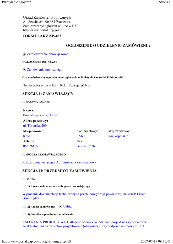 Przesyłanie ogłoszeń Strona 1 Urząd Zamówień Publicznych Al. Szucha 2/4; 00-582 Warszawa Zamieszczanie ogłoszeń on-line w BZP: http://www.portal.uzp.gov.pl FORMULARZ ZP-403 OGŁOSZENIE O UDZIELENIU ZAMÓWIENIA Zamieszczanie obowiązkowe OGŁOSZENIE DOTYCZY: Zamówienia publicznego Czy zamówienie było przedmiotem ogłoszenia w Biuletynie Zamówień Publicznych? Numer ogłoszenia w BZP: Rok Pozycja Nie SEKCJA I: ZAMAWIAJĄCY I.1) NAZWA I ADRES Nazwa: Powiatowy Zarząd Dróg Adres pocztowy: ul. Toruńska 200 Kod pocztowy: 62-600 Fax: 063 2610576 Miejscowość: Koło Telefon: 063 2610576 Województwo: wielkopolskie I.2) RODZAJ ZAMAWIAJĄCEGO Rodzaj zamawiającego: Administracja samorządowa SEKCJA II: PRZEDMIOT ZAMÓWIENIA II.1) OPIS II.1.1) Nazwa nadana zamówieniu przez zamawiającego Wykonanie dokumentacji technicznej na przebudowę drogi powiatowej nr 3416P LisiceGoszczędza II.1.2) Rodzaj zamówienia: Usługi II.1.3) Określenie przedmiotu zamówienia ZAŁOśENIA PROJEKTOWE:1. długość odcinka ok. 500 m2. projekt naleŜy opracować na aktualnej mapie do celów projektowych (otrzymanej przy podpisaniu umowy z PZD http://www.portal.uzp.gov.pl/cgi-bin/mgrqispi.dll 2007-07-19 09:31:47 Przesyłanie ogłoszeń Strona 2 Koło) w skali 1:1000 3.zjazdy tłuczniowe, szerokość jezdni 4 m, szerokość poboczy 1,0m, niezbędne elementy odwodnienia- przepusty),4.ścinka, uzupełnienie i plantowanie poboczy gruntowych,5.profilowanie i wyrównanie istniejącej nawierzchni ,6.podbudowa z klińca drogowego grubości 15 cm, na odcinkach posiadających podbudowę oraz 15cm + 8 cm na poszerzeniach)7.warstwa wiąŜąca z mieszanek mineralno - asfaltowych (0/12,8 mm) standard II grubości 4 cm, 8.skropienie warstw konstrukcyjnych nawierzchni emulsja asfaltową szybkorozpadową w ilości 0,5 kg/m2,9.warstwa ścieralna z mieszanek mineralno - asfaltowych st. II grubości 4 cm (0-12,8 mm),10. ścinka, uzupełnienie i plantowanie poboczy gruntowych,11.załoŜenia niewymienione, a wynikające z potrzeby realizacji oraz zmiany niniejszych załoŜeń naleŜy uzgodnić z PZD i ująć w dokumentacji II.1.4) WSPÓLNY SŁOWNIK ZAMÓWIEŃ (CPV) Glówny przedmiot Dodatkowe przedmioty Słownik główny 74.23.20.00-4 II.1.5) Całkowita końcowa wartość zamówienia (bez VAT) obejmująca wszystkie zamówienia i części Wartość 5000.00 Waluta PLN SEKCJA IV: PROCEDURA IV.1) TRYB UDZIELENIA ZAMÓWIENIA Zapytanie o cenę IV.2) INFORMACJE ADMINISTRACYJNE Zamówienie dotyczy projektu/programu finansowanego ze środków Unii Europejskiej Nie SEKCJA V: UDZIELENIE ZAMÓWIENIA CZĘŚĆ Nr: NAZWA 18/07/2007 V.1) DATA UDZIELENIA ZAMÓWIENIA: V.2) LICZBA OTRZYMANYCH OFERT: 2 V.3) NAZWA I ADRES WYKONAWCY, KTÓREMU UDZIELONO ZAMÓWIENIA Nazwa: Zakład Usługowy PRONAD Projektowanie,Nadzór,Konsulting,Organizacja Ruchu i Zarządzanie w Zakresie Dróg i Obiektów Mostowych Anna Sobczak Adres pocztowy: Borki 47G http://www.portal.uzp.gov.pl/cgi-bin/mgrqispi.dll 2007-07-19 09:31:47 Przesyłanie ogłoszeń Strona 3 Miejscowość: Kod pocztowy: Koło 62-600 Kraj/ województwo: wielkopolskie V.4) INFORMACJA O CENIE WYBRANEJ OFERTY ORAZ O NIE PODLEGAJĄCYCH ODRZUCENIU OFERTACH Z NAJNIśSZĄ I NAJWYśSZĄ CENĄ (bez VAT) Cena wybranej oferty: 5000 Oferta z najniŜszą ceną: 5000 / Oferta z najwyŜszą ceną: 10200 Waluta: PLN Publikacja ogłoszenia Korekta ogłoszenia http://www.portal.uzp.gov.pl/cgi-bin/mgrqispi.dll Przerwanie sesji Wydruk strony 2007-07-19 09:31:47