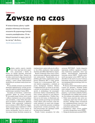 Courier-MTA BIZNES Listonosz Zawsze na czas W świecie biznesu płynny i szybki przepływ informacji ma kluczowe znaczenie dla poprawnego funkcjonowania przedsiębiorstwa. W niektórych branżach to wręcz „być albo nie być” dla firmy. www.photocase.de PIOTR BARANOWSKI P odania, analizy, raporty, wnioski, noty i inne tego typu twory papierowe, przenoszone z biurka na biurko czy między piętrami, skutecznie spowalniają działanie firmy. Okazuje się, że jedna z pierwszych usług internetowych – poczta elektroniczna – idealnie potrafi je zastąpić, a nawet oferuje funkcjonalność niemożliwą do uzyskania tradycyjnymi metodami. W tym artykule postaram się przedstawić doskonałą implementację systemu pocztowego dla małych/średnich przedsiębiorstw, zrealizowaną w projekcie Courier-MTA. Zacznijmy od określenia, z jakich komponentów składa się system pocztowy. W tym modelu mamy klienta, który wysyła i odbiera wiadomości oraz serwer pełniący rolę pośrednika, a także bufora dla wiadomości wysyłanych i odbieranych. Aplikacja kliencka, którą generujemy wiadomości oraz je czytamy, to MUA (Mail User Agent). Serwer transportujący wiadomości to MTA (Mail Transfer Agent). Często stosuje się jeszcze mechanizmy, które po stronie serwera mają wykonać określone czynności na 50 wiadomościach, zanim trafią one do odbiorcy. Są to filtry, analizatory i inne narzędzia określane jako MDA (Mail Delivery Agent). Rozwój środowiska Open Source spowodował powstanie kilkunastu implementacji tych podsystemów. Paradoksalnie jest to problem, gdyż każda z implementacji interpretuje dokumenty RFC w różny sposób. Czasem jest to niezrozumienie RFC, czasem lenistwo programisty, a niekiedy po prostu ideologiczne fanaberie. Różnice w implementacjach są czasem na tyle duże, a projekt jest prowadzony w tak skostniały sposób, że niedziałające lub niezaimplementowane funkcje uniemożliwiają wdrożenie systemu opartego na tych podsystemach w przedsiębiorstwie. Problem klocków jest na tyle ważny, że zbudowanie jednolitego systemu pocztowego jest niezwykle trudne. Różne cykle rozwojowe, różne łańcuchy zależności, czy nawet inne wymagania wobec środowiska poważnie utrudniają przygotowanie systemu pocztowego, zarazem nowoczesnego, jak i zgodnego z możliwie dużą ilością standardów. Projekt Courier początkowo był tylko Październik 2004 www.linux-magazine.pl serwerem POP/IMAP – bardzo elegancko napisanym, szybkim i zgodnym ze znakomitą większością standardów. Autor tego pakietu, zniecierpliwiony ślamazarnym rozwojem serwera SMTP – Postfix, postanowił sam napisać serwer SMTP. Sam Varshavchik, bo tak nazywa się autor Couriera, kontynuuje swoją pracę nad pełnym pakietem oprogramowania pocztowego, które stanowi spójną całość. W obecnej chwili funkcjonalność pakietu Courier jest ogromna i obejmuje bardzo wiele rodzajów usług. Na uwagę zasługuje fakt, iż całość pisana jest przez jednego programistę, co gwarantuje jednolitą budowę, styl kodowania oraz stabilną linię rozwojową. Oto wybrane cechy pakietu courier-mta: 1. Pakiet może pracować jako serwer pośredniczący (mail relay) lub jako serwer docelowy. Obsługa domen wirtualnych jest zaimplementowana wzorcowo i nie stwierdzono górnego limitu obsługiwanych domen jednocześnie. 2. Konfiguracja całego serwera możliwa jest przez zintegrowany serwer WWW. 3. Dostęp do skrzynek przez protokół POP3. Courier-MTA 4. Dostęp do skrzynek przez protokół IMAP4. 5. Dostęp do skrzynek przez protokół HTTP. 6. Dostęp przez http oferuje usługi osobistego oraz grupowego kalendarza. 7. Wykorzystywanie najszybszego i najbezpieczniejszego formatu skrzynki – Maildir. 8. Pełna obsługa rozszerzeń protokołu ESMTP, takich jak DSN, PIPELINING oraz 8BITMIME. 9. Rozszerzenie szyfrowania transmisji STARTTLS dla sesji serwer serwer oraz serwer klient. 10.Weryfikacja połączeń serwer serwer w oparciu o certyfikaty X.509. 11.Obsługa SSL dla wszystkich typów połączeń klienckich. 12.Obsługa IPv6. 13.Brama między serwisem pocztowym a faksem. Możliwe jest wysyłanie faksów bezpośrednio z klienta pocztowego. 14.Zintegrowany menedżer list dyskusyjnych. W pełni zarządzany przez e-mail. 15.Budowa modułowa – pojedyncze elementy pakietu mogą zostać wymienione na zamienniki z innych projektów. 16.Wsparcie dla protokołu aplikacyjnego Proxy SOCKS5. 17.Obsługa wielu mechanizmów autentykacyjnych m.in.: PAM, LDAP, Active Directory, MySQL, PostgreSQL. Dzięki użyciu PAM możliwe jest wykorzystanie jeszcze innych mechanizmów. 18.Pełna obsługa wszystkich typów autentykowanego SMTP. 19.Obsługa czarnych list, zawierających adresy ip oraz nazwy domenowe. 20.Wbudowany mechanizm filtrowania przesyłek przed/po dostarczeniem. 21.Liczne opcje dostrajania wydajności oraz limitów systemu pocztowego (maildir quora, concurrent delivery, max message size, max recipients i wiele innych). Jak widać, lista jest bardzo bogata, a są to tylko najbardziej widoczne cechy. System posiada czytelne i napisane w przejrzysty sposób pliki konfiguracyjne. Koszmar m4 nie jest znany administratorom Couriera. Instalacja jest prosta, a dzięki wykorzystaniu mechanizmów alternatives przeszczep systemu pocztowego nie jest wycieczką w jedną stronę. Wydajność jest zaskakująca. Przykładowy system, z którego korzysta autor artyku- BIZNES łu, posiada 600 kont pocztowych, kilkanaście list dyskusyjnych po około 400 klientów w trybie online. Przepływ wiadomości to około 12000 na dobę, przy średniej wielkości wiadomości 275 Kb. System nie rejestruje wzrostów obciążenia, co jest wynikiem automatycznego rozkładania obciążenia kolejki. Czas dotarcia wiadomości do sieci biurowej wynosi około 2 sekund, wliczając w to skanowanie antywirusowe oraz automatyczne filtrowanie spamu. Być może qmail jest szybszy, Postfix popularniejszy, a sendmail... No cóż – sendmaila uczcijmy