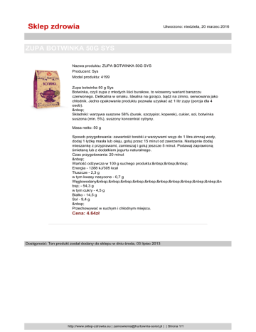 Sklep zdrowia Utworzono: niedziela, 20 marzec 2016 ZUPA BOTWINKA 50G SYS Nazwa produktu: ZUPA BOTWINKA 50G SYS Producent: Sys Model produktu: 4199 Zupa botwinka 50 g Sys Botwinka, czyli zupa z młodych liści burakow, to wiosenny wariant barszczu czerwonego. Delikatna w smaku. Idealna na gorąco, bądź na zimno, serwowana jako chłodnik. Jedno opakowanie produktu pozwala uzyskać aż 1 litr zupy (porcja dla 4 osob). Składniki: warzywa suszone 58% (burak, szczypior, koperek), cukier, sol, botwinka suszona (min. 5%), suszony koncentrat cytryny. Masa netto: 50 g Sposob przygotowania: zawartość torebki z warzywami wsyp do 1 litra zimnej wody, dodaj 1 łyżkę masła lub oleju, gotuj przez 15 minut od zawrzenia. Następnie dodaj mieszankę z przyprawami, zamieszaj i gotuj jeszcze 5 minut. Podawaj zaprawioną śmietaną lub z dodatkiem jogurtu naturalnego. Czas przygotowania: 20 minut Wartość odżywcza w 100 g suchego produktu: Energia - 1288 kJ/305 kcal Tłuszcze - 2,3 g w tym kwasy nasycone - 0,7 g Węglowodany &n bsp; - 54,3 g w tym cukry - 4,5 g Białko - 14,5 g Sol - 9,4 g Przechowywać w suchym i chłodnym miejscu. Cena: 4.64zł Dostępność: Ten produkt został dodany do sklepu w dniu środa, 03 lipiec 2013 http://www.sklep-zdrowia.eu | [email protected] | | Strona 1/1