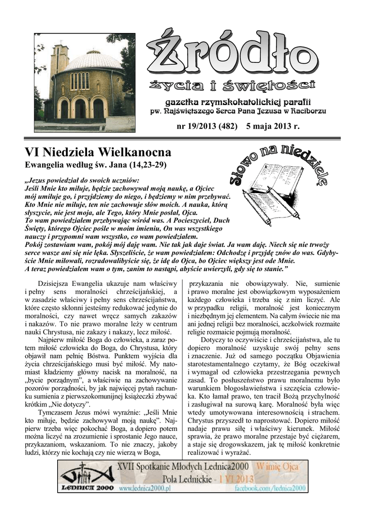 gazetka rzymskokatolickiej parafii pw. Najświętszego Serca Pana Jezusa w Raciborzu nr 19/2013 (482) 5 maja 2013 r. VI Niedziela Wielkanocna Ewangelia według św. Jana (14,23-29) „Jezus powiedział do swoich uczniów: Jeśli Mnie kto miłuje, będzie zachowywał moją naukę, a Ojciec mój umiłuje go, i przyjdziemy do niego, i będziemy w nim przebywać. Kto Mnie nie miłuje, ten nie zachowuje słów moich. A nauka, którą słyszycie, nie jest moja, ale Tego, który Mnie posłał, Ojca. To wam powiedziałem przebywając wśród was. A Pocieszyciel, Duch Święty, którego Ojciec pośle w moim imieniu, On was wszystkiego nauczy i przypomni wam wszystko, co wam powiedziałem. Pokój zostawiam wam, pokój mój daję wam. Nie tak jak daje świat. Ja wam daję. Niech się nie trwoŜy serce wasze ani się nie lęka. Słyszeliście, Ŝe wam powiedziałem: Odchodzę i przyjdę znów do was. Gdybyście Mnie miłowali, rozradowalibyście się, Ŝe idę do Ojca, bo Ojciec większy jest ode Mnie. A teraz powiedziałem wam o tym, zanim to nastąpi, abyście uwierzyli, gdy się to stanie.” Dzisiejsza Ewangelia ukazuje nam właściwy i pełny sens moralności chrześcijańskiej, a w zasadzie właściwy i pełny sens chrześcijaństwa, które często skłonni jesteśmy redukować jedynie do moralności, czy nawet wręcz samych zakazów i nakazów. To nie prawo moralne leŜy w centrum nauki Chrystusa, nie zakazy i nakazy, lecz miłość. Najpierw miłość Boga do człowieka, a zaraz potem miłość człowieka do Boga, do Chrystusa, który objawił nam pełnię Bóstwa. Punktem wyjścia dla Ŝycia chrześcijańskiego musi być miłość. My natomiast kładziemy główny nacisk na moralność, na „bycie porządnym”, a właściwie na zachowywanie pozorów porządności, by jak najwięcej pytań rachunku sumienia z pierwszokomunijnej ksiąŜeczki zbywać krótkim „Nie dotyczy”. Tymczasem Jezus mówi wyraźnie: „Jeśli Mnie kto miłuje, będzie zachowywał moją naukę”. Najpierw trzeba więc pokochać Boga, a dopiero potem moŜna liczyć na zrozumienie i sprostanie Jego nauce, przykazaniom, wskazaniom. To nie znaczy, jakoby ludzi, którzy nie kochają czy nie wierzą w Boga, przykazania nie obowiązywały. Nie, sumienie i prawo moralne jest obowiązkowym wyposaŜeniem kaŜdego człowieka i trzeba się z nim liczyć. Ale w przypadku religii, moralność jest koniecznym i niezbędnym jej elementem. Na całym świecie nie ma ani jednej religii bez moralności, aczkolwiek rozmaite religie rozmaicie pojmują moralność. Dotyczy to oczywiście i chrześcijaństwa, ale tu dopiero moralność uzyskuje swój pełny sens i znaczenie. JuŜ od samego początku Objawienia starotestamentalnego czytamy, Ŝe Bóg oczekiwał i wymagał od człowieka przestrzegania pewnych zasad. To posłuszeństwo prawu moralnemu było warunkiem błogosławieństwa i szczęścia człowieka. Kto łamał prawo, ten tracił BoŜą przychylność i zasługiwał na surową karę. Moralność była więc wtedy umotywowana interesownością i strachem. Chrystus przyszedł to naprostować. Dopiero miłość nadaje prawu siłę i właściwy kierunek. Miłość sprawia, Ŝe prawo moralne przestaje być cięŜarem, a staje się drogowskazem, jak tę miłość konkretnie realizować i wyraŜać. 2 Źródło - gazetka Poniedziałek – 6 maja 2013 – św. Apostołów Filipa i Jakuba J 14,6-14 630 O światło Ducha Świętego, zdanie matury i o zdrowie dla dzieci 700 Za †† Annę i Antoniego Pakosz i †† z rodziny 1800 1. Do BoŜego Miłosierdzia za † męŜa Stefana w 3. rocznicę śmierci, †† rodziców z obu stron i dusze w czyśćcu cierpiące 2. Do Miłosierdzia BoŜego za † Celestynę RóŜycką, †† z rodziny oraz dusze w czyśćcu cierpiące 3. Do Miłosierdzia BoŜego za † Henryka Galińskiego w I rocznicę śmierci o spokój jego duszy, za †† rodziców i dziadków z obu stron, brata Józefa i Jerzego oraz dusze w czyśćcu cierpiące NaboŜeństwo majowe Wtorek – 7 maja 2013 J 16,5-11 630 Za †† Mikołaja, Anastazję, brata Stanisława, Honoratę i Bolesława oraz za †† z rodziny z obu stron 800 Für Lebende und Verstorbene aus der Familie 900 Za †† ojców Mikołaja i Filipa, matki Pelagię i Barbarę oraz za †† z obu stron 1800 1. Za †† matkę Marię w rocznicę śmierci, ojca Jana, brata Józefa Bliźnickich 2. Za † Grzegorza Sochę (od Justyny Gromala, Marioli i Mirosława Koterla) NaboŜeństwo majowe Środa – 8 maja 2013 – św. Stanisława, bpa i męcz., gł. patrona Polski J 10,11-16 630 Za † męŜa Stanisława Mikołajczyka w dniu imienin 700 Do Miłosierdzia BoŜego za † Józefa Garbasa Uroczystość sakramentu bierzmowania, Msza Święta pod przewodnictwem ks. Biskupa Paw1800 ła Stobrawy W intencji kandydatów do bierzmowania ich rodziców i rodzeństwa o pełnię darów Ducha Świętego 2. Za † Stanisława Niklewicza w 6. rocznicę śmierci w dniu jego imienin i urodzin oraz za †† rodziców 3. Do Miłosierdzia BoŜego za †† teściów Stanisława i Ludwikę Jakuć, szwagrów Leszka i Tadeusza, wszystkich †† z rodziny i dusze w czyśćcu cierpiące 4. W intencji Macieja z okazji 14. urodzin z podziękowaniem za otrzymane łaski, z prośbą o BoŜą opiekę, dary Ducha Świętego i zdrowie Czwartek – 9 maja 2013 J 16,16-20 630 Za †† rodziców Zofię i Jozefa Kłosek, brata Joachima 700 Za † męŜa Mariana Fajgera w 3. rocznicę śmierci i †† rodziców z obu stron 1800 1. Za †† rodziców Genowefę i Eugeniusza Wejerowskich 2. Za † męŜa Grzegorza Kurzywilka w 5. rocznicę śmierci, †† teściów Łucję i Józefa, brata Romualda, ojca Maksymiliana Gietka oraz dusze w czyśćcu cierpiące 3. Do BoŜego Miłosierdzia za † Kazimierza Sawkę (od współlokatorów z ulicy Dworskiej 52) NaboŜeństwo majowe Piątek – 10 maja 2013 J 16,20-23 630 Do BoŜej Opatrzności w intencji synowej Elwiry z okazji 40. rocznicy urodzin z podzię