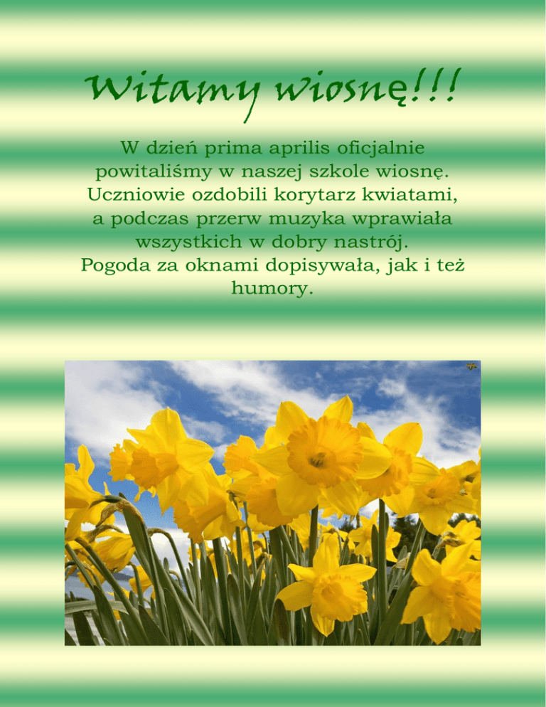 Witamy wiosnę!!! W dzień prima aprilis oficjalnie powitaliśmy w naszej szkole wiosnę. Uczniowie ozdobili korytarz kwiatami, a podczas przerw muzyka wprawiała wszystkich w dobry nastrój. Pogoda za oknami dopisywała, jak i też humory.
