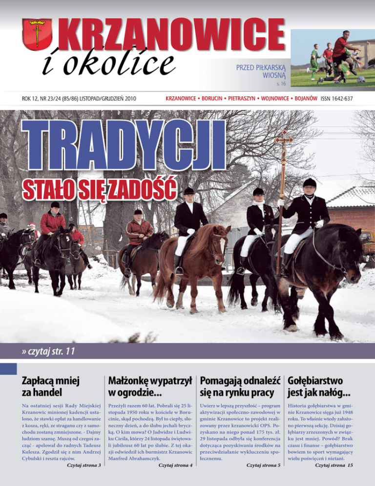 KRZANOWICE Przed piłkarską wiosną s. 16 ROK 12, NR 23/24 (85/86) LISTOPAD/GRUDZIEŃ 2010 KRZANOWICE • BORUCIN • PIETRASZYN • WOJNOWICE • BOJANÓW ISSN 1642-637 Tradycji stało się zadość » czytaj str. 11 Zapłacą mniej za handel Małżonkę wypatrzył Pomagają odnaleźć Gołębiarstwo w ogrodzie... się na rynku pracy jest jak nałóg... Na ostatniej sesji Rady Miejskiej Krzanowic minionej kadencji ustalono, że stawki opłat za handlowanie z kosza, ręki, ze straganu czy z samochodu zostaną zmniejszone. - Dajmy ludziom szansę. Muszą od czegoś zacząć - apelował do radnych Tadeusz Kulesza. Zgodził się z nim Andrzej Cybulski i reszta rajców. Czytaj strona 3 Przeżyli razem 60 lat. Pobrali się 25 listopada 1950 roku w kościele w Borucinie, skąd pochodzą. Był to ciepły, słoneczny dzień, a do ślubu jechali bryczką. O kim mowa? O Jadwidze i Ludwiku Cieśla, którzy 24 listopada świętowali jubileusz 60 lat po ślubie. Z tej okazji odwiedził ich burmistrz Krzanowic Manfred Abrahamczyk. Czytaj strona 4 Uwierz w lepszą przyszłość – program aktywizacji społeczno-zawodowej w gminie Krzanowice to projekt realizowany przez krzanowicki OPS. Pozyskano na niego ponad 175 tys. zł. 29 listopada odbyła się konferencja dotycząca pozyskiwania środków na przeciwdziałanie wykluczeniu społecznemu. Czytaj strona 5 Historia gołębiarstwa w gminie Krzanowice sięga już 1948 roku. To właśnie wtedy założono pierwszą sekcję. Dzisiaj gołębiarzy zrzeszonych w związku jest mniej. Powód? Brak czasu i finanse – gołębiarstwo bowiem to sport wymagający wielu poświęceń i nietani. Czytaj strona 15 W skrócie Kolizja trzech samochodów ZDANIEM BURMISTRZA Mamy za sobą gorący okres wyborczy. Znany jest już skład nowej Rady Miejskiej i Rady Powiatu. Szanowni wyborcy zdecydowali również, że przez kolejne cztery lata przyjdzie mi sprawować zaszczytną funkcję burmistrza Krzanowic. Tą drogą serdecznie dziękuję za udzielone poparcie. To dla mnie kolejne wyzwanie. Znam potrzeby gminy. Przed nami W sobotę 4 grudnia około godz. 22.40 straż pożarna zabezpieczała kolizję trzech samochodów w Krzanowicach przy ul. Samborowickiej. Tam zderzyły się ze sobą bmw, ford focus i skoda fabia. Na miejsce przybyła policja oraz pogotowie ratunkowe. Straty oszacowano na 10 tys. zł. XI Finał WOŚP 9 stycznia odbędzie się XI Finał Wielkiej Orkiestry Świątecznej Pomocy. Gminny sztab będzie się tradycyjnie znajdował w Miejskim Ośrodku Kultury. Zbiórka pieniędzy będzie prowadzona dla dzieci z chorobami urologicznymi i nefrologicznymi. Powiat Raciborski na targach Investfield Z końcem listopada w Poznaniu trwały targi inwestycyjne, w których po raz pierwszy w roli wystawcy wystąpił Powiat Raciborski. W ramach projektu Powiat raciborski to dobra inwestycja, ofertę inwestycyjną przedstawi Agencja Promocji Ziemi Promocji Ziemi Raciborskiej i Wspierania Przedsiębiorczości na Zamku Piastowskim w Raciborzu. Targi GMINA to projekt Międzynarodowych Targów Poznańskich zaprojektowany by zgromadzić w jednym czasie i miejscu reprezentantów samorządów terytorialnych oraz przedstawicieli świata biznesu. W ramach targów odbyłsię Salon Nieruchomości i Inwestycji INVESTFIELD, który oprócz bogatego programu merytorycznego, prezentował ofertę inwestycyjną regionów. W trakcie targów promowanych było aż dziewięć terenów inwestycyjnych gmin powiatu raciborskiego: 4 tereny Gminy Racibórz, 2 tereny Gminy Krzyżanowice i po jednym terenie Powiatu Raciborskiego, Gminy Kuźnia Raciborska oraz Gminy Krzanowice. Dla odwiedzających stoisko Powiatu przygotowano m.in. teczki inwestycyjne terenów z informacją w czterech językach, prezentację 2D i 3D, jak również materiały promocyjne. Siatkarski kalendarz Żeński siatkarski klub GS UKS Krzanowice, zafundował swoim kibicom kalendarz na 2011 rok. Zaprezentowano w nim II ligową kadrę, a ponadto każdy miesiąc przyporządkowano którejś z zawodniczek. I tak. Styczeń to Karolina Daniszewska, luty – Małgorzata Łyczko, marzec – Magdalena Bahryj, kwiecień – Sylwia Balcer, maj – Aleksandra Baron, czerwiec – Julia Siedlok, lipiec – Justyna Hońca, sierpień – Klaudia Nagler i Magdalena Śmieja, wrzesień – Klaudia Wittek, październik – Agnieszka Breitschedel, listopad – Barbara Otlik, grudzień – Weronika i Magdalena Sławik. Dziewczęta prezentują się wspaniale i gdyby nie sportowe stroje można by pomyśleć, że są zawodowymi modelkami. Ten unikatowy kalendarz można nabyć za jedyne 20 złotych w Zespole Szkół w Krzanowicach ul. Akacjowa 1. Na pewno będzie to sympatyczna inwestycja. 2 Przedmowa burmistrza szereg zadań, m.in. dokończenie budowy sieci kanalizacyjnej, sali sportowej, remonty dróg. Dalej będziemy się starać o unijne wsparcie dla naszych przedsięwzięć. Mam nadzieję, że znów owocna będzie współpraca z radnymi, którym gratuluję wyboru. W grudniu będziemy pracować nad budżetem 2011 r. W styczniu poinformujemy o podjętych de- cyzjach. Zapoznamy mieszkańców z wykazem zadań, jakie chcemy zrealizować w przyszłym roku. Mam głęboką nadzieję, że nie będzie on gorszy od tego. Burmistrz Manfred Abrahamczyk Wybory 2010 w gminie Krzanowice i powiecie Manfred Abrahamczyk po raz kolejny został burmistrzem gminy Krzanowice. Zdobył ponad 60 proc. głosów. Radną powiatową i wiceprzewodniczącą Rady Powiatu została Brygida Abrahamczyk. Poniżej dokładna statystyka wyborcza. Wybory burmistrza Kocjan Jerzy Jan 94 Radnymi zostali: Andrzej Sosna, Jan Lach i Teresa Kretek Abrahamczyk Manfred Józef 1078 - 60.46% głosów Bugla Krystyna 705 - 39.54% głosów Jak głosowano w okręgach: Krzanowice 1. Abrahamczyk Manfred 551 61,09% 2. Bugla Krystyna 351 38,91% Borucin 1. Abrahamczyk Manfred 160 61,54% 2. Bugla Krystyna 100 38,46% Wojnowice 1. Abrahamczyk Manfred 188 63,73 proc. 2. Bugla Krystyna 107 36,27 proc. Bojanów 1. Abrahamczy