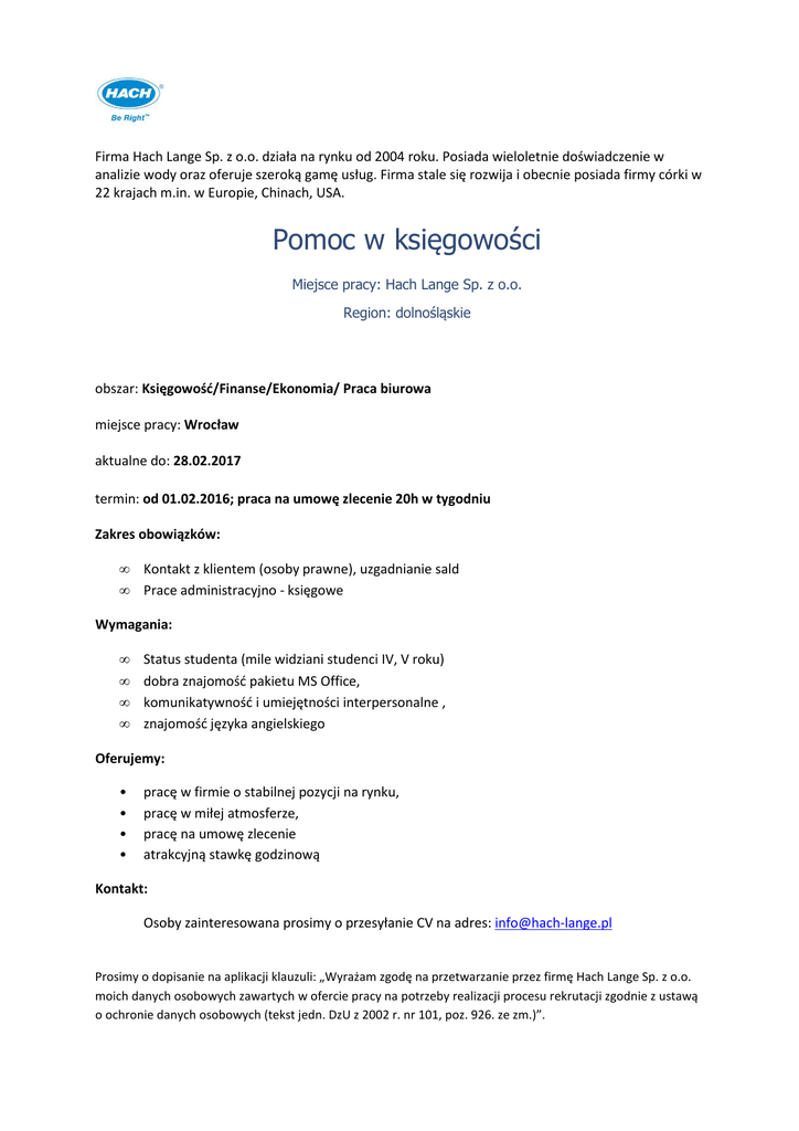 Firma Hach Lange Sp. z o.o. działa na rynku od 2004 roku. Posiada wieloletnie doświadczenie w analizie wody oraz oferuje szeroką gamę usług. Firma stale się rozwija i obecnie posiada firmy córki w 22 krajach m.in. w Europie, Chinach, USA. Pomoc w księgowości Miejsce pracy: Hach Lange Sp. z o.o. Region: dolnośląskie obszar: Księgowość/Finanse/Ekonomia/ Praca biurowa miejsce pracy: Wrocław aktualne do: 28.02.2017 termin: od 01.02.2016; praca na umowę zlecenie 20h w tygodniu Zakres obowiązków: • • Kontakt z klientem (osoby prawne), uzgadnianie sald Prace administracyjno - księgowe Wymagania: • • • • Status studenta (mile widziani studenci IV, V roku) dobra znajomość pakietu MS Office, komunikatywność i umiejętności interpersonalne , znajomość języka angielskiego Oferujemy: • • • • pracę w firmie o stabilnej pozycji na rynku, pracę w miłej atmosferze, pracę na umowę zlecenie atrakcyjną stawkę godzinową Kontakt: Osoby zainteresowana prosimy o przesyłanie CV na adres: [email protected] Prosimy o dopisanie na aplikacji klauzuli: „Wyrażam zgodę na przetwarzanie przez firmę Hach Lange Sp. z o.o. moich danych osobowych zawartych w ofercie pracy na potrzeby realizacji procesu rekrutacji zgodnie z ustawą o ochronie danych osobowych (tekst jedn. DzU z 2002 r. nr 101, poz. 926. ze zm.)”.