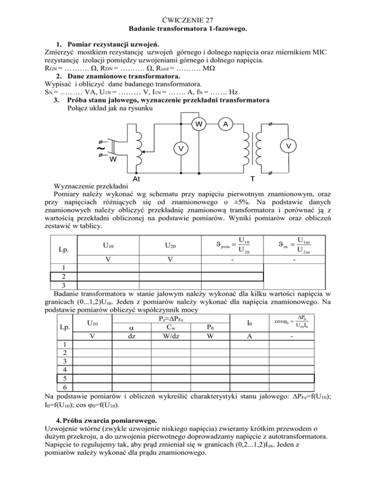 ĆWICZENIE 27 Badanie transformatora 1-fazowego. 1. Pomiar rezystancji uzwojeń. Zmierzyć mostkiem rezystancję uzwojeń górnego i dolnego napięcia oraz miernikiem MIC rezystancję izolacji pomiędzy uzwojeniami górnego i dolnego napięcia. RGN = ………. Ω, RDN = ………. Ω, Rizol = ………. MΩ 2. Dane znamionowe transformatora. Wypisać i obliczyć dane badanego transformatora. SN = ……… VA, U1N = ……… V, I1N = ……. A, fN = ……. Hz 3. Próba stanu jałowego, wyznaczenie przekładni transformatora Połącz układ jak na rysunku V Wyznaczenie przekładni Pomiary należy wykonać wg schematu przy napięciu pierwotnym znamionowym, oraz przy napięciach różniących się od znamionowego o ±5%. Na podstawie danych znamionowych należy obliczyć przekładnię znamionową transformatora i porównać ją z wartością przekładni obliczonej na podstawie pomiarów. Wyniki pomiarów oraz obliczeń zestawić w tablicy. Lp. U10 U20 pom U10 U 20 zn U1zn U 2 zn V V 1 2 3 Badanie transformatora w stanie jałowym należy wykonać dla kilku wartości napięcia w granicach (0...1,2)Uzn. Jeden z pomiarów należy wykonać dla napięcia znamionowego. Na podstawie pomiarów obliczyć współczynnik mocy P0 Pz≈PFe cos0 U10 I0 U10 I0 Lp. Cw P0 V dz W/dz W A 1 2 3 4 5 6 Na podstawie pomiarów i obliczeń wykreślić charakterystyki stanu jałowego: PFe=f(U10); I0=f(U10); cos 0=f(U10). 4. Próba zwarcia pomiarowego. Uzwojenie wtórne (zwykle uzwojenie niskiego napięcia) zwieramy krótkim przewodem o dużym przekroju, a do uzwojenia pierwotnego doprowadzamy napięcie z autotransformatora. Napięcie to regulujemy tak, aby prąd zmieniał się w granicach (0,2...1,2)Izn. Jeden z pomiarów należy wykonać dla prądu znamionowego. Lp. U1z I1z V A ΔPz≈PCu Cw Pz dz W/dz W Rz Zz Xz cos z Uz uz - V % 1 2 3 4 5 6 Uz Pz U1z 2 2 cos u 100% ; ; ; X Z R z z % z z z U1z I1z I1z U1zn I12z Na podstawie pomiarów i obliczeń wykreślić charakterystyki zwarciowe.: I1z=f(U1z); Pz=f(U1z); cosz=f(U1z). Rz Pz ; Zz 5. Pomiary w stanie obciążenia. Połącz układ jak na rysunku. Nastaw napięcie znamionowe na uzwojeniu pierwotnym. Podczas pomiarów, utrzymaj jego wartość. Należy wykonać kilka pomiarów dla prądu I2 w granicach (0,2...1,2)I2zn, przy obciążeniu rezystancyjnym. Pomiary Lp. U1 I1 P1 U2 I2 P2 cos 1 C P C P w 1 w 2 V A dz W/dz W V A dz W/dz W % 1 2 3 4 5 6 Na podstawie pomiarów wykreśl charakterystykę zewnętrzną transformatora U2=f(I2) przy U1=const. Oraz sprawności f I2) przy U1=const. Dla warunków znamionowych sprawdź bilans mocy transformatora: P1 P2 PFe PCu