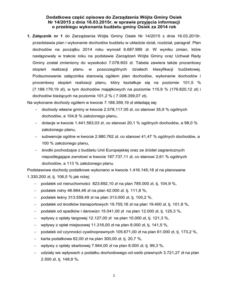 Dodatkowa część opisowa do Zarządzenia Wójta Gminy Osiek Nr 14/2015 z dnia 16.03.2015r. w sprawie przyjęcia informacji o przebiegu wykonania budżetu gminy Osiek za 2014 rok 1. Załącznik nr 1 do Zarządzenia Wójta Gminy Osiek Nr 14/2015 z dnia 16.03.2015r. przedstawia plan i wykonanie dochodów budżetu w układzie dział, rozdział, paragraf. Plan dochodów na początku 2014 roku wynosił 6.687.989 zł. W wyniku zmian, które następowały w trakcie roku na podstawie Zarządzeń Wójta Gminy oraz Uchwał Rady Gminy został zmieniony do wysokości 7.078.603 zł. Tabela zawiera także procentowy stopień realizacji planu w poszczególnych działach klasyfikacji budżetowej. Podsumowanie załącznika stanowią ogółem plan dochodów, wykonanie dochodów i procentowy stopień realizacji planu, który kształtuje się na poziomie 101,5 % (7.188.179,19 zł), w tym dochodów majątkowych na poziomie 115,9 % (179.820,12 zł) i dochodów bieżących na poziomie 101,2 % ( 7.008.359,07 zł). Na wykonane dochody ogółem w kwocie 7.188.359,19 zł składają się: dochody własne gminy w kwocie 2.578,117.05 zł, co stanowi 35,9 % ogólnych dochodów, a 104,8 % założonego planu, dotacje w kwocie 1.441.563,03 zł, co stanowi 20,1 % ogólnych dochodów, a 98,0 % założonego planu, subwencje ogólne w kwocie 2.980.762 zł, co stanowi 41,47 % ogólnych dochodów, a 100 % założonego planu, środki pochodzące z budżetu Unii Europejskiej oraz ze źródeł zagranicznych niepodlegające zwrotowi w kwocie 187.737,11 zł, co stanowi 2,61 % ogólnych dochodów, a 113 % założonego planu. Podstawowe dochody podatkowe wykonano w kwocie 1.416.145,18 zł na planowane 1.330.200 zł, tj. 106,5 % jak niżej: podatek od nieruchomości 823.692,10 zł na plan 785.000 zł, tj. 104,9 %, podatek rolny 46.964,46 zł na plan 42.000 zł, tj. 111,8 %, podatek leśny 313.559,49 zł na plan 313.000 zł, tj. 100,2 %, podatek od środków transportowych 19.755,16 zł na plan 19.400 zł, tj. 101,8 %, podatek od spadków i darowizn 15.041,00 zł na plan 12.000 zł, tj. 125,3 %, wpływy z opłaty targowej 12.127,00 zł na plan 10.000 zł, tj. 121,3 %, wpływy z opłat miejscowej 11.316,00 zł na plan 8.000 zł, tj. 141,5 %, podatek od czynności cywilnoprawnych 105.671,00 zł na plan 61.000 zł, tj. 173,2 %, karta podatkowa 62,00 zł na plan 300,00 zł, tj. 20,7 %, wpływy z opłaty skarbowej 7.944,00 zł na plan 8.000 zł, tj. 99,3 %, udziały we wpływach z podatku dochodowego od osób prawnych 3.721,27 zł na plan 2.500 zł, tj. 148,9 %, 1 udziały we wpływach z podatku dochodowego od osób fizycznych 785.559,00 na plan 776.936 zł, tj. 101,1 %, opłata za zajęcie pasa drogowego 8.944,87 zł na plan 9.000 zł, tj. 99,4 %, wpływy z tytułu jednorazowej opłaty w związku ze wzrostem wartości nieruchomości (renta planistyczna) 573,60 zł na plan 15.000 zł, tj. 3,8 %, wpływy z opłat za zezwolenia na sprzedaż alkoholu 39.905,52 zł na plan 40.000 zł, tj. 99,8%, rekompensata utraconych przez gminę dochodów w podatkach i opłatach lokalnych na skutek zwolnień 3.706,00 zł na plan 3.500 zł, tj. 105,9 %, odsetki od nieterminowych wpłat i koszty upomnienia 6.882,98 zł na plan 4.000 zł, tj. 172,1% Zauważyć można dużą rozpiętość wykonania niektórych podstawowych dochodów podatkowych w granicach od 3,8 % do 173,2 %. Na wykonanie niektórych rodzajów dochodów, takich jak: udziały we wpływach z podatku dochodowego od osób prawnych i fizycznych, karta podatkowa oraz podatek od czynności cywilnoprawnych gmina nie ma wpływu, ponieważ są one realizowane przez Urzędy Skarbowe oraz Ministerstwo Finansów. Brak władztwa podatkowego gminy w tym względzie, techniczny charakter ustalania i przekazywania wpływów gminie przez Urzędy Skarbowe stwarza trudności w prawidłowym ustalaniu planu tych wpływów. Wykonanie podatku dochodowego od osób fizycznych kształtuje się natomiast na poziomie 101,1 % w stosunku do planu – efekt rozliczenia tego podatku na szczeblu budżetu państwa. Dochody ze sprzedaży mienia komunalnego: plan 40.000 zł, wykonano 62.878,98 zł, tj. 157,2%. Dokonano sprzedaży działki nr 655 w Osieku za kwotę 38.642,27 zł netto, lokalu – pomieszczenia użytkowego i udziałów Gminy w nieruchomości wspólnej w budynku w Kasparusie za kwotę 24.040 zł, oraz dokonano zamiany działki gminnej przylegającej do prywatnej posesji, zlokalizowanej przy remizie OSP Osiek – wyrównanie różnicy wartości 196,71 zł netto. Na planowaną subwencję ogólną w kwocie 2.980.762 zł wykonano 2.980.762 zł, tj. 100%, z tego: część oświatowa 1.835.025 zł na plan 1.835.025 zł, tj. 100%, część wyrównawcza 1.143.218 zł na plan 1.143.218 zł, tj. 100%, część równoważąca 2.519,00 zł na plan 2.519 zł, tj. 100%. Na plan dotacji w kwocie 1.471.296 zł wykonano 1.441.563,03 zł, tj. 98,0%, z tego: na zadania zlecone bieżące z zakresu administracji rządowej 1.164.667,84 zł na plan 1.194.328 zł, tj. 97,5 % Dotacje te gmina otrzymała na realizację następujących zadań: zwrot podatku akcyzowego dla rolników, realizację zadań z zakresu administracji rządowej, aktualizację rejestru wyborców, wybory samorządowe, wybory do Parlamentu Europejskiego, zakup 2 podręczników dla klas szkoły podstawowej, bieżącą działalność Środowiskowego Domu Samopomocy, realizację zadań z zakresu świadczeń rodzinnych, świadczeń pielęgnacyjnych, funduszu alimentacyjnego oraz składek emerytalnych i rentowych z ubezpieczenia społecznego, opłacenie składek zdrowotnych za osoby pobierające niektóre świadczenia rodzinne, na dodatki energetyczne, na pomoc finansową dla osób uprawnionych do świadczenia pielęgnacyjnego, obsługa programu Karta Dużej Rodziny. na zadania własne bieżące 273.295,19 zł na plan 273.368 zł, tj. 99,97 % Dotacje te gmina otrzymała na realizację następujących zadań: dotacja na utrzymanie grobów wojennych, na oddziały przedszkolne, ws