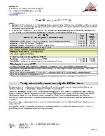 AltaSoft s.c. ul. Pukowca 15, 40-847 Katowice, POLSKA tel: +48 32 2598399/98/96, faks: wew. 18 email: [email protected] www.altasoft.pl Cennik (ważny do 31.12.2016) Uwagi: 1. Oprogramowanie objęte jest 12-miesięczną obsługą gwarancyjną. Podane ceny menedżera testów zawierają 12-miesięczną internetową subskrypcję oprogramowania, czyli 12-miesięczny bezpłatny dostęp do wszelkich aktualizacji oprogramowania. 2. Standardowa konfiguracja UPSA składa się z modułu UPSAbase realizującego standardowy zestaw funkcji oraz w razie potrzeby modułów dodatkowych i definicji formularzy (testów/arkuszy). Cena Cena brutto netto UPSA Menedżer testów (wersja standardowa) UPSAbase - moduł bazowy programu realizujący standardowy zestaw funkcji UPSAegz – pakiet: UPSAbase + TestEditor UPSApsi – pakiet: UPSAbase + TestEditor + NormEditor (PLN) VAT 23% (PLN) 5990,00 6500,00 6700,00 7367,70 7995,00 8241,00 1.990,00 400,00 2447,70 492,00 Wersja edukacyjna – dla uczelni wyższych: 20% rabat od podanych cen oprogramowania Wersja edukacyjna – nauczyciele: 50% rabat na pakiet UPSAEgz Moduły dodatkowe dla systemu UPSA*: TestEditor - edytor testów dla programu UPSA NormEditor – program do wprowadzania i generacji nowych norm Aktualizacja systemu UPSA*: Przedłużenie subskrypcji i gwarancji o następne 12 miesięcy – 15% ceny nowego oprogramowania Aktualizacja oprogramowania dla użytkowników wersji 5.0.0.0 i wyżej po okresie gwarancyjnym – 65% ceny nowego oprogramowania Rabat dla użytkowników wersji 4.5.0.0 – 4.9.0.0 z modułem ADF– 10% ceny nowego oprogramowania Rabat dla pozostałych użytkowników – 5% * Podane ceny dotyczą tylko systemów, które nie zawierają niestandardowych rozszerzeń wykonanych na zlecenie klienta Testy, niestandardowe moduły dla UPSA i inne… Ceny opracowania i podłączenia arkuszy i dodatkowych modułów realizowanych na zamówienie klienta wg odrębnej kalkulacji – w zależności od czasochłonności implementacji. Cena netto dołączenia całkowicie od nowa projektowanego jedno- do dwustronicowego formularza, z analizą wyników opartą na tabelach wyników i profilach, niewymagającego zmian oprogramowania zazwyczaj mieści się w granicach 640,00-1920,00 PLN. Projekt uwzględnia oprócz przygotowania odpowiednich definicji potrzebnych do rozpoznawania i analizy przygotowanie plików z wzorcem arkusza do wydruku na drukarce lub w drukarni. Gwarancją objęte jest oprogramowanie wraz z wszystkimi dodatkowymi modułami i definicjami dostarczanymi przez AltaSoft. W przypadku zakupu oprogramowania wraz ze specjalizowanym skanerem dokumentów (Fujitsu, Canon…) przedstawiana jest indywidualna oferta na zakup całości. Konto: REGON: NIP: mBank S.A., nr 79 1140 2017 0000 4202 1296 0659 276859493 634-23-96-317 Strona 1/2 AltaSoft s.c. Szkolenia Przy zakupie nowego stanowiska z wyjątkiem wersji dla nauczycieli można skorzystać z nieodpłatnego szkolenia w siedzibie firmy AltaSoft: UPSA – 2 godz. Szkolenia dla 1-2 osób TestEditor – 3 godz szkolenia dla 1-2 osób NormEditor – 1 godz szkolenia dla 1-2 osób Cena netto dodatkowych szkoleń w siedzibie firmy lub z dojazdem do 30 km: 1 godz. – od 80 PLN Rabaty stałe… Wersja edukacyjna – dla uczelni wyższych Wersja edukacyjna nauczyciele (UPSAEgz) Rabaty aktualizacyjne zależne od wersji użytkowanego oprogramowania Zakup większej liczby jednakowo skonfigurowanych stanowisk Rabat 20% 50% od 5% od 20% Usługi AltaSoft oferuje kompleksowe usługi związane z obsługą głosowań, egzaminów, ankiet. Koszt przygotowania odpowiednich formularzy i obsługi wydarzenia – od 3000 PLN netto. Dokładna cena w każdym przypadku jest kalkulowana. Strona 2/2