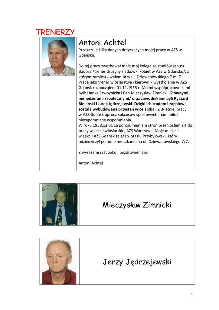 TRENERZY Antoni Achtel Przekazuję kilka danych dotyczących mojej pracy w AZS w Gdańsku. Do tej pracy zwerbował mnie mój kolega ze studiów Janusz Badora /trener drużyny siatkówki kobiet w AZS w Gdańsku/, z którym zamieszkiwałem przy ul. Dziewanowskiego 7 m. 7. Pracę jako trener wioślarstwa i kierownik wyszkolenia w AZS Gdańsk rozpocząłem 01.11.1955 r. Moimi współpracownikami byli: Hanka Szwoynicka i Pan Mieczysław Zimnicki. Głównymi menedżerami /społecznymi/ oraz zawodnikami byli Ryszard Bielański i Jurek Jędrzejewski. Dzięki ich trudom i zapałowi została wybudowana przystań wioślarska. Z 3-letniej pracy w AZS Gdańsk oprócz sukcesów sportowych mam miłe i niezapomniane wspomnienia. W roku 1958.12.01 za porozumieniem stron przeniosłem się do pracy w sekcji wioślarskiej AZS Warszawa. Moje miejsce w sekcji AZS Gdańsk zajął sp. Stasiu Przybyłowski, który odziedziczył po mnie mieszkanie na ul. Dziewanowskiego 7/7. Z wyrazami szacunku i pozdrowieniami Antoni Achtel Mieczysław Zimnicki Jerzy Jędrzejewski 1 Halina Szwoynicka Ryszard Pauli Stanisław Przybyłowski Bernard Pepliński 2 Witold Sroga Piotr Buliński Tomasz Tomiak Społecznie nauczali sztuki wiosłowania Ewa Oleksiak Stanisław Traczyński 3 Wiesław Borysiak Eugeniusz Smoroń Jan Lepak Grzegorz Michalski 4