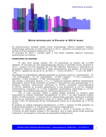 Informacja prasowa R UCH BUDOWLANY W P OLSCE W 2014 ROKU Po podsumowaniu wyników badań ruchu budowlanego, Główny Inspektor Nadzoru Budowlanego informuje, że liczba wydanych w 2014 r. pozwoleń na budowę jest o 0,46% wyższa od liczby pozwoleń wydanych w 2013 r. W stosunku do 2013 r. wzrosła także o 910 liczba obiektów objętych wydanymi pozwoleniami na budowę. POZWOLENIA NA BUDOWĘ W roku 2014 zostały wydane 193 172 pozwolenia na budowę dla 214 699 obiektów. W stosunku do roku poprzedzającego oznacza to niewielki wzrost, ponieważ w 2013 r. wydano 192 278 pozwoleń dla 213 789 obiektów. Natomiast w odniesieniu do pozostałych badanych lat 2009-2012 nadal odnotowywany jest spadek. W porównaniu do 2012 r. spadek ten wynosi 6,7%, do 2011 r. – 12,6%, do 2010 r. – 11,3% i do 2009 r. – 9%. W podziale na województwa najwięcej pozwoleń na budowę wydano w: mazowieckim – 27 125, wielkopolskim – 22 745, małopolskim – 19 926 i śląskim – 17 570, a najmniej w: opolskim – 2 662, lubuskim – 4 488, świętokrzyskim – 5 830. Jak wynika z zebranych danych, w 6 z 11 badanych kategorii obiektów budowlanych odnotowano wzrost liczby pozwoleń na budowę w stosunku do roku poprzedniego, tj. w kategorii obiektów użyteczności publicznej (o 59,9%), budynków wielorodzinnych (o 26,4%), obiektów na terenach zamkniętych, w tym kolejowych (o 24,7%), obiektów infrastruktury transportu (o 11,4%), budynków zamieszkania zbiorowego (o 13,7%), rurociągów, linii telekomunikacyjnych i elektroenergetycznych (o 5,8%). Jak co roku znaczący udział w ogólnej liczbie pozwoleń na budowę mają pozwolenia na budowę budynków mieszkalnych. W 2014 r. na takie budynki wydano ogółem 76 396 pozwoleń, co stanowi 39,5% ogólnej liczby pozwoleń. Nadal jest to jednak mniej niż we wszystkich badanych latach (tj. w latach 2009-2013). Do 2013 r. spadek wynosi 1,46%. W odniesieniu do lat wcześniejszych mieści się w przedziale od 11,4% do 24,3%. W podziale na rodzaje budynków mieszkalnych, w 2014 r. wydano 73 248 pozwoleń na budynki jednorodzinne i 3 148 pozwoleń na budynki wielorodzinne. Pozwoleń na obiekty wielorodzinne wydano więcej o 26,4% w stosunku do 2013 r., w którym na takie obiekty wydano 2 491 pozwoleń. Jest to także wzrost liczby pozwoleń wydanych w tej kategorii w stosunku do pozostałych badanych lat. GŁÓWNY URZĄD NADZORU BUDOWLANEGO www.gunb.gov.pl WARSZAWA, LUTY 2015 R. 1 Informacja prasowa OBIEKTY INFRASTRUKTURY TRANSPORTU W 2014 r. wydano łącznie 9 788 pozwoleń i zezwoleń dla 11 220 obiektów infrastruktury transportu. Natomiast w roku wcześniejszym liczby te wynosiły 8 822 decyzje dla 11 076 obiektów. Zatem łączna liczba decyzji wzrosła w 2014 r. o 10,9% w stosunku do 2013 r. Wzrost odnotowano także w odniesieniu do lat wcześniejszych. OBIEKTY PRZECIWPOWODZIOWE Kolejną rozpatrywaną kategorią obiektów są budowle przeciwpowodziowe, których realizacja wymaga zezwolenia. W 2014 r. w tej kategorii zostało wydanych 67 zezwoleń dla 127 obiektów. Najwięcej wydano w Regionie Południowo-Zachodnim (23 dla 55 obiektów). Natomiast w układzie wojewódzkim najwięcej zezwoleń wydano w województwach dolnośląskim – 15 dla 47 obiektów i małopolskim – 11 dla 11 obiektów. OBIEKTY ODDANE DO UŻYTKOWANIA Począwszy od 1995 r. aż do 2008 r., pomimo nieznacznych wahań, liczba obiektów przekazanych do użytkowania wykazywała tendencję wzrostową. Wyjątkowo znaczący wzrost o 32% odnotowano w 2003 r. W 2008 r. liczba obiektów oddanych do użytkowania wyniosła 168 804. Rok później oddano do użytkowania już tylko niespełna 143 000 obiektów. W kilku ostatnich latach liczba obiektów oddawanych do użytkowania powoli wzrastała, ale dopiero w 2014 r. przekroczyła poziom z 2008 r. W 2014 r. do użytkowania oddano 169 596 obiektów budowlanych, w tym 78 263 budynki mieszkalne jednorodzinne i 3 351 budynków wielorodzinnych. Wzrost liczby obiektów oddanych do użytkowania w stosunku do roku poprzedzającego wynosi 1,4%. Jak wynika z analizy struktury obiektów oddanych do użytkowania, w 2014 r. w odniesieniu do 2013 r. nastąpił wzrost w 8 (z 11 badanych) kategoriach budownictwa: budynki użyteczności publicznej (o 62,9%), budynki zamieszkania zbiorowego (o 56,3%), obiekty infrastruktury transportu (o 35,4%), obiekty na terenach zamkniętych (o 8,6%), pozostałe obiekty (o 7,9%), rurociągi, linie telekomunikacyjne i elektroenergetyczne (o 4,4%), budynki wielorodzinne (o 4,2%) i budynki przemysłowe i magazynowe (o 4,1%). Natomiast liczba oddanych do użytkowania budynków jednorodzinnych spadła o 5,5% w stosunku do 2013 r. W układzie wojewódzkim wzrost liczby obiektów oddanych do użytkowania nastąpił w 8 województwach, największy w zachodniopomorskim – o 19,3%, łódzkim – o 18% i podlaskim – o 14,2%. Największy spadek odnotowano w śląskim – o 8,9%. LEGALIZACJA SAMOWOLI BUDOWLANYCH W ubiegłym roku ogółem zalegalizowano 523 obiekty budowlane. Oznacza to wzrost o 158 obiektów w odniesieniu do lat 2013 i 2012, w których zostało zalegalizowanych po 365 obiektów oraz o 57 obiektów w stosunku do 2011 r. Natomiast GŁÓWNY URZĄD NADZORU BUDOWLANEGO www.gunb.gov.pl WARSZAWA, LUTY 2015 R. 2 Informacja prasowa w stosunku do lat 2010 i 2009 w tej kategorii odnotowano spadek (o 48 i o 158 obiektów). Najwięcej decyzji legalizacyjnych wydano w województwach: zachodniopomorskim – 128, kujawsko-pomorskim – 94 i wielkopolskim – 70. Najmniej w lubuskim – 1. W 2014 r., tak jak w latach poprzednich, największa liczba decyzji legalizacyjnych dotyczyła budynków jednorodzinnych (148 obiektów – co stanowi 28,3% wszystkich decyzji legalizacyjnych). Drugą w kolejności kategorią są budynki użyteczności publicznej (107 – 20,5% wszystkich decyzji legalizacyjnych). NAKAZY ROZBIÓRKI OBIEKTÓW BUDOWLANYCH W 2014 r. wydano ogółem 4 996 nakazów rozbiórki, czyli o 277 nakazów więcej niż w 2013 r. (wzro