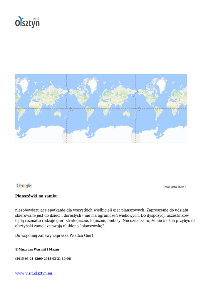Planszówki na zamku niezobowiązujące spotkanie dla wszystkich wielbicieli gier planszowych. Zaproszenie do udziału skierowane jest do dzieci i dorosłych - nie ma ograniczeń wiekowych. Do dyspozycji uczestników będą rozmaite rodzaje gier: strategiczne, logiczne, fantasy. Nie oznacza to, że nie można przybyć na olsztyński zamek ze swoją ulubioną "planszówką". Do wspólnej zabawy zaprasza Władca Gier! 1)Muzeum Warmii i Mazur, (2015-03-21 12:00-2015-03-21 19:00) www.visit.olsztyn.eu