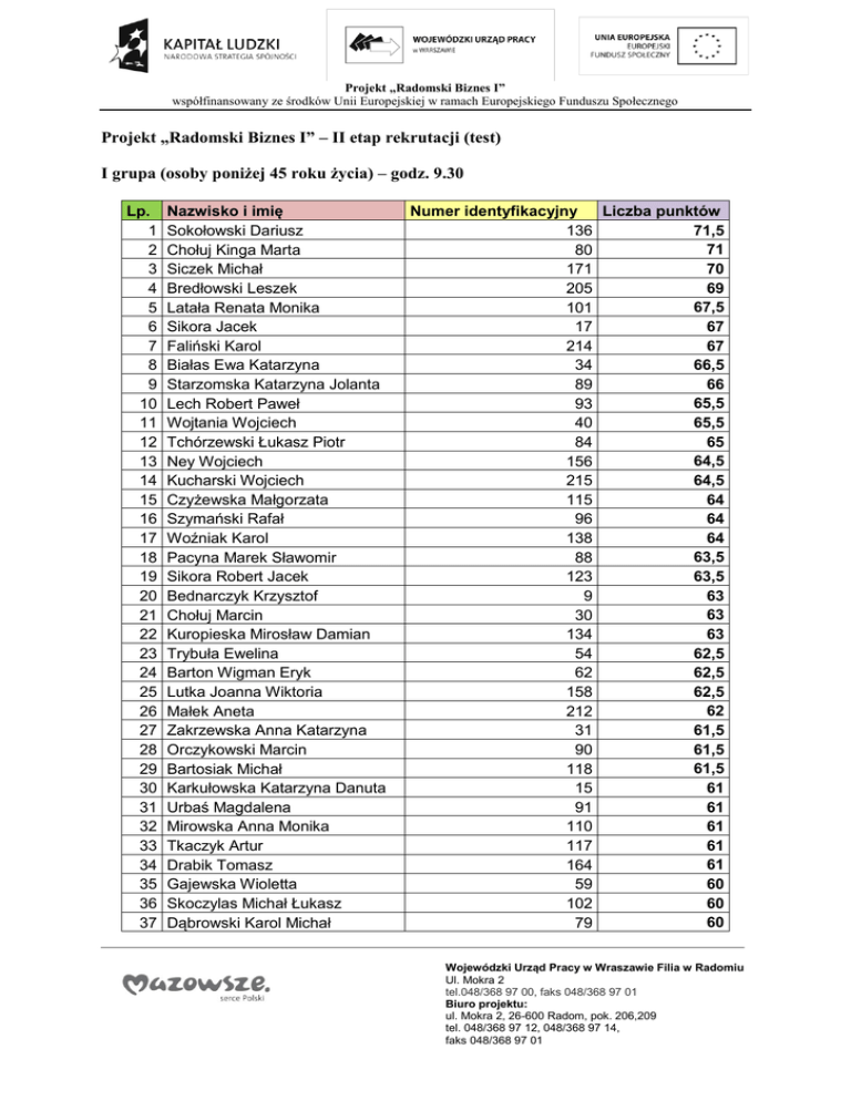 Projekt „Radomski Biznes I” współfinansowany ze środków Unii Europejskiej w ramach Europejskiego Funduszu Społecznego Projekt „Radomski Biznes I” – II etap rekrutacji (test) I grupa (osoby poniżej 45 roku życia) – godz. 9.30 Lp. 1 2 3 4 5 6 7 8 9 10 11 12 13 14 15 16 17 18 19 20 21 22 23 24 25 26 27 28 29 30 31 32 33 34 35 36 37 Nazwisko i imię Sokołowski Dariusz Chołuj Kinga Marta Siczek Michał Bredłowski Leszek Latała Renata Monika Sikora Jacek Faliński Karol Białas Ewa Katarzyna Starzomska Katarzyna Jolanta Lech Robert Paweł Wojtania Wojciech Tchórzewski Łukasz Piotr Ney Wojciech Kucharski Wojciech Czyżewska Małgorzata Szymański Rafał Woźniak Karol Pacyna Marek Sławomir Sikora Robert Jacek Bednarczyk Krzysztof Chołuj Marcin Kuropieska Mirosław Damian Trybuła Ewelina Barton Wigman Eryk Lutka Joanna Wiktoria Małek Aneta Zakrzewska Anna Katarzyna Orczykowski Marcin Bartosiak Michał Karkułowska Katarzyna Danuta Urbaś Magdalena Mirowska Anna Monika Tkaczyk Artur Drabik Tomasz Gajewska Wioletta Skoczylas Michał Łukasz Dąbrowski Karol Michał Numer identyfikacyjny Liczba punktów 71,5 136 71 80 70 171 69 205 67,5 101 67 17 67 214 66,5 34 66 89 65,5 93 65,5 40 65 84 64,5 156 64,5 215 64 115 64 96 64 138 63,5 88 63,5 123 63 9 63 30 63 134 62,5 54 62,5 62 62,5 158 62 212 61,5 31 61,5 90 61,5 118 61 15 61 91 61 110 61 117 61 164 60 59 60 102 60 79 Wojewódzki Urząd Pracy w Wraszawie Filia w Radomiu Ul. Mokra 2 tel.048/368 97 00, faks 048/368 97 01 Biuro projektu: ul. Mokra 2, 26-600 Radom, pok. 206,209 tel. 048/368 97 12, 048/368 97 14, faks 048/368 97 01 Projekt ,,Radomski Biznes I” współfinansowany ze środków Unii Europejskiej w ramach Europejskiego Funduszu Społecznego 38 39 40 41 42 43 44 45 46 47 48 49 50 51 52 53 54 55 56 57 58 59 60 61 62 63 64 65 66 67 68 69 70 71 72 73 74 75 76 77 78 Kszczotek Artur Pomagalski Konrad Tomczyk Dominika Nieordzińska Katarzyna Kacperczak Mirosław Urbańska Izabela Skałban Jacek Krzysztof Gregorczyk Albert Piotr Żabicki Krzysztof Jacek Tybiszewska - Wilfort Magdalena Misiura Marzena Jaroszek Seweryn Jan Wietrak Paulina Magdalena Ziętek Przemysław Nowakowski Paweł Michalik Ewelina Anna Sułek Bogusława Krystyna Lasota Anna Faryna Jarosław Adam Sito Rafał Żyszczyński Robert Franciszek Kandzior Piotr Stanisław Misiura Robert Bielecka Joanna Pasik Mariusz Winiarska Bogusława Gos Tomasz Dróżdż Grzegorz Wiosna Grażyna Bienias Justyna Komosa Paweł Romuald Pogoda Małgorzata Wieteska Robert Sylwester Lubański Daniel Jan Jezierska Gabriela Monika Kowalczyk Łukasz Bażanow Anna Agnieszka Mazur Kama Róża Stachowicz Karol Ernest Bieszczad Barbara Ewa Lipiński Rafał 112 100 131 1 11 73 81 50 48 47 142 210 18 169 149 57 83 42 5 68 22 32 114 216 159 16 19 23 104 137 165 37 92 108 106 145 151 56 105 94 133 60 60 60 59,5 59,5 59,5 59,5 59,5 59,5 59,5 59,5 59,5 59 59 59 59 58,5 58,5 58 58 58 58 58 58 58 57,5 57,5 57,5 57,5 57,5 57,5 57 57 57 56,5 56,5 56,5 56 56 56 56 Wojewódzki Urząd Pracy w Wraszawie Filia w Radomiu Ul. Mokra 2 tel.048/368 97 00, faks 048/368 97 01 Biuro projektu: ul. Mokra 2, 26-600 Radom, pok. 206,209 tel. 048/368 97 12, 048/368 97 14, faks 048/368 97 01 Projekt ,,Radomski Biznes I” współfinansowany ze środków Unii Europejskiej w ramach Europejskiego Funduszu Społecznego 79 Siennicki Piotr 144 56 II grupa (osoby po 45 roku życia) – godz. 12.00 Lp. 1 2 3 4 5 6 7 8 9 10 11 12 13 14 15 16 17 18 19 20 21 22 23 24 25 26 27 28 29 30 31 32 33 34 35 Nazwisko i imię Mrówczyński Arkadiusz Piotr Chrząstek Grzegorz Widuliński Marek Jacek Gutkowska Małgorzata Kwiatkowski Marek Jerzy Pastuszko Grzegorz Stanisław Pajestka Janusz Jończyk Sławomir Franciszek Nejman Zbigniew Rola Andrzej Stankowska Bożena Wanda Kowalski Wiesław Stróż Andrzej Kwintal Maria Kowalczyk Leokadia Ewa Ziętek Edward Józef Gwardiak Zenon Sumik Krzysztof Grzesiak Maria Pluskwa Jerzy Duchnik Zbigniew Stanisław Różalski Leszek Bator Maria Mirosława Banasik Jacek Jan Zakrzewska Jolanta Teresa Kozakiewicz Grzegorz Zdulski Wiesław Szczęsna Barbara Jagodziński Leszek Grzęda Grażyna Jaśkiewicz Andrzej Waldemar Karwicka Elżbieta Wójcik Andrzej Stępień Danuta Barbara Miturski Piotr Numer identyfikacyjny Liczba punktów 72,5 10 72 135 68,5 58 68,5 28 64,5 146 64 8 64 74 64 139 63 61 63 127 62,5 69 62 20 62 109 62 119 62 157 61,5 95 61,5 203 61,5 128 60,5 87 60 103 59,5 13 59,5 71 59,5 153 59,5 49 59 29 59 98 59 166 58,5 3 58,5 121 58 45 58 167 57,5 44 57 76 57 7 57 12 Wojewódzki Urząd Pracy w Wraszawie Filia w Radomiu Ul. Mokra 2 tel.048/368 97 00, faks 048/368 97 01 Biuro projektu: ul. Mokra 2, 26-600 Radom, pok. 206,209 tel. 048/368 97 12, 048/368 97 14, faks 048/368 97 01 Projekt ,,Radomski Biznes I” współfinansowany ze środków Unii Europejskiej w ramach Europejskiego Funduszu Społecznego 36 37 38 39 Michałek Jacek Ogorzałek Alicja Bakalarz Ewa Kowalczyk Kazimiera Józefa 65 113 160 162 56 56 56 56 Wojewódzki Urząd Pracy w Wraszawie Filia w Radomiu Ul. Mokra 2 tel.048/368 97 00, faks 048/368 97 01 Biuro projektu: ul. Mokra 2, 26-600 Radom, pok. 206,209 tel. 048/368 97 12, 048/368 97 14, faks 048/368 97 01