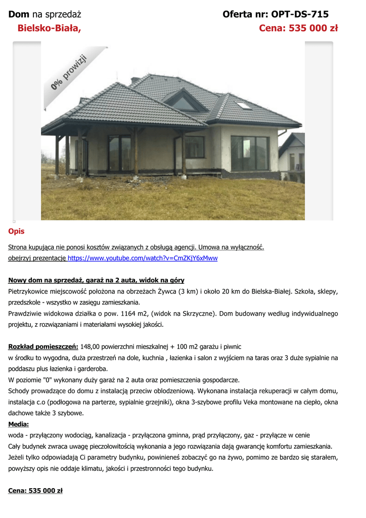 Dom na sprzedaż Bielsko-Biała, Oferta nr: OPT-DS-715 Cena: 535 000 zł Opis Strona kupująca nie ponosi kosztów związanych z obsługą agencji. Umowa na wyłączność. obejrzyj prezentację https://www.youtube.com/watch?v=CmZKjY6xMww Nowy dom na sprzedaż, garaż na 2 auta, widok na góry Pietrzykowice miejscowość położona na obrzeżach Żywca (3 km) i około 20 km do Bielska-Białej. Szkoła, sklepy, przedszkole - wszystko w zasięgu zamieszkania. Prawdziwie widokowa działka o pow. 1164 m2, (widok na Skrzyczne). Dom budowany według indywidualnego projektu, z rozwiązaniami i materiałami wysokiej jakości. Rozkład pomieszczeń: 148,00 powierzchni mieszkalnej + 100 m2 garażu i piwnic w środku to wygodna, duża przestrzeń na dole, kuchnia , łazienka i salon z wyjściem na taras oraz 3 duże sypialnie na poddaszu plus łazienka i garderoba. W poziomie "0" wykonany duży garaż na 2 auta oraz pomieszczenia gospodarcze. Schody prowadzące do domu z instalacją przeciw oblodzeniową. Wykonana instalacja rekuperacji w całym domu, instalacja c.o (podłogowa na parterze, sypialnie grzejniki), okna 3-szybowe profilu Veka montowane na ciepło, okna dachowe także 3 szybowe. Media: woda - przyłączony wodociąg, kanalizacja - przyłączona gminna, prąd przyłączony, gaz - przyłącze w cenie Cały budynek zwraca uwagę pieczołowitością wykonania a jego rozwiązania dają gwarancję komfortu zamieszkania. Jeżeli tylko odpowiadają Ci parametry budynku, powinieneś zobaczyć go na żywo, pomimo ze bardzo się starałem, powyższy opis nie oddaje klimatu, jakości i przestronności tego budynku. Cena: 535 000 zł Dane agenta Janusz Borowicz tel. 33 307 01 99 kom. 531 880 531 nr licencji: 13934 Szczegóły Symbol oferty OPT-DS-715 Lokalizacja Bielsko-Biała Pow. całkowita [m2] 148,00 m² Ilość pokoi 4 Cena 535 000 PLN Nieruchomość Standard Garaż na dwa samochody Okna nowe PCV Instalacje nowe Powierzchnia działki [m2] 1 164 m² Zagosp. działki częściowo zagospodarowana Rodzaj domu dom jednorodzinny Pokrycie dachu dachówka betonowa Powierzchnia użytkowa [m2] 148,0 m² Stan budynku do wykończenia Podpiwniczenie tak Plac zabaw nie Gaz w trakcie prowadzenia Woda tak - miejska Dojazd droga utwardzona Otoczenie zabudowa jednorodzinna Ogrzewanie własne gazowe - kocioł 2-funkcyjny Alarm nie Winda nie Tarasy taras duży Drzwi antywłamaniowe tak Prąd jest Kanalizacja miejska Pomieszczenia Ilość pokoi 4 Rodzaj kuchni aneks kuchenny - połączony z jadalnią Ilość łazienek 2