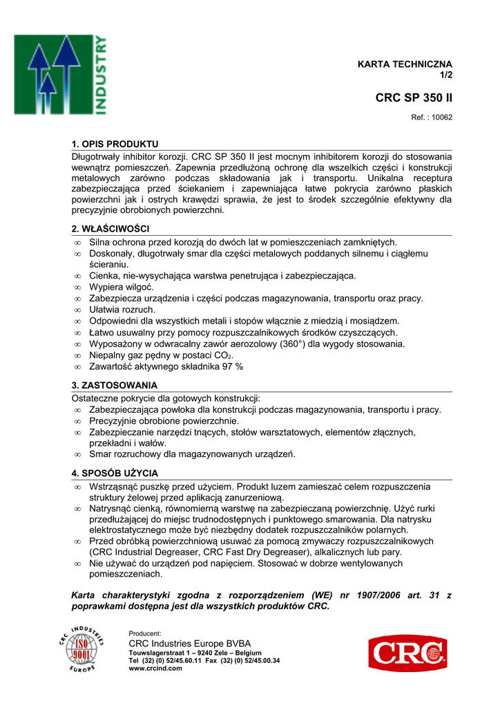 KARTA TECHNICZNA 1/2 CRC SP 350 II Ref. : 10062 1. OPIS PRODUKTU Długotrwały inhibitor korozji. CRC SP 350 II jest mocnym inhibitorem korozji do stosowania wewnątrz pomieszczeń. Zapewnia przedłużoną ochronę dla wszelkich części i konstrukcji metalowych zarówno podczas składowania jak i transportu. Unikalna receptura zabezpieczająca przed ściekaniem i zapewniająca łatwe pokrycia zarówno płaskich powierzchni jak i ostrych krawędzi sprawia, że jest to środek szczególnie efektywny dla precyzyjnie obrobionych powierzchni. 2. WŁAŚCIWOŚCI • Silna ochrona przed korozją do dwóch lat w pomieszczeniach zamkniętych. • Doskonały, długotrwały smar dla części metalowych poddanych silnemu i ciągłemu ścieraniu. • Cienka, nie-wysychająca warstwa penetrująca i zabezpieczająca. • Wypiera wilgoć. • Zabezpiecza urządzenia i części podczas magazynowania, transportu oraz pracy. • Ułatwia rozruch. • Odpowiedni dla wszystkich metali i stopów włącznie z miedzią i mosiądzem. • Łatwo usuwalny przy pomocy rozpuszczalnikowych środków czyszczących. • Wyposażony w odwracalny zawór aerozolowy (360°) dla wygody stosowania. • Niepalny gaz pędny w postaci CO2. • Zawartość aktywnego składnika 97 % 3. ZASTOSOWANIA Ostateczne pokrycie dla gotowych konstrukcji: • Zabezpieczająca powłoka dla konstrukcji podczas magazynowania, transportu i pracy. • Precyzyjnie obrobione powierzchnie. • Zabezpieczanie narzędzi tnących, stołów warsztatowych, elementów złącznych, przekładni i wałów. • Smar rozruchowy dla magazynowanych urządzeń. 4. SPOSÓB UŻYCIA • Wstrząsnąć puszkę przed użyciem. Produkt luzem zamieszać celem rozpuszczenia struktury żelowej przed aplikacją zanurzeniową. • Natrysnąć cienką, równomierną warstwę na zabezpieczaną powierzchnię. Użyć rurki przedłużającej do miejsc trudnodostępnych i punktowego smarowania. Dla natrysku elektrostatycznego może być niezbędny dodatek rozpuszczalników polarnych. • Przed obróbką powierzchniową usuwać za pomocą zmywaczy rozpuszczalnikowych (CRC Industrial Degreaser, CRC Fast Dry Degreaser), alkalicznych lub pary. • Nie używać do urządzeń pod napięciem. Stosować w dobrze wentylowanych pomieszczeniach. Karta charakterystyki zgodna z rozporządzeniem (WE) nr 1907/2006 art. 31 z poprawkami dostępna jest dla wszystkich produktów CRC. Producent: CRC Industries Europe BVBA Touwslagerstraat 1 – 9240 Zele – Belgium Tel (32) (0) 52/45.60.11 Fax (32) (0) 52/45.00.34 www.crcind.com KARTA TECHNICZNA 2/2 CRC SP 350 II Ref. : 10062 5. DANE TECHNICZNE (bez gazu pędnego) Wygląd Ciężar właściwy (w 20°C) aerozol luzem Temperatura zapłonu (tygiel zamknięty) aerozol luzem Lepkość dynamiczna (w 20°C) luzem Ostateczna grubość powłoki Maksymalna powierzchnia pokrycia Ulatnianie rozpuszczalnika Własności powłoki (po odparowaniu rozpuszczalnika) Lepkość dynamiczna (20°C) Wytrzymałość w komorze solnej (*)(ASTM B 117) Wytrzymałość cieplna : : : : : : : : : bursztynowy, matowy 0,82 g/cm3 0,86 g/cm3 <0°C 50°C 20 – 100 mPa.s zależnie od żelowania 10-20 µm (w 20°C,po 24h) 40m2/litr (w 20°C, po 24h) 2 – 4h (w 20°C, cienka powoka) : : : 30.000 mPa.s (tiksotropia) >300 h 100°C * Trwałość ochrony antykorozyjnej zależy głównie od przygotowania powierzchni i atmosfery wewnątrz pomieszczenia. Może to być mniej niż 3 miesiące lub więcej 2 lata Przy pierwszym użyciu należy okresowo kontrolować pojawianie się oznak korozji. Jeśli trwałość ochrony antykorozyjnej zostanie w konkretnych warunkach ustalona to można okresowo ponawiać użycie CRC SP350 II aby utrzymać ochronę powierzchni. 6. OPAKOWANIA Aerozol: 12 x 300ml Luzem: 4 x 5l, 20l, 200l Wszystkie dane przedstawione w tej karcie oparte są na naszym doświadczeniu i/lub testach laboratoryjnych. Z powodu różnorodności urządzeń i warunków pracy oraz nieprzewidywalnych zachowań ludzkich polecamy wcześniejsze przetestowanie produktu przed użyciem. Wszystkie informacje podane są w dobrej wierze, ale bez żadnej gwarancji. Informacje przedstawione w niniejszej Karcie Technicznej mogą ulec zmianie w wyniku zmian prawnych, zmian składników lub nowych doświadczeń. Ostateczna i aktualna wersja Karty Technicznej może być przesłana na żądanie, jest także dostępna na naszej stronie internetowej: www.crcind.com. Zalecamy zarejestrowanie się na tej stronie, aby w przyszłości automatycznie otrzymywać uaktualnione wersje tej Karty Technicznej. Wersja : 10062 03 0908 00 Data : 15 września 2008 Producent: CRC Industries Europe BVBA Touwslagerstraat 1 – 9240 Zele – Belgium Tel (32) (0) 52/45.60.11 Fax (32) (0) 52/45.00.34 www.crcind.com