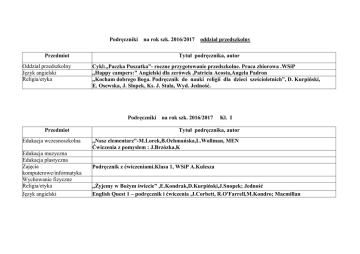 Podręczniki na rok szk. 2016/2017 Tytuł podręcznika, autor Przedmiot Oddział przedszkolny Język angielski Religia/etyka Cykl:,,Paczka Puszatka”- roczne przygotowanie przedszkolne. Praca zbiorowa .WSiP ,,Happy campers:" Angielski dla zerówek ,Patricia Acosta,Augela Padron „Kocham dobrego Boga. Podręcznik do nauki religii dla dzieci sześcioletnich”, D. Kurpiński, E. Osewska, J. Slopek, Ks. J. Stala, Wyd. Jedność. Podręczniki Przedmiot Edukacja wczesnoszkolna Edukacja muzyczna Edukacja plastyczna Zajęcia komputerowe/informatyka Wychowanie fizyczne Religia/etyka Język angielski oddział przedszkolny na rok szk. 2016/2017 Kl. I Tytuł podręcznika, autor ,,Nasz elementarz”-M.Lorek,B.Ochmańska,L.Wollman, MEN Ćwiczenia z pomysłem : J.Brzózka,K Podręcznik z ćwiczeniami.Klasa 1, WSiP A.Kulesza ,,Żyjemy w Bożym świecie” ,E.Kondrak,D.Kurpiński,J.Snopek; Jedność English Quest 1 – podręcznik i ćwiczenia ,J.Corbett, R.O'Farrell,M.Kondro; Macmillan Podręczniki Edukacja muzyczna Edukacja plastyczna Zajęcia komputerowe/informatyka Wychowanie fizyczne Religia/etyka Język angielski Nasza szkoła. Podręcznik do szkoły podstawowej .Klasa 2,M.Lorek,M.Zatorska Nasza szkoła. Matematyka. Podręcznik do szkoły podstawowej. Klasa 2. Autor:A.Ludwa Ćwiczenia z pomysłem. WSiP Nasza szkoła. Podręcznik do szkoły podstawowej. Klasa 2.Autorzy: M.Lorek,M.Zatorska Nasza szkoła. Podręcznik do szkoły podstawowej. Klasa 2.Autorzy: M.Lorek,M.Zatorska ,,Idziemy do Jezusa”-podręcznik do religii dla klasy II szkoły podstawowej; D.Kurpiński,J.Snopek,wyd.Jedność ,,English Quest 2"- podręcznik i zeszyt ćwiczeń ,J.Corbett, R.O'Farrell, wyd.Macmillan Podręczniki Przedmiot Edukacja wczesnoszkolna Edukacja muzyczna Edukacja plastyczna Zajęcia komputerowe/informatyka Wychowanie fizyczne Religia/etyka Kl. II Tytuł podręcznika, autor Przedmiot Edukacja wczesnoszkolna na rok szk. 2016/2017 na rok szk. 2016/2017 Kl. III Tytuł podręcznika, autor Nasza szkoła. Podręcznik do szkoły podstawowej .Klasa 3,M.Lorek,M.Zatorska Nasza szkoła. Matematyka. Podręcznik do szkoły podstawowej. Klasa 2. Autor:A.Ludwa Ćwiczenia z pomysłem. WSiP Nasza szkoła. Podręcznik do szkoły podstawowej. Klasa 3.Autorzy: M.Lorek,M.Zatorska Nasza szkoła. Podręcznik do szkoły podstawowej. Klasa 3.Autorzy: M.Lorek,M.Zatorska ,,Jezus jest z nami”-podręcznik i zeszyt ćwiczeń ,red.Ks.dr J.Czerkawski,E.Kondrak, wyd. Jedność Język angielski ,,English Quest3"- podręcznik i zeszyt ćwiczeń ,JCorbett,R.O'Farrell,wyd.Macmillan Podręczniki Przedmiot na rok szk. 2016/2017 Kl. IV Tytuł podręcznika, autor Język polski ,,Słowa z uśmiechem” E.Horwath,A.Żegleń ・podręcznik do kształcenia literackiego;,,Słowa z uśmiechem. Literatura i kultura. ・podręcznik do nauki o języku;,,Słowa z uśmiechem. Nauka o języku. Ortografia” - zeszyt ćwiczeń :,,Słowa z uśmiechem. Nauka o języku i ortografia” Język angielski ,,Steps Forward”- podręcznik , Sylwia Wheeldon,Tim Falla , Oxford ,,Steps Forward” - ćwiczenia ,,Muzyczny świat” - T.Wójcik , MAC Edukacja ,,Plastyka” , S. Stopczyk, WSiP ,,Historia wokół nas” - podręcznik + zeszyt ćwiczeń , R.Lolo,A.Pieńkowska,R.Towalski,WSiP ,,Przyrodo,witaj”- podręcznik + zeszyt ćwiczeń , E.Gromek, E.Kłos,W.Kafta,E.Laskowska,A.Melson ,,Matematyka wokół nas” - podręcznik + zeszyt ćwiczeń, H.Lewicka,M.Kowalczyk, WSiP ,,Lekcje z komputerem” Zajęcia komputerowe klasa 5- W.Jochemczyk,I.Krajewska-Kranas, WSiP Muzyka Plastyka Historia i społeczeństwo Przyroda Matematyka Zajęcia komputerowe/informatyka Zajęcia techniczne/technika Religia/etyka Język niemiecki ,,Technika na co dzień 4-6” ,E.Bubak,E.Królicka,M.Duda,WSiP ,,Miejsca pełne BOGACTW” , podręcznik + zeszyt ćwiczeń Ks.dr K.Mielnicki,B.Nosek,E.Kondrak, Jedność Punkt IV A.Potapowicz, WSiP Podręczniki Przedmiot na rok szk. 2016/2017 Kl. V Tytuł podręcznika, autor Język polski ,,Słowa z uśmiechem” E.Horwath,A.Żegleń ・podręcznik do kształcenia literackiego;,,Słowa z uśmiechem. Literatura i kultura. ・podręcznik do nauki o języku;,,Słowa z uśmiechem. Nauka o języku i ortografia” - zeszyt ćwiczeń :,,Słowa z uśmiechem. Nauka o języku i ortografia” Język angielski ,,Steps Forward”- podręcznik , Sylwia Wheeldon,Tim Falla , Oxford ,,Steps Forward” - ćwiczenia ,,Muzyczny świat” - T.Wójcik , MAC Edukacja ,,Plastyka” , S. Stopczyk, WSiP ,,Historia wokół nas” - podręcznik + zeszyt ćwiczeń , R.Lolo,A.Pieńkowska,R.Towalski,WSiP ,,Przyrodo,witaj”- podręcznik + zeszyt ćwiczeń , E.Gromek, E.Kłos,W.Kafta,E.Laskowska,A.Melson ,,Matematyka wokół nas” - podręcznik + zeszyt ćwiczeń, H.Lewicka,M.Kowalczyk, WSiP ,,Lekcje z komputerem klasa 5” - W.Jochemczyk,I.Krajewska-Kranas,W.Kranas-WSiP Muzyka Plastyka Historia i społeczeństwo Przyroda Matematyka Zajęcia komputerowe/informatyka Zajęcia techniczne/technika Religia/etyka Język niemiecki ,,Technika na co dzień" 4-6,E.Bubak,E.Królicka,M.Duda,WSiP ,,Spotkania uBOGAcające” podręcznik + zeszyt ćwiczeń , Ks.dr K.Mielnicki,E.Parszewska,E.Kondrak, Jedność Punkt V, A.Potapowicz, WSiP Podręczniki Przedmiot na rok szk. 2016/2017 Kl. VI Tytuł podręcznika, autor Język polski ,,Między nami”-A.Łuczak,A.Murdzek ,,Miedzy nami – zeszyt ćwiczeń cz.1 i 2 – A.Łuczak, A,.Murdzek , GWO Język angielski ,,Steps in English – Oxford Students Book- T.Falla,Paul A Davies,S.Wheeldon,E.Palczak Worlkbook-S.Wheeldon,M.Szpotowicz ,,Muzyczny świat” - T.Wójcik , MAC Edukacja ,,Plastyka” , S. Stopczyk, WSiP ,,Historia wokół nas” - podręcznik + zeszyt ćwiczeń , R.Lolo,A.Pieńkowska,R.Towalski,WSiP ,,Przyrodo,witaj”- podręcznik + zeszyt ćwiczeń , E.Gromek, E.Kłos,W.Kafta,E.Laskowska,A.Melson ,,Matematyka wokół nas” - podręcznik + zeszyt ćwiczeń, H.Lewicka,M.Kowalczyk, WSiP ,,Komputerowe opowieści” - M.Gulgowski, J.Lipski, Czarny Kruk M