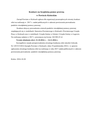 Konkurs na bezpłatną pomoc prawną w Powiecie Kieleckim Zarząd Powiatu w Kielcach ogłasza dla organizacji pozarządowych otwarty konkurs ofert na realizację w 2017 r. zadań publicznych w zakresie powierzenia prowadzenia punktów nieodpłatnej pomocy prawnej. Konkurs dotyczy prowadzenia czterech punktów nieodpłatnej pomocy prawnej znajdujących się w siedzibach: Starostwa Powiatowego w Kielcach i Powiatowego Urzędu Pracy w Kielcach oraz w siedzibach: Urzędu Gminy w Górnie i Urzędu Gminy w Łagowie. Na realizację zadania w 2017 r. przeznacza się kwotę: 242.903,52 zł. Termin składania ofert: 21.10.2016 r. – 14.11.2016 r. Szczegółowe zasady przeprowadzenia otwartego konkursu ofert określa Uchwała Nr 129/315/2016 Zarządu Powiatu w Kielcach z dnia 19 października 2016 r. w sprawie ogłoszenia otwartego konkursu ofert na realizację w roku 2017 zadań publicznych w zakresie powierzenia prowadzenia punktów nieodpłatnej pomocy prawnej. Kielce: 2016-10-20