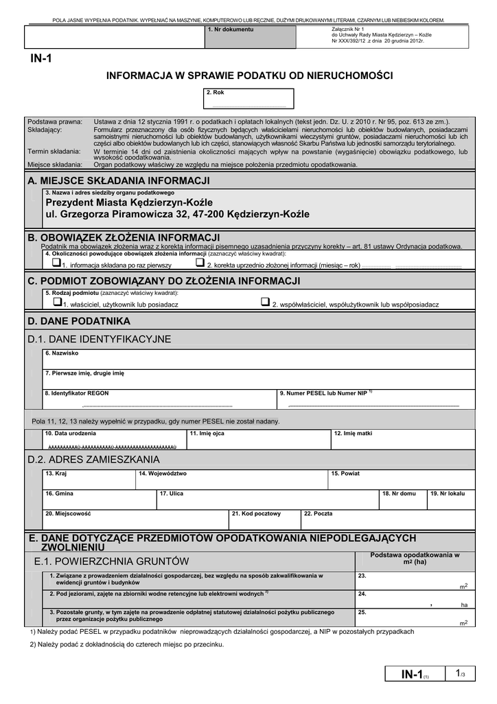 POLA JASNE WYPEŁNIA PODATNIK. WYPEŁNIAĆ NA MASZYNIE, KOMPUTEROWO LUB RĘCZNIE, DUŻYMI DRUKOWANYMI LITERAMI, CZARNYM LUB NIEBIESKIM KOLOREM. Załącznik Nr 1 do Uchwały Rady Miasta Kędzierzyn – Koźle Nr XXX/392/12 .z dnia 20 grudnia 2012r. 1. Nr dokumentu IN-1 INFORMACJA W SPRAWIE PODATKU OD NIERUCHOMOŚCI 2. Rok ;;;;;;;;;;;;;;;;;;;;;;;;;;;;;;;;;;;;;;;;;;;;;;;;;;;;;;;;;;;;; Podstawa prawna: Składający: Termin składania: Miejsce składania: Ustawa z dnia 12 stycznia 1991 r. o podatkach i opłatach lokalnych (tekst jedn. Dz. U. z 2010 r. Nr 95, poz. 613 ze zm.). Formularz przeznaczony dla osób fizycznych będących właścicielami nieruchomości lub obiektów budowlanych, posiadaczami samoistnymi nieruchomości lub obiektów budowlanych, użytkownikami wieczystymi gruntów, posiadaczami nieruchomości lub ich części albo obiektów budowlanych lub ich części, stanowiących własność Skarbu Państwa lub jednostki samorządu terytorialnego. W terminie 14 dni od zaistnienia okoliczności mających wpływ na powstanie (wygaśnięcie) obowiązku podatkowego, lub wysokość opodatkowania. Organ podatkowy właściwy ze względu na miejsce położenia przedmiotu opodatkowania. A. MIEJSCE SKŁADANIA INFORMACJI 3. Nazwa i adres siedziby organu podatkowego Prezydent Miasta Kędzierzyn-Koźle ul. Grzegorza Piramowicza 32, 47-200 Kędzierzyn-Koźle B. OBOWIĄZEK ZŁOŻENIA INFORMACJI Podatnik ma obowiązek złożenia wraz z korektą informacji pisemnego uzasadnienia przyczyny korekty – art. 81 ustawy Ordynacja podatkowa. 4. Okoliczności powodujące obowiązek złożenia informacji (zaznaczyć właściwy kwadrat): 1. informacja składana po raz pierwszy 2. korekta uprzednio złożonej informacji (miesiąc – rok) ;;;;;;;;;;;;;;;;;;;;;;;; ;;;;;;;;;;;;;;;;;;;;;;;;;;;;;;;;;;;;;;;;;;;;;;;;;;;;;;; C. PODMIOT ZOBOWIĄZANY DO ZŁOŻENIA INFORMACJI 5. Rodzaj podmiotu (zaznaczyć właściwy kwadrat): 1. właściciel, użytkownik lub posiadacz 2. współwłaściciel, współużytkownik lub współposiadacz D. DANE PODATNIKA D.1. DANE IDENTYFIKACYJNE 6. Nazwisko 7. Pierwsze imię, drugie imię 9. Numer PESEL lub Numer NIP 1) 8. Identyfikator REGON ‘’’’’’’’’’’’’’’’’’’’’’’’’’’’’’’’’’’’’’’’’’’’’’’’’’’’’’’’’’’’’’’’’’’’’’’’’’’’’’’’’’’’’’’’’’’’’’’’’’’’’’’’’’’’’’’’’’’’’’’’’’’’’’’’’’’’’’’’’’’’’’ ‘’’’’’’’’’’’’’’’’’’’’’’’’’’’’’’’’’’’’’’’’’’’’’’’’’’’’’’’’’’’’’’’’’’’’’’’’’’’’’’’’’’’’’’’’’’’’’’’’’’’’’’’’’’ Pola 11, 12, 13 należy wypełnić w przypadku, gdy numer PESEL nie został nadany. 10. Data urodzenia 11. Imię ojca 12. Imię matki ÀÄÄÄÄÁÄÄÄÄÙ-ÀÄÄÄÄÁÄÄÄÄÙ-ÀÄÄÄÄÁÄÄÄÄÁÄÄÄÄÁÄÄÄÄÙ D.2. ADRES ZAMIESZKANIA 13. Kraj 16. Gmina 14. Województwo 15. Powiat 17. Ulica 20. Miejscowość 18. Nr domu 21. Kod pocztowy 19. Nr lokalu 22. Poczta E. DANE DOTYCZĄCE PRZEDMIOTÓW OPODATKOWANIA NIEPODLEGAJĄCYCH ZWOLNIENIU Podstawa opodatkowania w m2 (ha) E.1. POWIERZCHNIA GRUNTÓW 1. Związane z prowadzeniem działalności gospodarczej, bez względu na sposób zakwalifikowania w ewidencji gruntów i budynków 2. Pod jeziorami, zajęte na zbiorniki wodne retencyjne lub elektrowni wodnych 2) 23. m2 24. , 3. Pozostałe grunty, w tym zajęte na prowadzenie odpłatnej statutowej działalności pożytku publicznego przez organizacje pożytku publicznego ha 25. m2 1) Należy podać PESEL w przypadku podatników nieprowadzących działalności gospodarczej, a NIP w pozostałych przypadkach 2) Należy podać z dokładnością do czterech miejsc po przecinku. IN-1 (1) 1/3 POLA JASNE WYPEŁNIA PODATNIK. WYPEŁNIAĆ NA MASZYNIE, KOMPUTEROWO LUB RĘCZNIE, DUŻYMI DRUKOWANYMI LITERAMI, CZARNYM LUB NIEBIESKIM KOLOREM. E.2. POWIERZCHNIA BUDYNKÓW LUB ICH CZĘŚCI Podstawa opodatkowania w m2 1. Mieszkalne - ogółem 26. - od 1,40 do 2,20 m (zaliczyć 50% powierzchni) 27. - powyżej 2,20 m 28. m2 w tym kondygnacji o wysokości: m2 m2 2. Związane z prowadzeniem działalności gospodarczej oraz części budynków mieszkalnych zajęte na prowadzenie działalności gospodarczej - ogółem 29. m2 w tym kondygnacji o wysokości: - od 1,40 do 2,20 m (zaliczyć 50% powierzchni) 30. - powyżej 2,20 m 31. m2 m2 3. Zajęte na prowadzenie działalności gospodarczej w zakresie obrotu kwalifikowanym materiałem siewnym ogółem w tym kondygnacji o wysokości: m2 - od 1,40 do 2,20 m (zaliczyć 50% powierzchni) 33. - powyżej 2,20 m 34. m2 m2 4. Związane z udzielaniem świadczeń zdrowotnych w rozumieniu przepisów o działalności leczniczej, zajęte przez podmioty udzielające tych świadczeń - ogółem w tym kondygnacji o wysokości: 32. 35. m2 - od 1,40 do 2,20 m (zaliczyć 50% powierzchni) 36. - powyżej 2,20 m 37. m2 m2 5. Gospodarczych wykorzystywanych na potrzeby bytowe mieszkańców (przechowywanie opału, narzędzi domowych lub ogrodniczych, płodów rolnych, stodoły, kurniki, chlewy, stajnie, obory) 39. m2 w tym kondygnacji o wysokości: od 1,40 do 2,20 m (zaliczyć 50% powierzchni) 40. m2 - powyżej 2,20 m 41. 6. Pozostałe, w tym zajętych na prowadzenie odpłatnej statutowej działalności pożytku publicznego przez organizacje pożytku publicznego – ogółem w tym kondygnacji o wysokości: od 1,40 do 2,20 m (zaliczyć 50% powierzchni) m2 42. m2 43. m2 - powyżej 2,20 m 44 m2 E.3. WARTOŚĆ BUDOWLI LUB ICH CZĘŚCI ZWIĄZANYCH Z PROWADZENIEM DZIAŁALNOŚCI GOSPODARCZEJ Podstawa opodatkowania w zł* 1.. stanowiących sieci w rozumieniu ustawy z dnia 7 czerwca 2001r. o zbiorowym zaopatrzeniu w wodę i zbio