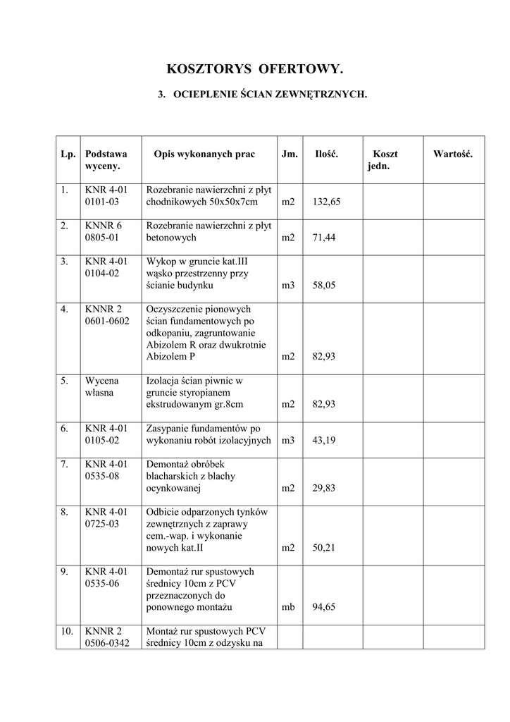 KOSZTORYS OFERTOWY. 3. OCIEPLENIE ŚCIAN ZEWNĘTRZNYCH. Lp. Podstawa wyceny. 1. 2. 3. 4. 5. 6. 7. 8. 9. 10. Opis wykonanych prac Jm. Ilość. KNR 4-01 0101-03 Rozebranie nawierzchni z płyt chodnikowych 50x50x7cm m2 132,65 KNNR 6 0805-01 Rozebranie nawierzchni z płyt betonowych m2 71,44 KNR 4-01 0104-02 Wykop w gruncie kat.III wąsko przestrzenny przy ścianie budynku m3 58,05 Oczyszczenie pionowych ścian fundamentowych po odkopaniu, zagruntowanie Abizolem R oraz dwukrotnie Abizolem P m2 82,93 Izolacja ścian piwnic w gruncie styropianem ekstrudowanym gr.8cm m2 82,93 KNR 4-01 0105-02 Zasypanie fundamentów po wykonaniu robót izolacyjnych m3 43,19 KNR 4-01 0535-08 DemontaŜ obróbek blacharskich z blachy ocynkowanej m2 29,83 Odbicie odparzonych tynków zewnętrznych z zaprawy cem.-wap. i wykonanie nowych kat.II m2 50,21 DemontaŜ rur spustowych średnicy 10cm z PCV przeznaczonych do ponownego montaŜu mb 94,65 KNNR 2 0601-0602 Wycena własna KNR 4-01 0725-03 KNR 4-01 0535-06 KNNR 2 0506-0342 MontaŜ rur spustowych PCV średnicy 10cm z odzysku na Koszt jedn. Wartość. nowych uchwytach po wykonaniu ocieplenia 11. 12. 13. 14. 15. 16. 17. mb 94,65 KNR 4-01 0354-04 Wykucie z muru drabiny stalowej na elewacji frontowej m2 2,4 Analiza własna Osadzenie w licu ściany kratek wentylacyjnych stalowych o wym. 30/30cm szt 4 Analiza własna DemontaŜ i ponowny montaŜ kamer instalacji alarmowej szt 7 Analiza własna DemontaŜ i ponowny montaŜ instalacji odgromowej na ścianie z drutu ocynkowanego sr.8mm w rurze osłonowej śr.18mm z PCV. Wymiana złączy kontrolnych. Połączenie instalacji z przewodami na dachu. Wykonanie pomiarów instalacji, dostarczenie protokołów inwestorowi. mb 100,26 Ocieplenie ścian metodą lekką mokrą płytami styropianowymi EPS 70 felcowanymi gr.10cm z przygotowaniem i zagruntowaniem starego podłoŜa, wykonaniem wyprawy z zaprawy akrylowej gr.2mm. W naroŜach ułoŜyć listwy aluminiowe. Siatka podwójna do wysokości 1,6m m2 945,68 KNNR 2 1902-1102 Dopłata za listwy cokołowe aluminiowe mb 71,14 KNR 2-02 2624-0501 Ocieplenie ościeŜy szer.15cm styropianem EPS 70 gr.3cm metodą lekką mokrą z przygotowaniem i zagruntowaniem starego podłoŜa, wykonaniem wyprawy akrylowej gr.2mm i ułoŜeniem naroŜników ochronnych. m2 177,03 KNR 2-02 2624-0301 18. 19. 20. 21. 22. 23. 24. 25. 26. Wycena własna Dodatek za wykonanie w styropianie obramienia 6x2cm wokół okien w kolorze białym mb 583,54 Wycena własna Dodatek za wykonanie boni w poziomie okien II p. 63,5 KNNR 2 1902-05 analogia Izolacja płyt balkonowych od spodu i ścian między balkonami styropianem EPS 70 gr.5cm z przygotowaniem i zagruntowaniem starego podłoŜa i wykonaniem wyprawy akrylowej gr.2mm. W naroŜach ułoŜyć kątowniki aluminiowe m2 315,03 ObłoŜenie styropianem EPS 70 gr.3cm czół: balkonów, ścian między balkonami i gzymsów metodą lekką mokrą z przygotowaniem i zagruntowaniem starego podłoŜa z ułoŜeniem naroŜników ochronnych, wykonaniem wyprawy akrylowej gr.2mm m2 67,89 Licowanie cokołu płytkami 25x6cm w kolorze brązowym na zaprawie klejowej mrozoodpornej m2 255,98 Wykonanie parapetów okien piwnic z kształtek podokiennych w kolorze brązu mb 22,3 KNR 2-02 2624-0501 KNNR 2 1002-01 analogia Wycena własna KNR 2-02 1120-02 KNR 2-02 1121-05 KNR 2-02 1118-0805 m2 Cokół na balkonach z płytki w kolorze brązowym wys.10cm na zaprawie mrozoodpornej mb 137,75 Okładziny schodów z płytek gres o wymiarach 30x30cm ryflowanych, na kleju mrozoodpornym 10,96 m2 Podesty schodów z płytek gres układanych na klej mrozoodporny metodą zwykłą m2 4,59 27. 28. 29. 30. 31. 32. 33. 34. 35. 36. 37. 38. KNR 4-01 0533-03 Sprawdzenie obróbki blacharskiej fartucha na gzymsie, daszka nad balkonami oraz wyprostowanie i polutowanie drobnych uszkodzeń m2 95,58 Obróbki blacharskie z blachy powlekanej w kolorze białym o szerokości w rozwinięciu ponad 25cm m2 41,17 Podsypka z piasku zagęszczona mechanicznie gr.10cm m2 197,97 Opaska z kostki brukowej betonowej gr.6cm kolorowej, układanej na podsypce piaskowej, spoiny wypełnione piaskiem m2 197,97 ObrzeŜa betonowe o wym. 30x8cm na podsypce cementowo-piaskowej, spoiny wypełnione zaprawą cementową. mb 109,63 Malowanie farbą ftalową balustrad na tarasach, balkonach, schodach m2 163,54 KNR 2-02 1604-01 Rusztowania rurowe o wys. do 10,0m m2 173,4 KNR 2-02 1604-03 Rusztowanie rurowe o wysokości do 20m m2 637,0 KNR 4-01 0108-17 Wywóz gruzu samochodem na odległość 1 km m3 50,73 KNR 4-01 0108-02 Dopłata do wywozu za kaŜdy następny 1 km- krotność 7 m3 50,73 KNR 4-01 0108-05 Wywóz nadmiaru ziemi z wykopów na wysypisko na odległość 1 km m3 14,86 Dopł. za kaŜdy następny 1km wywozu ziemi-krotnośc 7 m3 14,86 NNRNKB 2-02 0541-02 KNNR 6 0106-05 KNNR 6 0502-0101 KNNR 6 0404-05 KNR 4-01 1212-0401 KNR 4-01 0108-08 39. Dopłata za przyjęcie gruzu. Razem. m3 65,59