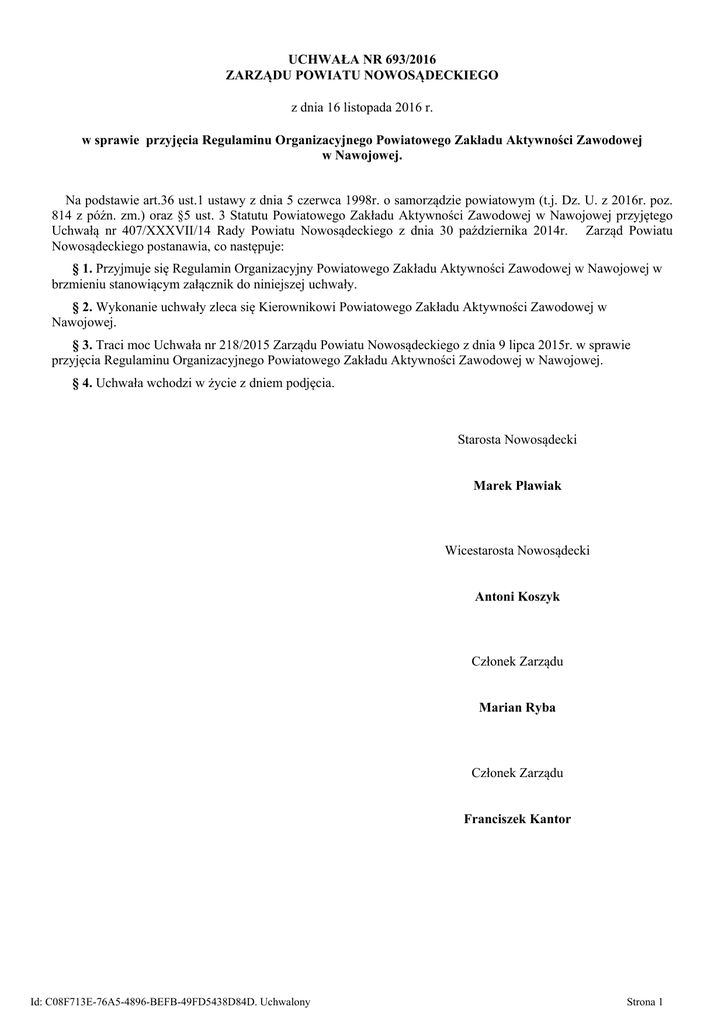 UCHWAŁA NR 693/2016 ZARZĄDU POWIATU NOWOSĄDECKIEGO z dnia 16 listopada 2016 r. w sprawie przyjęcia Regulaminu Organizacyjnego Powiatowego Zakładu Aktywności Zawodowej w Nawojowej. Na podstawie art.36 ust.1 ustawy z dnia 5 czerwca 1998r. o samorządzie powiatowym (t.j. Dz. U. z 2016r. poz. 814 z późn. zm.) oraz §5 ust. 3 Statutu Powiatowego Zakładu Aktywności Zawodowej w Nawojowej przyjętego Uchwałą nr 407/XXXVII/14 Rady Powiatu Nowosądeckiego z dnia 30 października 2014r. Zarząd Powiatu Nowosądeckiego postanawia, co następuje: § 1. Przyjmuje się Regulamin Organizacyjny Powiatowego Zakładu Aktywności Zawodowej w Nawojowej w brzmieniu stanowiącym załącznik do niniejszej uchwały. § 2. Wykonanie uchwały zleca się Kierownikowi Powiatowego Zakładu Aktywności Zawodowej w Nawojowej. § 3. Traci moc Uchwała nr 218/2015 Zarządu Powiatu Nowosądeckiego z dnia 9 lipca 2015r. w sprawie przyjęcia Regulaminu Organizacyjnego Powiatowego Zakładu Aktywności Zawodowej w Nawojowej. § 4. Uchwała wchodzi w życie z dniem podjęcia. Starosta Nowosądecki Marek Pławiak Wicestarosta Nowosądecki Antoni Koszyk Członek Zarządu Marian Ryba Członek Zarządu Franciszek Kantor Id: C08F713E-76A5-4896-BEFB-49FD5438D84D. Uchwalony Strona 1 Załącznik nr 1 do Uchwały nr 693/2016 Zarządu Powiatu Nowosądeckiego z dnia 16 listopada 2016r. Rozdział 1. Postanowienia ogólne. §1. 1. Regulamin określa zasady wewnętrznej organizacji oraz strukturę i zakres działania komórek organizacyjnych Zakładu. Ilekroć w regulaminie, bez bliższego określenia jest mowa o: 1) Ustawie – rozumie się przez to ustawę z dnia 27 sierpnia 1997r. o rehabilitacji zawodowej i społecznej oraz zatrudnianiu osób niepełnosprawnych (t.j. Dz.U. z 2011r. nr 127 poz.721 z późn.zm.), 1) Rozporządzeniu – rozumie się przez to Rozporządzenie Ministra Pracy i Polityki Społecznej z dnia 17 lipca 2012r. w sprawie zakładów aktywności zawodowej (Dz.U. z 2012r. Poz 850), 2) Zakładzie – rozumie się przez to Powiatowy Zakład Aktywności Zawodowej w Nawojowej, 3) Kierowniku – rozumie się przez to Dyrektora Powiatowego Zakładu Aktywności Zawodowej w Nawojowej, 4) Organizatorze - rozumie się przez to Powiat Nowosądecki, 5) Osobach niepełnosprawnych – rozumie się przez to osoby niepełnosprawne zaliczane do znacznego stopnia niepełnosprawności oraz umiarkowanego stopnia niepełnosprawności u których stwierdzono autyzm, upośledzenie umysłowe lub chorobę psychiczną, 6) Regulaminie – rozumie się przez to niniejszy regulamin, 7) Działach - rozumie się przez to komórki organizacyjne wchodzące w skład Zakładu, 8) Sekcjach – rozumie się przez to komórki organizacyjne wchodzące w skład działów Zakładu. §2. Zakład jest samorządowym zakładem budżetowym, działającym w szczególności w oparciu o Ustawę, Rozporządzenie oraz: 1) Ustawę z dnia 5 czerwca 1998r. o samorządzie powiatowym (t.j. Dz. U. z 2016r. poz. 814 z późn. zm.), 1) Ustawę z dnia 29 września 1994r. o rachunkowości (Dz. U. z 2016r. poz. 1047), 2) Ustawę z dnia 27 sierpnia 2009r. o finansach publicznych (Dz.U. z 2013r. poz. 885 z późn.zm.) 3) Niniejszy Regulamin. §3. 1. Nadzór nad działalnością Zakładu sprawuje Zarząd Powiatu Nowosądeckiego. 2. Siedziba Zakładu mieści się w Nawojowej przy ul. Podkamienne 10, 33-335 Nawojowa. §4. Zakład prowadzi gospodarkę finansową według zasad określonych w ustawie o finansach publicznych. §5. 1. Oświadczenie woli w imieniu Zakładu składa Kierownik. 2. Oświadczenie woli wymaga każdorazowo kontrasygnaty Głównego Księgowego, jeżeli powodowałoby to powstanie zobowiązań majątkowych. Id: C08F713E-76A5-4896-BEFB-49FD5438D84D. Uchwalony Strona 2 Rozdział 2. Cele i zadania Zakładu §6. Celem Zakładu jest zatrudnienie osób niepełnosprawnych. §7. Do zadań Zakładu należy w szczególności: a) przygotowywanie poprzez aktywizację zawodową i społeczną do życia osób niepełnosprawnych w otwartym środowisku, a) pomoc w realizacji pełnego, niezależnego, samodzielnego i aktywnego życia na miarę indywidualnych możliwości osób niepełnosprawnych, b) zabezpieczenie usług rehabilitacyjnych, c) umożliwienie korzystania z usług medycznych, w tym specjalistycznych świadczonych przez zakłady opieki zdrowotnej, d) prowadzenie działalności szkoleniowej na rzecz pracowników, e) organizowanie działalności szkoleniowej na rzecz pracowników. §8. 1. Liczba osób niepełnosprawnych zaliczanych do znacznego i umiarkowanego stopnia niepełnosprawności w stosunku do ogółu zatrudnionych w Zakładzie stanowi minimum 70%. 2. Zakład pracuje w oparciu o program rehabilitacji zawodowej, społecznej i leczniczej opracowany przez zespół programowy powołany przez Kierownika. Rozdział 3. Organizacja wewnętrzna Zakładu §9. 1. Całokształtem działalności Zakładu kieruje Kierownik i ponosi za nią pełną odpowiedzialność. 2. Kierownika Zakładu zatrudnia i zwalnia Zarząd Powiatu Nowosądeckiego. 2. Zwierzchnikiem służbowym Kierownika jest Starosta Nowosądecki. 3. Kierownik w stosunku do pracowników Zakładu wykonuje obowiązki pracodawcy w rozumieniu przepisów Kodeksu Pracy. 4. Kierownik kieruje działalnością Zakładu przy pomocy Głównego Księgowego i pracowników komórek organizacyjnych. 5. Kierownika, w czasie jego nieobecności zastępuje osoba przez niego upoważniona. 6. Zakres zastępstwa obejmuje wszystkie zadania i kompetencje Kierownika. 7. Dla zapewnienia racjonalnej organizacji pracy w Zakładzie tworzy się następujące komórki organizacyjne: 1) Dział wytwórczo-usługowy, w skład którego wchodzą sekcje: hodowlana, ogrodnicza oraz poligraficzno -fotograficzna. W ramach wymienionych sekcji Zakład będzie prowadził działalność o charakterze publicznym a w szczególności: a) Organizację i obsługę wszelkich imprez w tym: okolicznościowych, szkoleniowych, rekreacyjnych, konferencji b) Organ