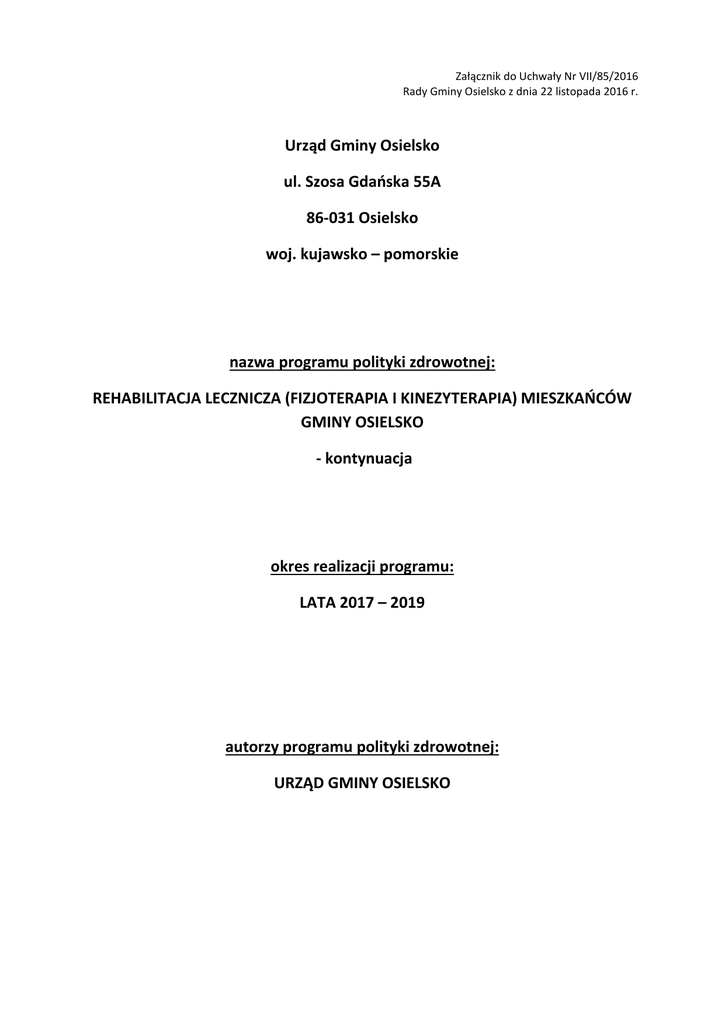 Załącznik do Uchwały Nr VII/85/2016 Rady Gminy Osielsko z dnia 22 listopada 2016 r. Urząd Gminy Osielsko ul. Szosa Gdaoska 55A 86-031 Osielsko woj. kujawsko – pomorskie nazwa programu polityki zdrowotnej: REHABILITACJA LECZNICZA (FIZJOTERAPIA I KINEZYTERAPIA) MIESZKAOCÓW GMINY OSIELSKO - kontynuacja okres realizacji programu: LATA 2017 – 2019 autorzy programu polityki zdrowotnej: URZĄD GMINY OSIELSKO I. Opis problemu zdrowotnego 1. Problem zdrowotny Program polityki zdrowotnej „Rehabilitacja lecznicza (fizjoterapia i kinezyterapia) mieszkańców gminy Osielsko” dotyczy osób zarówno z przewlekłymi jak i pourazowymi schorzeniami narządów ruchu, układu kostnego i mięśniowego, centralnego układu nerwowego, obwodowego układu nerwowego, takimi jak między innymi: zapalenie stawów (reumatoidalne, młodzieńcze, przewlekłe, reaktywne, łuszczycowe, zesztywniające zapalenie kręgosłupa), zmiany zapalne stawów o podłożu metabolicznym – dna moczanowa, przewlekłe zapalenie kręgosłupa szyjnego, zespół bolesnego barku, zespół bolesnego łokcia, zapalenie okołostawowe ścięgien, torebki stawowej i mięśni, zespół fibromialgii (choroby reumatyczne tkanek miękkich), choroba zwyrodnieniowa stawów, choroba zwyrodnieniowa kręgosłupa, choroba Sudecka, osteoporoza, zwichnięcie i skręcenie urazowe stawów, uszkodzenie łąkotki, naderwanie i uszkodzenie więzadeł, ścięgien i mięśni, ostrogi piętowe, rwa kulszowa i barkowa, martwica kości, stany po leczeniu operacyjnym (stawy biodrowe, barkowe, kolanowe), stany po leczeniu operacyjnym kręgosłupa, stany poudarowe mózgu, stany pourazowe kończyn, przewlekłe i podostre stany zapalne nerwów obwodowych, mięśniobóle, nerwobóle, neuralgie, przykurcze, zwalczanie przewlekłego i patologicznego bólu (zachowawczo), zwalczanie odruchowej i ośrodkowej spastyczności mięśni w procesie rehabilitacji neurologicznej, zmiany skórne, przewlekłe stany zapalne jamy nosowej i zatok, ostre i zadawnione urazy sportowe, przemęczenie fizyczne i psychiczne osób dorosłych. 2. Epidemiologia Program polityki zdrowotnej „Rehabilitacja lecznicza (fizjoterapia i kinezyterapia) mieszkańców gminy Osielsko” oparto na priorytetach zdrowotnych ustalonych w Rozporządzeniu Ministra Zdrowia z dnia 21 sierpnia 2009r. (Dz.U. Nr 137, poz. 1126), mając szczególnie na uwadze zmniejszenie przedwczesnej zachorowalności i ograniczenie negatywnych skutków przewlekłych schorzeń układu kostno – stawowego, ograniczenie skutków urazów powstałych w wyniku wypadków (w szczególności poprzez skuteczną rehabilitację osób poszkodowanych), a także zmniejszenie zachorowalności, przedwczesnej umieralności i łagodzenia skutków chorób centralnego i obwodowego układu nerwowego, ograniczanie skutków zdrowotnych spowodowanych czynnikami szkodliwymi w środowisku pracy i zamieszkania oraz poprawę jakości i skuteczności opieki geriatrycznej nad pacjentem w wieku podeszłym. Epidemiologia niektórych schorzeń objętych programem zdrowotnym została opracowana na podstawie danych ogólnych oraz danych uzyskanych od lekarzy Samodzielnego Publicznego ZOZ „Gminna Przychodnia” w Osielsku, która świadczy POZ dla większości mieszkańców gminy. Choroba / schorzenie Epidemiologia (dane ogólne) Epidemiologia (dane lokalne) reumatoidalne zapalenie stawów Częstość występowania waha się od 0,5% do 1,5%. Częściej dotyczy kobiet niż mężczyzn – w proporcji 3:1. Choroba pojawia się w 30 – 55 roku życia. Skutkuje postępującą niesprawnością. Prawie u połowy chorych obserwuje się znacznie pogorszoną funkcjonalność w ciągu 10 lat trwania choroby. (2010 International Association for the Study of Pain) Występuje do 16 roku życia. Około 1% pacjentów Gminnej Przychodni Występuje szczególnie u mężczyzn. Początek przypada na 15-30 rok życia. (Balneologia Polska; 68-78, „Miejsce fizjoterapii w reumatologii”, Włodzimierz Samborski) Występuje częściej u mężczyzn (90%) między 40-50 rokiem życia. Często współistnieje z otyłością, cukrzycą, chorobą wieńcową, nadciśnieniem tętniczym (Balneologia Polska; 68-78, „Miejsce fizjoterapii w reumatologii”, Włodzimierz Samborski) Około 1% pacjentów Gminnej Przychodni młodzieńcze zapalenie stawów zesztywniające zapalenie kręgosłupa dna moczanowa zapalenie okołostawowe ścięgien, torebki stawowej i mięśni choroby reumatyczne tkanek miękkich (zespół bolesnego barku, zespół bolesnego łokcia, ostrogi Bardzo rzadkie przypadki Około 2-3% pacjentów Gminnej Przychodni Około 5 % pacjentów Gminnej Przychodni Czynnikami predysponującymi są: zaawansowany wiek, wady budowy, wady postawy, częste przeciążenia, mikrourazy, a także czynniki psychologiczne. Około 8 -12% pacjentów Gminnej Przychodni piętowe, zespół fibromialgii) choroba zwyrodnieniowa stawów choroba zwyrodnieniowa kręgosłupa choroba Sudecka osteoporoza Fibromialgia występuje około 9krotnie częściej u kobiet. (Balneologia Polska; 68-78, „Miejsce fizjoterapii w reumatologii”, Włodzimierz Samborski) Na wystąpienie choroby mają wpływ czynniki ryzyka ogólne (zaawansowany wiek, predyspozycje genetyczne, otyłość) oraz miejscowe, takie jak np.: niestabilność stawu, wrodzony lub nabyty nieprawidłowy kształt stawu, uraz, szczególny rodzaj aktywności fizycznej (Balneologia Polska; 68-78, „Miejsce fizjoterapii w reumatologii”, Włodzimierz Samborski) Na wystąpienie choroby mają wpływ czynniki ryzyka ogólne (zaawansowany wiek, predyspozycje genetyczne, otyłość), oraz miejscowe, takie jak np.: uraz, szczególny rodzaj aktywności fizycznej (Balneologia Polska; 68-78, „Miejsce fizjoterapii w reumatologii”, Włodzimierz Samborski) Występuje z taką samą częstotliwością u obu płci, może pojawić się w każdym wieku, także w dzieciństwie. Przeważnie zajęta jest kończyna górna (59%). Najczęstszą przyczyną jest złamani