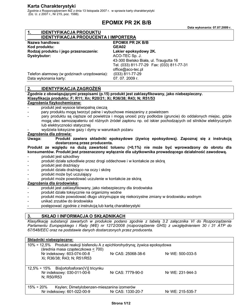 Karta Charakterystyki Zgodnie z Rozporządzeniem MZ z dnia 13 listopada 2007 r. w sprawie karty charakterystyki (Dz. U. z 2007 r., Nr 215, poz. 1588). EPOMIX PR 2K B/B Data wykonania: 07.07.2009 r. 1. IDENTYFIKACJA PRODUKTU IDENTYFIKACJA PRODUCENTA I IMPORTERA Nazwa handlowa: Kod produktu: Rodzaj produktu i jego przeznaczenie: Dystrybutor: Telefon alarmowy (w godzinach urzędowania): Data wykonania karty: 2. EPOMIX PR 2K B/B GEA02 Lakier epoksydowy 2K. ACO-TEC Sp. J. 43-300 Bielsko Biała, ul. Traugutta 16 Tel. (033) 811-77-29 Fax: (033) 811-77-31 [email protected] (033) 811-77-29 07. 07. 2009 r. IDENTYFIKACJA ZAGROŻEŃ Zgodnie z obowiązującymi przepisami (p.15) produkt jest zaklasyfikowany, jako niebezpieczny. Klasyfikacja produktu: F; R11; Xn; R20/21; Xi; R36/38; R43; N; R51/53 Zagrożenia fizykochemiczne: produkt jest wysoce łatwopalną cieczą pary produktu mogą tworzyć palne i wybuchowe mieszaniny z powietrzem pary produktu są cięższe od powietrza i mogą unosić przy podłodze (gruncie) do oddalonych miejsc, gdzie mogą ulec samozapaleniu od różnych źródeł zapłonu np. od iskier pochodzących od silników elektrycznych lub elektryczności statycznej wydziela toksyczne gazy i dymy w warunkach pożaru Zagrożenia dla zdrowia: Uwaga: Produkt zawiera składniki epoksydowe (żywicę epoksydową). Zapoznaj się z instrukcją dostarczoną przez producenta. Produkt ze względu na dużą zawartość toluenu (>0,1%) nie może być wprowadzony do obrotu dla konsumentów. Produkt jest przeznaczony wyłącznie dla użytkownika prowadzącego działalność zawodową. produkt jest szkodliwy produkt działa szkodliwie przez drogi oddechowe i w kontakcie ze skórą produkt jest drażniący produkt działa drażniąco na oczy i skórę produkt może być uczulający produkt może powodować uczulenie w kontakcie ze skórą Zagrożenia dla środowiska: produkt jest zaklasyfikowany, jako niebezpieczny dla środowiska produkt działa toksycznie na organizmy wodne produkt może powodować długo utrzymujące się niekorzystne zmiany w środowisku wodnym unikać zrzutów do środowiska postępować zgodnie z instrukcją lub kartą charakterystyki 3. SKŁAD I INFORMACJA O SKŁADNIKACH Klasyfikację substancji zawartych w produkcie podano zgodnie z tabelą 3.2 załącznika VI do Rozporządzenia Parlamentu Europejskiego i Rady (WE) nr 1272/2008 (rozporządzenie GHS) z uwzględnieniem 30 i 31 ATP do 67/548/EEC oraz na podstawie danych dostarczonych przez producenta. Składniki niebezpieczne: 10% ÷ 12,5% Produkt reakcji bisfenolu A z epichlorohydryną; żywica epoksydowa (średnia masa cząsteczkowa < 700) Nr indeksowy: 603-074-00-8 Nr CAS: 25068-38-6 Nr WE: 500-033-5 Xi; R36/38; R43; N; R51/R53 12,5% ÷ 15% Bis[ortofosforan(V)] tricynku Nr indeksowy: 030-011-00-6 N; R50/R53 Nr CAS: 7779-90-0 Nr WE: 231-944-3 15% ÷ 20% Ksylen; Dimetylobenzen-mieszanina izomerów Nr indeksowy: 601-022-00-9 Nr CAS: 1330-20-7 Nr WE: 215-535-7 Strona 1/12 Karta Charakterystyki Zgodnie z Rozporządzeniem MZ z dnia 13 listopada 2007 r. w sprawie karty charakterystyki (Dz. U. z 2007 r., Nr 215, poz. 1588). EPOMIX PR 2K B/B Data wykonania: 07.07.2009 r. R10; Xn; R20/21; Xi; R38 7% ÷ 10% Octan 2-metoksy-1-metyloetylu Nr indeksowy: 607-195-00-7 Nr CAS: 108-65-6 R10; Xi; R36 Nr WE: 203-603-9 3% ÷ 5% Octan izobutylu; Ester izobutylowy kwasu octowego Nr indeksowy: 607-026-00-7 Nr CAS: 110-19-0 F; R11; R66 Nr WE: 203-745-1 3% ÷ 5% Toluen; Metylobenzen Nr indeksowy: 601-021-00-3 Nr CAS: 108-88-3 Substancja działająca szkodliwie na rozrodczość (rozwój płodu) kategorii 3. F; R11; Xn; R48/20; R63; R65; Xi; R38; R67 Nr WE: 203-625-9 1% ÷ 3% Butan-2-on; Butanon; Keton etylowo-metylowy; MEK Nr indeksowy: 606-002-00-3 Nr CAS: 78-93-3 F; R11; Xi; R36; R66; R67 Nr WE: 201-159-0 0,25% ÷ 0,5% Alkohol izobutylowy; Izobutanol; 2-metylopropan-1-ol Nr indeksowy: 603-108-00-1 Nr CAS: 78-83-1 R10; Xi; R37/38; R41; R67 Nr WE: 201-148-0 0,1% ÷ 0,25% Etanol Nr indeksowy: 603-002-00-5 F; R11 Nr WE: 200-578-6 Nr CAS: 64-17-5 Znaczenie symboli i treść zwrotów R – patrz p. 16 4. PIERWSZA POMOC Wskazania ogólne: W przypadku wystąpienia jakichkolwiek niepokojących objawów wezwać natychmiast lekarza lub odwieźć poszkodowanego do szpitala, pokazać opakowanie produktu, etykietę lub kartę charakterystyki. Pierwsza pomoc przy narażeniu inhalacyjnym: osobę poszkodowaną przenieść do dobrze wentylowanego pomieszczenia osobę poszkodowaną umieścić w pozycji półleżącej, rozluźnić ubranie w przypadku wystąpienia trudności w oddychaniu podać tlen zwrócić się o pomoc lekarską Pierwsza pomoc przy skażeniu oczu: skażone oczy płukać, przy otwartych powiekach, ciągłym strumieniem bieżącej wody przez 10 ÷ 15 minut; unikać silnego strumienia wody, który może stworzyć ryzyko uszkodzenia rogówki nie używać żadnych płynów do przemywania oczu ani żadnych maści przed konsultacją medyczną w przypadku, gdy osoba poszkodowana nosi szkła kontaktowe zdjąć je zwrócić się o pomoc lekarska Pierwsza pomoc przy skażeniu skóry: zdjąć zabrudzone ubranie zanieczyszczoną skórę przemyć dużą ilością wody z mydłem w przypadku wystąpienia niepokojących objawów zwrócić się o pomoc lekarską Pierwsza pomoc przy przyjęciu doustnym: u osoby poszkodowanej nie powodować wymiotów wypłukać usta dużą ilością wody osobie poszkodowanej podać do wypicia ciekłą parafinę lub zawiesinę węgla aktywnego w wodzie osobie poszkodowanej nie podawać do wypicia mleka lub olejów roślinnych osobie nieprzytomnej nie podawać nic do ust konieczna pomoc lekarska 5. POSTĘPOWANIE W PRZYPADKU POŻARU Strona 2/12 Karta Charakterystyki Zgodnie z Rozporządzeniem MZ z dnia 13 listopada 2007 r. w sprawie karty charakterystyki (Dz. U. z 2007 r., Nr 215, poz. 1588). EPOMIX PR 2K B/B Data wykonania: 07.07.2009 r. Zagrożenia pożarowe: produkt jest wysoce łatwopalną cieczą pary produktu mogą tworzyć palne i wyb