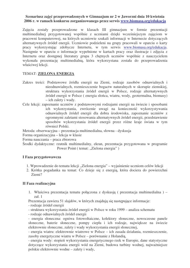 Scenariusz zaj przeprowadzonych w Gimnazjum nr 2 w Jaworzni dnia 10 kwietnia 2006 r. w ramach konkursu zorganizowanego przez serwis www.biomasa.org/edukacja Zaj cia zostały przeprowadzone w klasach III gimnazjum w formie prezentacji multimedialnej przygotowanej wspólnie z uczniami dzi ki wcze niejszym zaj ciom w pracowni komputerowej, na których uczniowie szukali informacji w Internecie dotycz cych alternatywnych ródeł energii. Uczniowie podzieleni na grupy pracowali w oparciu o karty pracy wykorzystuj c zdobycze Internetu, w tym serwis www.biomasa.org/edukacja. Nast pnie w oparciu o informacje wypełnione w kartach pracy oraz ilustracje i zdj cia z Internetu oraz dost pnej literatury grupa 3 ch tnych uczniów wspólnie z nauczycielem wykonała prezentacj multimedialn , która wykorzystana została do przeprowadzenia wła ciwej lekcji. TEMAT: ZIELONA ENERGIA Zakres tre ci: Podstawowe ródła energii na Ziemi, rodzaje zasobów odnawialnych i nieodnawialnych, rozmieszczenie bogactw naturalnych w skorupie ziemskiej, struktura wykorzystania ródeł energii w Polsce, rodzaje alternatywnych ródeł energii w Polsce ( energia sło ca, wiatru, wody, geotermalna, biomasy) – ich zalety i wady. Cele lekcji: zapoznanie uczniów z podstawowymi rodzajami energii na wiecie i sposobami ich wykorzystania, zwrócenie uwagi na konieczno wykorzystywania odnawialnych ródeł energii dla dobra rodowiska, zapoznanie uczniów z ogromnymi zaletami stosowania alternatywnych ródeł energii, przedstawienie sposobów wykorzystania ródeł energii przez ró ne kraje wiata w tym równie Polski. Metoda: obserwacyjna – prezentacja multimedialna, słowna - dyskusja Forma organizacyjna – lekcja w klasie Forma nauczania – praca zbiorowa rodki dydaktyczne: rzutnik multimedialny, ekran, prezentacja przygotowana w programie Power Point ( temat: „Zielona energia” ) I Faza przygotowawcza 1. Wprowadzenie do tematu lekcji „Zielona energia” – wyja nienie uczniom celów lekcji 2. Krótka pogadanka na temat: Co dzieje si z energi , która dociera do powierzchni Ziemi? II Faza realizacyjna 1. Wła ciwa prezentacja tematu poł czona z dyskusj ( prezentacja multimedialna ) – zał. 1 Prezentacja zawiera 51 slajdów, w których znajduj si nast puj ce informacje: - rodzaje ródeł energii - struktura wykorzystania ródeł energii w Polsce w roku 1999 – analiza schematu - rodzaje odnawialnych ródeł energii - energia słoneczna: ogniwa fotowoltaiczne, kolektory słoneczne, nowoczesne panele słoneczne, baterie słoneczne, pompy ciepła i ich rodzaje, najwi ksze na wiecie elektrownie słoneczne, zalety i wady wykorzystania energii słonecznej, - energia wiatru: elektrownie wiatrowe w Polsce – ich zasada działania, rozmieszczenie, zasoby energetyczne wiatru w Polsce – porównanie z Holandi , - energia wody: stopie wykorzystania energetycznego rzek w Europie, dane statystyczne dotycz ce wykorzystania energii wód na Ziemi, budowa turbiny wodnej, najwa niejsze polskie elektrownie wodne – zalety i wady, - energia geotermalna: najwi ksze gejzery wiata, elektrownie geotermalne na wiecie, struktura wykorzystania energii geotermalnej na wiecie – analiza schematu, zalety i wady energii geotermalnej, - energia biomasy: biomasa w postaci stałej, płynnej i gazowej, ro liny energetyczne, zalety biomasy. Faza podsumowuj ca 1. Krótkie podsumowanie polegaj ce na doko czeniu i uzasadnieniu przez ka dego ucznia zdania: Gdybym mógł decydowa o tym z jakich ródeł energii najlepiej korzysta wybrałbym ......................................., poniewa ................................................................. . Zaj cia przeprowadziła mgr Renata Mazur nauczycielka biologii w Gimnazjum nr 2 w Jaworzni