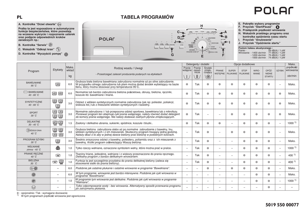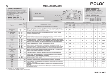 PLTABELA PROGRAMÓW A. Kontrolka “Drzwi otwarte” E. Pokrętło wyboru programów F. Przycisk “Start/Pause” G. Przełącznik prędkośći wirowania H. Wskaźnik przebiegu programu oraz kontrolka opóźnienia czasu startu I. Przycisk “Anulowanie” J. Przycisk “Opóźnienie startu” H Pralka ta jest wyposażona w automatyczne funkcje bezpieczeństwa, które pozwalają na wczesne wykrycie i rozpoznanie usterek oraz podjęcie odpowiednich kroków zaradczych np.: C A B D J B. Kontrolka “Serwis” I Poziom hałasu akustycznego : Pranie - 59 dB(A) / 1 pW Wirowanie - 1400 obr/min 77 dB(A) / 1 pW - 1200 obr/min 75 dB(A) / 1 pW - 1000 obr/min 74 dB(A) / 1 pW C. Wskaźnik “Odkręć kran” D. Kontrolka “Wyczyścić pompę” Program Etykiety G F E Detergenty i dodatki Maks. wklad Rodzaj wsadu / Uwagi - Przestrzegać zaleceń producenta podanych na etykietach kg Pranie Pranie wstêpne zasadnicze Środek zmiêkczający Opcje dodatkowe PRANIE SUPER STOP WSTĘPNE PŁUKANIE PŁUKANIE WIROWANIE OPÓŻNIENIE STARTU SZYBKI Maks. prędkość wirowania obr/min 6.0 Grubsza biała bielizna bawełniana zabrudzona normalnie aż po silne zabrudzenie. W przypadku silnego zabrudzenia lub plam można dodać środek wybielający na bazie tlenu, który można stosować przy temperaturze 95°C. i Tak i i i i i i – Maks. 6.0 Normalnie lub bardzo zabrudzona bielizna pościelowa, obrusy, bielizna, ręczniki, koszule itd. bawełniane i lniane. i Tak i i i i i i i Maks. SYNTETYCZNE 40 - 60 °C 3.0 Odzież z włókien syntetycznych normalnie zabrudzona (jak np: poliester, poliakryl, wiskoza itd.) lub z mieszanki włókien syntetycznych i bawełny. i Tak i i i i i i i Maks. SPORT 30 °C 3.0 Normalnie zabrudzona i / lub przepocona odzież sportowa, bawełniana lub z mikrofazy. Ponieważ program ten obejmuje cykl prania wstępnego, należy również dodać detergent do komory prania wstępnego. Nie należy dodawać żadnych płynów zmiękczających. i Tak – – i i i i i Maks. DELIKATNE 30 - 40 °C 1.5 Zasłony i delikatne ubrania, sukienki, spódnice, koszule i bluzki.. i Tak i i – i i i – 1000 1) 3.0 Grubsza bielizna zabrudzona słabo aż po normalne zabrudzenie z bawełny, lnu, włókien syntetycznych i z ich mieszanek. Skuteczny program trwający jedną godzinę. Należy dbać o to aby w jednej dawce bielizny prać bieliznę w podobnych kolorach. – Tak i – i i i i – Maks. PROGRAM SZYBKI 30 °C 3.0 Średnio zniszczona odzież z bawełny, poliesteru, poliamidu oraz z ich mieszanek z bawełną. Krótki program odświeżający Waszą bieliznę. – Tak i – – i i i – Maks. WEŁNIANE zimna - 40 °C 1.0 Tylko rzeczy wełniane, oznaczone symbolem wełny, które można prać w pralce. – Tak i – – i i i – 1000 1) PRANIE RÊCZNE 40 °C 1.0 – Tak i – – i i i – 400 1) BIELIZNA 30 °C 1.0 Tkaniny lniane, jedwabne, wełniane i z wiskozy przeznaczone do prania rêcznego. Delikatny program z bardzo delikatnym wirowaniem. Funkcja ta jest szczególnie przydatna do prania delikatnej bielizny (zaleca siê stosowanie siatki do prania bielizny). – Tak i – – i i i – 400 1) Podobnie jak ostatnie płukanie i ostatnie wirowanie w programie “Bawełniane”. – – i – i i i i – Maks. W tym programie, wirowanie jest bardzo intensywne. Podobnie jak cykl wirowania w programie “Bawełniane”. W programie tym wirowanie jest delikatne. Podobnie jak cykl wirowania w programie “Wełniane”. Tylko odpompowanie wody - bez wirowania. Alternatywny sposób przerwania programu po zatrzymaniu p³ukania. – – – – – – i i – Maks. – – – – – – i i – 1000 1) – – – – – – – i – – BAWEŁNIANE 95 °C BAWEŁNIANE 40 - 60 °C 40 °C – 6.0 – 6.0 – 1.0 – – i : opcjonalnie / Tak : wymagane dozowanie 1) W tych programach prędkość wirowania jest ograniczona 5019 550 00077 Ważone zużycie energii w trybie wyłączenia 0,16 W / Ważone zużycie energii w trybie czuwania 0,16 W DANE DOTYCZĄCE ZUŻYCIA ENERGII I WODY Program Temperatura (°C) Wsad (kg) Woda (l) Energia (kWh) bez wyboru “Szybki” Bawełniane Przybl. czas trwania programu (godz. : min.) bez wyboru s wyborom “Szybki” “Szybki” 2:00 - 95 6.0 59** 1.90 Bawełniane * 60 6.0 49 0.90 4:00 Bawełniane * 60 3.0 37 0.69 2:20 *** 40 6.0 54 0.65 2:45 1:45 40 3.0 37 0.58 2:30 *** Syntetyczne 60 3.0 50** 0.70 1:30 1:09 Syntetyczne 40 3.0 46 0.50 1:15 0:54 Sport 30 3.0 56 0.65 1:29 1:08 Delikatne 30 1.5 50 0.50 0:45 - Bawełniane Bawełniane * 2:30 Codzienne 40 3.0 45 0.45 1:00 - Program szybki 30 3.0 40 0.40 0:30 - Wełniane 40 1.0 55 0.60 0:45 - Pranie ręczne 40 1.0 45 0.60 0:40 - Bielizna 30 1.0 45 0.50 0:36 - Podane wartości zużycia wody i energii byly pomierzone w warunkach znormalizowanych, zgodnie z norm¹ IEC/EN 60 456. W gospodarstwach domowych mogą się one różnić w zależności od ciśnienia i temperatury wody, ładunku i rodzaju tkanin. Podane informacje dotyczące zużycia zakładają temperaturę doprowadzanej wody na poziomie ok. 15°C przez zawór zimnej oraz ciepłej wody (jeśli jest dostępny). Jeśli pralka posiada zawór ciepłej wody, podłączenie go spowoduje obniżenie zużycia energii dzięki skróceniu czasu ogrzewania wody w zależności od temperatury doprowadzanej wody. Zużycie wody i energii dotyczą standardowego ustawienia programów przy temperaturze i ładunku podanymi w tabelce; wybór dowolnej opcji lub zmiana prędkości wirowania zmieni także informacje o zużyciu. Trwanie programu może odbiegać od wyżej podanych wartości, ponieważ zależy od faktycznych warunków pracy (patrz “ Przewodnik wyszukiwania zakłóceń” w Waszej Instrukcji obsługi). * Programy odnoszące się do etykiety Energetycznej. Ze względu na oszczędność energii rzeczywista temperatura może odbiegać od deklarowanej temperatury danego programu. ** Aby obniżyć temperaturę wody, pod koniec głównego cyklu prania jest wpuszczana zimna woda, zanim rozpocznie s