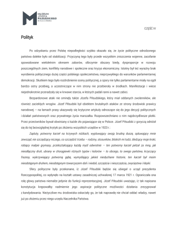 CZĘŚĆ IV Polityk Po odzyskaniu przez Polskę niepodległości szybko okazało się, że życie polityczne odrodzonego państwa dalekie było od stabilizacji. Przyczyną tego były przede wszystkim zniszczenia wojenne, zacofanie spowodowane wieloletnim okresem zaborów, olbrzymie obszary biedy, dysproporcje w rozwoju poszczególnych ziem, konflikty narodowe i społeczne oraz kryzys ekonomiczny. Istotny był też wyraźny brak wyrobienia politycznego dużej części polskiego społeczeństwa, nieprzywykłego do warunków parlamentarnej demokracji. Skutkiem tego było rozdrobnienie sceny politycznej, a spory nie tylko parlamentarne miały na ogół bardzo ostry przebieg, a uczestniczące w nim strony nie przebierały w środkach. Manifestacje i wiece niejednokrotnie przeradzały się w krwawe starcia, w których padali ranni a nawet zabici. Bezpardonowe ataki nie ominęły także Józefa Piłsudskiego, który miał oddanych zwolenników, ale również zaciekłych wrogów. Józef Piłsudski był obiektem brutalnych ataków ze strony środowisk prawicy narodowej – na łamach prasy ukazywały się krytyczne artykuły odnoszące się do jego decyzji politycznych i działań państwowych oraz prywatnego życia marszałka. Rozpowszechniano o nim najobrzydliwsze plotki. Przez przeciwników bywał obwiniany o każde zło pojawiające się w Polsce. Józef Piłsudski z goryczą odniósł się do tej bezwzględnej krytyki po złożeniu wszystkich urzędów w 1923 r.: Zapluty, potworny karzeł na krzywych nóżkach, wypluwający swoją brudną duszę, opluwający mnie zewsząd, nie szczędzący niczego, co szczędzić trzeba – rodziny, stosunków, bliskich mi ludzi, śledzący moje kroki, robiący małpie grymasy, przekształcający każdą myśl odwrotnie – ten potworny karzeł pełzał za mną, jak nieodłączny druh, ubrany w chorągiewki różnych typów i kolorów – to obcego, to swego państwa, krzyczący frazesy, wykrzywiający potworną gębę, wymyślający jakieś niesłychane historie, ten karzeł był moim nieodstępnym druhem, nieodstępnym towarzyszem doli i niedoli, szczęścia i nieszczęścia, zwycięstwa i klęski. Sfery polityczne były przekonane, iż Józef Piłsudski będzie się ubiegał o urząd prezydenta Rzeczypospolitej, co wpłynęło na kształt ustawy zasadniczej uchwalonej 17 marca 1921 r. Ograniczała ona rolę głowy państwa niemalże jedynie do funkcji reprezentacyjnej. Józef Piłsudski uważając, iż tak napisana konstytucja krępowałby nadmiernie jego aspiracje polityczne możliwości działania zrezygnował z kandydowania. Nieżyczliwe mu środowiska oskarżały go, że tak naprawdę nie chciał oddać władzy, nawet już po złożeniu przez niego urzędu Naczelnika Państwa. CZĘŚĆ IV Zabójstwo prezydenta Gabriela Narutowicza 16 grudnia 1922 r. było głębokim wstrząsem dla Józefa Piłsudskiego. Ostatecznie zniechęcił się on do bieżącej polityki (zamachowiec przyznał, że pierwotnie to Józef Piłsudski miał być celem zamachu) i stopniowo zaczął się z niej wycofywać. Odejście to nie było nagłe – już pod koniec 1922 r. przyjął stanowisko szefa Sztabu Generalnego – wówczas przygotował dla swoich następców mających kierować i dowodzić siłami zbrojnymi opinie o wszystkich generałach pozostających w służbie czynnej. Bezpośrednim powodem złożenia rezygnacji ze wszystkich urzędów była dymisja rządu Władysława Sikorskiego i powołanie rządu Chjeno-Piasta, czyli środowiska politycznego, które – jego zdaniem – były odpowiedzialne za śmierć Gabriela Narutowicza. Całkowitą rezygnację odłożył do lipca ze względu na wizytę rumuńskiej pary królewskiej. 30 maja 1923 r. ustąpił z funkcji szefa Sztabu Generalnego (28 czerwca przekazał obowiązki), a 2 lipca 1923 r. zrezygnował z przewodniczenia Ścisłej Radzie Wojennej i funkcji wiceprzewodniczącego szerokiej Rady Wojennej.