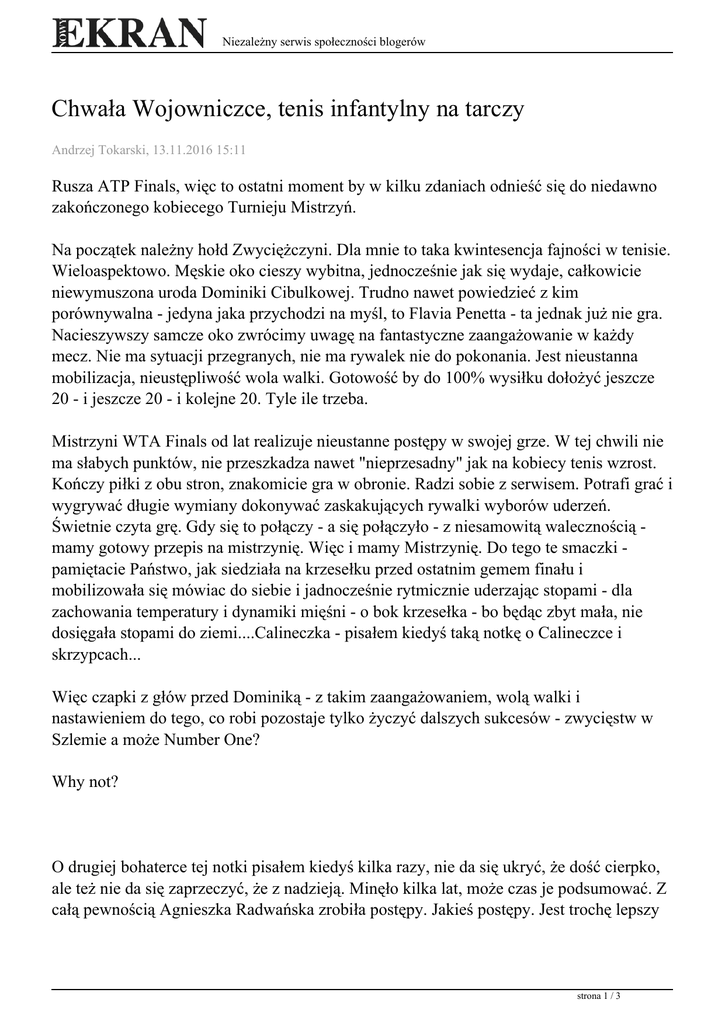 Niezależny serwis społeczności blogerów Chwała Wojowniczce, tenis infantylny na tarczy Andrzej Tokarski, 13.11.2016 15:11 Rusza ATP Finals, więc to ostatni moment by w kilku zdaniach odnieść się do niedawno zakończonego kobiecego Turnieju Mistrzyń. Na początek należny hołd Zwyciężczyni. Dla mnie to taka kwintesencja fajności w tenisie. Wieloaspektowo. Męskie oko cieszy wybitna, jednocześnie jak się wydaje, całkowicie niewymuszona uroda Dominiki Cibulkowej. Trudno nawet powiedzieć z kim porównywalna - jedyna jaka przychodzi na myśl, to Flavia Penetta - ta jednak już nie gra. Nacieszywszy samcze oko zwrócimy uwagę na fantastyczne zaangażowanie w każdy mecz. Nie ma sytuacji przegranych, nie ma rywalek nie do pokonania. Jest nieustanna mobilizacja, nieustępliwość wola walki. Gotowość by do 100% wysiłku dołożyć jeszcze 20 - i jeszcze 20 - i kolejne 20. Tyle ile trzeba. Mistrzyni WTA Finals od lat realizuje nieustanne postępy w swojej grze. W tej chwili nie ma słabych punktów, nie przeszkadza nawet "nieprzesadny" jak na kobiecy tenis wzrost. Kończy piłki z obu stron, znakomicie gra w obronie. Radzi sobie z serwisem. Potrafi grać i wygrywać długie wymiany dokonywać zaskakujących rywalki wyborów uderzeń. Świetnie czyta grę. Gdy się to połączy - a się połączyło - z niesamowitą walecznością mamy gotowy przepis na mistrzynię. Więc i mamy Mistrzynię. Do tego te smaczki pamiętacie Państwo, jak siedziała na krzesełku przed ostatnim gemem finału i mobilizowała się mówiac do siebie i jadnocześnie rytmicznie uderzając stopami - dla zachowania temperatury i dynamiki mięśni - o bok krzesełka - bo będąc zbyt mała, nie dosięgała stopami do ziemi....Calineczka - pisałem kiedyś taką notkę o Calineczce i skrzypcach... Więc czapki z głów przed Dominiką - z takim zaangażowaniem, wolą walki i nastawieniem do tego, co robi pozostaje tylko życzyć dalszych sukcesów - zwycięstw w Szlemie a może Number One? Why not? O drugiej bohaterce tej notki pisałem kiedyś kilka razy, nie da się ukryć, że dość cierpko, ale też nie da się zaprzeczyć, że z nadzieją. Minęło kilka lat, może czas je podsumować. Z całą pewnością Agnieszka Radwańska zrobiła postępy. Jakieś postępy. Jest trochę lepszy strona 1 / 3 Niezależny serwis społeczności blogerów pierwszy serwis,nawet sporo asów. Drugi serwis (czasem) przestał już być prostą drogą na szafot. Zdarzają się winnery. W obronie zawsze biegała nieźle, więc tu nie ma większego zaskoczenia. NIe ma też zaskoczenia w dropszotach, sęk w tym, że idealnie grają je teraz wszyscy, nawet tak wielkie, zdawałoby się pozbawione finezji chłopy jak Karlovic, czy Isner. Wszyscy też je świetnie czytają. Rzecz w czym innym - w tenisie, który ja nazywam infantylnym. Polegającym na uporczywym graniu w jednym kierunku, graniu jedną za drugą piłek krótkich, po których trzeba wydatkować mnóstwo energii by nie paść po kontrze. Uporczywego grania po łatwych piłkach baloników w pół kortu - z nadzieją właściwie na co? Że rywalka rozczytuje się w wywodach pana Fibaka o niezwykłych umiejętnościach "naszej Isi? I ją to sparaliżuje? A jeśli nie czytała akurat? Chyba nie warto na to liczyć. Muguruza i Pliskowa prawdopodobnie zaczytują sie w p. Fibaku, bo tylko tym - i słabą psychiką można wytłumaczyć, że przegrały wygrane mecze z naszą Agnieszką. Swieta widać nie czytała...Powrót Swietlany Kuzniecowej do znakomitej gry zasługiwałby na osobny tekst. Zwrócćcie Państwo uwagę jak po tylu latach treningów nasza Mistrzyni gra forehand. To uderzenie zaczyna się z tyłu (nawet 90` za zawodnikiem. Zaczyna ręka. W trakcie prowadzenia zamachu dołączają się kolejno nogi, biodra, ramiona i kończy ręka czymś na kształt smagnięcia bicza. Forehand Nadala zaczyna się za lewym uchem i kończy za lewym uchem. To daje ponad 360` Z tego się bierze siła, z tego bierze się szybkość, z tego się bierze rotacja - więc z tego się biorą mordercze winnery. Tak grają wszyscy, nie tylko el Maiorkino. Tzn. prawie wszyscy. Prawie - bo nasza mistrzyni gra to uderzenie tylko ciałem. Ręka służy tylko do trzymania rakiety, proszę sie uważnie przyjrzeć. Cała dynamika pochodzi tylko z obrotu tułowia. No i lecą te...baloniki...na druciku... Z tego nigdy nie będzie porządnego winnera. Poza tym to po prostu błąd w wyszkoleniu - po tylu latach - tylu trenerach....ręce opadają. Czym ona ma wygrywać - skoro NIE UMI porządnie uderzyć. Wbrew podejrzeniom ja szczerze życzę jak najlepiej naszej tenisistce. Życzę zwycięstw opartych na świetnej grze, wybitnym zaangażowaniu - nie na przypadkowych błędach rywalek. Gdyby mnie kto pytał o zdanie - choć nikt nie pytał - to bym powiedział tak: trzeba odprawić na przynajmniej półroczny urlop tych wszystkich, utrzymywnych z kwot analogicznych do tych jakie gwiazda wydaje na waciki, akwizytorów samochodów marki ukochanej przez nuworyszów. Wydać porządne pieniądze na prawdziwego trenera z wybitnym dorobkiem. PODDAĆ się rygorowi prawdziwego treningu. Przepracować cały zadany cykl. Zobaczyć jakie będą efekty. Wtedy najprawdopodobniej naszej mistrzyni nawet nie przyjdzie do głowy powrót do poprzedniej ekipy trenerskiej. Dostaną odprawę i pa, chłopcy! I to jest jedyna szansa na realny postęp. Bez tego żadna Martina strona 2 / 3 Niezależny serwis społeczności blogerów Navratilowa czy ktoś tego formatu nie zaryzykuje, by swoim nazwiskiem firmować fochy rozkapryszonej krakowianki. Szczerze mówiąc dziwiłem się Pani Navratilovej że podjęła współpracę - i nie byłem zaskoczony finałem. Forma publicznej - bardzo słuszna reprymendy dobitnie świadczy o rozczarowaniu i dezaprobacie Wielkiej Tenisistki. A o polskich trenerach - jedyne co można zrobić to: zapomnieć. Jedyne (oprócz kasiorki, oczywista), w czym przejawiają prawdziwe zaangażowanie to k