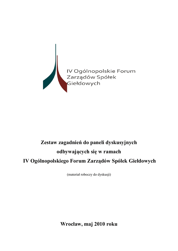 Zestaw zagadnień do paneli dyskusyjnych odbywających się w ramach IV Ogólnopolskiego Forum Zarządów Spółek Giełdowych (materiał roboczy do dyskusji) Wrocław, maj 2010 roku Dzień I – 20 maja 2010 roku, Warszawa, Hotel Sheraton PANEL 1 - Makroekonomiczna pozycja Polski – prognozy na przyszłość PANEL 2 - Rynek kapitałowy a prywatyzacje spółek Skarbu Państwa PANEL 3 - Ocena aktualnego stanu oraz perspektyw warszawskiego centrum regionalnego oraz globalnych rynków kapitałowych PANEL 4 - Finansowanie polskich przedsiębiorstw przez sektor bankowy i inne źródła PANEL 5 - Wpływ dotacji unijnych na konkurencyjność polskich przedsiębiorstw oraz dostępność dotacji dla spółek giełdowych Dzień II – 21 maja 2010 roku, Warszawa, Hotel Sheraton PANEL 6 - Komunikacja spółek giełdowych z rynkiem oraz inwestorami – najlepsze praktyki, oczekiwania PANEL 7 - Wzrastająca odpowiedzialność członków zarządów i rad nadzorczych w spółkach giełdowych Dzień I – Warszawa, 20 maja 2010 PANEL 1 Makroekonomiczna pozycja Polski – prognozy na przyszłość. 10.00-10.15 Makroekonomiczna pozycja Polski – prognozy na przyszłość. Waldemar Pawlak – Wicepremier, Minister Gospodarki Kanapa ekspercka Waldemar Pawlak – Wicepremier, Minister Gospodarki Prof. Jerzy Hausner – Członek Rady Polityki Pieniężnej 10.15-11.15 Andrzej Malinowski – Prezydent Konfederacji Pracodawców Polskich Prof. Mirosław Gronicki – Doradca ekonomiczny, były Minister Finansów Dr Marcin Piątkowski - Bank Światowy 1. Makroekonomiczna pozycja Polski Czy po skutecznej obronie przed recesją nadszedł czas niepewności? Szacowany wzrost PKB (również przez Ministerstwo Gospodarki) w 2010 r. na poziomie 3 % Silne umocnienie złotego i pełzający wzrost gospodarczy w stagnacji Osłabnie złotówki a ryzyko przekroczenia poziomu 55% długu publicznego w stosunku do PKB. Jakie będą konsekwencje przekroczenia tego poziomu? Czy rozwiązaniem problemu jest szybsza konsolidacja finansów publicznych? Czy zaistnieje konieczność ograniczenia wydatków sztywnych w budżecie czy dojdzie do podniesienia podatków? Jak w przyszłych latach będą kształtowały się czynniki makroekonomiczne ważne z punktu widzenia zarządzania przedsiębiorstwem? 2. Jak będą się kształtowały podstawowe, z punktu widzenia zarządów spółek giełdowych, wskaźniki makroekonomiczne? Kurs EUR/PLN w latach 2010 – 2012 Poziom stóp procentowych, poziom inflacji Presja płacowa (rynek pracy, stopa bezrobocia) Popyt zagraniczny (Ze strony krajów: UE 79,5 % eksportu I – II 2010, Strefa Euro 55,9 % eksportu, Niemcy 26,1% w 2009 udział w eksporcie (2009r - wzrost o 1,1 %) Ministerstwo Gospodarki: „Przewiduje się, że w 2010 r. wartość eksportu wyniesie ok. 107,7 mld euro, tj. o ok. 11,8% mniej niż w 2009 roku” 3. Kwestia wejścia Polski do strefy euro Koszty i zagrożenia wynikające z wejścia do strefy euro Kurs konwersji PLN na EUR Jak podnieść konkurencyjność gospodarki (i przedsiębiorstw) w tak krótkim czasie by po przyjęciu EURO (po niekoniecznie optymalnym kursie) utrzymać tempo wzrostu? Jakie procesy deregulacyjne mogą wesprzeć czynniki makroekonomiczne? Pytanie o szanse na deregulację i ułatwienia dla biznesu szczególnie z punktu widzenia słabej pozycji Polski w raporcie Banku Światowego Doing Businnes 2010 (Polska na 74 miejscu. Za Rwandą m.in.) PANEL 2 Rynek kapitałowy a prywatyzacje spółek Skarbu Państwa 11.45-12.00 Rynek kapitałowy a prywatyzacje spółek Skarbu Państwa. Aleksander Grad – Minister Skarbu Państwa Kanapa ekspercka Aleksander Grad – Minister Skarbu Państwa Ludwik Sobolewski – Prezes Zarządu GPW Paweł Olechnowicz – Prezes Zarządu Grupy LOTOS 12.00-13.00 Dariusz Lubera – Prezes Zarządu TAURON Polska Energia Andrzej Klesyk – Prezes Zarządu PZU Maciej Owczarek – Prezes Zarządu ENEA Tomasz Zadroga – Prezes Zarządu Polskiej Grupy Energetycznej 1. Wpływ prywatyzacji na zmiany na rynku – aktywizacja szerokich rzesz inwestorów - np. ponad 250 tysięcy indywidualnych zapisów na akcje PZU 2. Korzyści z prywatyzacji dla rynku : rozwój rynku zwiększanie płynności zwiększanie bazy inwestorskiej 3. Czy korzyści z prywatyzacji dla rynku przynoszą także korzystne efekty dla spółki - brak nowego wiodącego inwestora. Brak nowego know how, trudny do osiągnięcia skok w zakresie procesów biznesowych 4. Utrwalenie podatności zarządu na zmienność państwowego akcjonariusza – utrwalenie uzależnienia od woli politycznej 5. Akcjonariat obywatelski. Korzyści i zagrożenia - dyskusja nad ideą wprowadzana w życie przez Ministerstwo Skarbu Sposób na poprawę wizerunku prywatyzacji? Sposób na zachowanie dominującej roli państwa bez dopuszczania do objęcia znaczących pakietów dużym prywatnym podmiotom? Czy struktura akcjonariatu spółki prywatyzowanej w modelu „akcjonariatu obywatelskiego” jest optymalna dla jej rozwoju? Kto korzysta najbardziej na rozdrobnionej strukturze akcjonariatu powstającej w wyniku prywatyzacji w modelu „akcjonariatu obywatelskiego” Skarb Państwa, zarząd, spółka? 6. Spółka Skarbu Państwa a rynek kapitałowy: Jakie zmiany w państwowym przedsiębiorstwie wymusiło wprowadzenie go na rynek kapitałowy? Akcje pracownicze. Kupowanie poparcia dla zmian własnościowych czy faktyczne zwiększanie motywacji pracowników? Przyspieszenie giełdowych prywatyzacji 2010 – jak długo będą jeszcze trwały procesy prywatyzacji? Jakie spółki Skarb Państwa zamierza jeszcze sprywatyzować? PANEL 3 Ocena aktualnego stanu oraz perspektyw warszawskiego centrum regionalnego oraz globalnych rynków kapitałowych Ocena aktualnego stanu oraz perspektyw warszawskiego centrum 13.00-13.15 regionalnego oraz globalnych rynków kapitałowych. Ludwik Sobolewski – Prezes Zarządu GPW Kanapa ekspercka Ludwik Sobolewski – Prezes Zarządu GPW Prof. Marek Wierzbowski – Wiceprezes Rady GPW Iwona S
