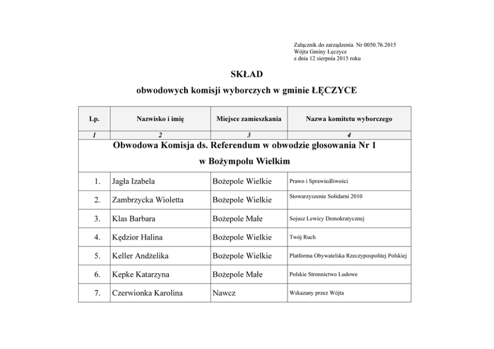 Załącznik do zarządzenia Nr 0050.76.2015 Wójta Gminy Łęczyce z dnia 12 sierpnia 2015 roku SKŁAD obwodowych komisji wyborczych w gminie ŁĘCZYCE Lp. Nazwisko i imię Miejsce zamieszkania Nazwa komitetu wyborczego 1 2 3 4 Obwodowa Komisja ds. Referendum w obwodzie głosowania Nr 1 w Bożympolu Wielkim 1. Jagła Izabela Bożepole Wielkie Prawo i Sprawiedliwości 2. Zambrzycka Wioletta Bożepole Wielkie Stowarzyszenie Solidarni 2010 3. Klas Barbara Bożepole Małe Sojusz Lewicy Demokratycznej 4. Kędzior Halina Bożepole Wielkie Twój Ruch 5. Keller Andżelika Bożepole Wielkie Platforma Obywatelska Rzeczypospolitej Polskiej 6. Kepke Katarzyna Bożepole Małe Polskie Stronnictwo Ludowe 7. Czerwionka Karolina Nawcz Wskazany przez Wójta Lp. Nazwisko i imię Miejsce zamieszkania Nazwa komitetu wyborczego 1 2 3 4 Obwodowa Komisja ds. Referendum w obwodzie głosowania Nr 2 w Bożympolu Wielkim 1. Gabrychowicz Grażyna Bożepole Wielkie Prawo i Sprawiedliwości 2. Stypka Regina Bożepole Wielkie Stowarzyszenie Solidarni 2010 3. Zieleniewska Martyna Bożepole Wielkie Sojusz Lewicy Demokratycznej 4. Kornaga Jan Bożepole Wielkie Twój Ruch 5. Stenka Piotr Łęczyce Platforma Obywatelska Rzeczypospolitej Polskiej 6. Karszna Elżbieta Bożepole Małe Polskie Stronnictwo Ludowe 7. Kustusz Aneta Świchowo Wskazany przez Wójta Lp. Nazwisko i imię Miejsce zamieszkania Nazwa komitetu wyborczego 1 2 3 4 Obwodowa Komisja ds. Referendum w obwodzie głosowania Nr 3 w Brzeźnie Lęborskim 1. Bogusz Magdalena Brzeźno Lęborskie Prawo i Sprawiedliwości 2. Łazar Krystyna Łęczyce Stowarzyszenie Solidarni 2010 3. Pranszke Paulina Bożepole Wielkie Sojusz Lewicy Demokratycznej 4. Białobrzeski Kazimierz Brzeźno Lęborskie Twój Ruch 5. Szczygieł Justyna Łęczyce Platforma Obywatelska Rzeczypospolitej Polskiej 6. Rudzińska Gabriela Brzeźno Lęborskie Polskie Stronnictwo Ludowe 7. Szmidtke Gabriela Strzelęcino Wskazany przez Wójta Lp. Nazwisko i imię Miejsce zamieszkania Nazwa komitetu wyborczego 1 2 3 4 Obwodowa Komisja ds. Referendum w obwodzie głosowania Nr 4 w Kaczkowie 1. Formela Sylwia Kaczkowo Prawo i Sprawiedliwości 2. Dzikowska Jadwiga Łęczyce Stowarzyszenie Solidarni 2010 3. Szreder Elżbieta Strzebielino Sojusz Lewicy Demokratycznej 4. Badena Kazimiera Kaczkowo Twój Ruch 5. Ropela Marzena Kaczkowo Platforma Obywatelska Rzeczypospolitej Polskiej 6. Konkol Iwona Świetlino Polskie Stronnictwo Ludowe 7. Adamska Kinga Dąbrowa Brzezieńska Wskazany przez Wójta Lp. Nazwisko i imię Miejsce zamieszkania Nazwa komitetu wyborczego 1 2 3 4 Obwodowa Komisja ds. Referendum w obwodzie głosowania Nr 5 w Łęczycach 1. Dzikowski Tadeusz Lęczyce Prawo i Sprawiedliwości 2. Labuda Damian Łęczyce Stowarzyszenie Solidarni 2010 3. Brunke Hanna Strzebielino Sojusz Lewicy Demokratycznej 4. Gaffke Izabela Brzeźno Lęborskie Twój Ruch 5. Szczygieł Bogusław Łęczyce Platforma Obywatelska Rzeczypospolitej Polskiej 6. Padykuła Jan Łęczyce Polskie Stronnictwo Ludowe 7. Cierocka Agnieszka Godętowo Wskazany przez Wójta Lp. Nazwisko i imię Miejsce zamieszkania Nazwa komitetu wyborczego 1 2 3 4 Obwodowa Komisja ds. Referendum w obwodzie głosowania Nr 6 w Łęczycach 1. Petta Magdalena Łęczyce Prawo i Sprawiedliwości 2. Giec Marek Łęczyce Stowarzyszenie Solidarni 2010 3. Brunke Jakub Strzebielino Sojusz Lewicy Demokratycznej 4. Główczewska Paulina Brzeźno Lęborskie Twój Ruch 5. Szczygieł Karolina Łęczyce Platforma Obywatelska Rzeczypospolitej Polskiej 6. Żyłka Barbara Łęczyce Polskie Stronnictwo Ludowe 7. Klein-Sot Joanna Rozłazino Wskazany przez Wójta Lp. Nazwisko i imię Miejsce zamieszkania Nazwa komitetu wyborczego 1 2 3 4 Obwodowa Komisja ds. Referendum w obwodzie głosowania Nr 7 w Rozłazinie 1. Godlewski Łukasz Rozłazino Prawo i Sprawiedliwości 2. Wojciechowska Kinga Rozłazino Stowarzyszenie Solidarni 2010 3. Knuth Izabela Strzebielino Sojusz Lewicy Demokratycznej 4. Gryń Honorata Rozłazino Twój Ruch 5. Stenka Maria Łęczyce Platforma Obywatelska Rzeczypospolitej Polskiej 6. Kaczykowska Barbara Dzięcielec Polskie Stronnictwo Ludowe 7. Karolak Monika Rozłazino Wskazany przez Wójta Lp. Nazwisko i imię Miejsce zamieszkania Nazwa komitetu wyborczego 1 2 3 4 Obwodowa Komisja ds. Referendum w obwodzie głosowania Nr 8 w Nawczu 1. Góra Joanna Redystowo Prawo i Sprawiedliwości 2. Walczykowska Sylwia Rozłazino Stowarzyszenie Solidarni 2010 3. Ptach Dawid Strzebielino Sojusz Lewicy Demokratycznej 4. Bodnar Teresa Łęczyce Twój Tuch 5. Bodnar Anna Łęczyce Platforma Obywatelska Rzeczypospolitej Polskiej 6. Kornaga Patrycja Godętowo Polskie Stronnictwo Ludowe 7. Maszota Barbara Łówcz Górny Wskazany przez Wójta Lp. Nazwisko i imię Miejsce zamieszkania Nazwa komitetu wyborczego 1 2 3 4 Obwodowa Komisja ds. Referendum w obwodzie głosowania Nr 9 w Strzebielinie Osidlu 1. Woźniak Artur Bożepole Wielkie Prawo i Sprawiedliwości 2. Słabolepsza Bożena Bożepole Wielkie Stowarzyszenie Solidarni 2010 3. Sirotzka Małgorzata Strzebielino Osiedle Sojusz Lewicy Demokratycznej 4. Dettlaff Teresa Strzebielino Osiedle Twój Ruch 5. Kreft Janusz Strzebielino Osiedle Platforma Obywatelska Rzeczypospolitej Polskiej 6. Motyka Justyna Strzebielino Osiedle Polskie Stronnictwo Ludowe 7. Wasil-Sudnik Joanna Strzebielino Osiedle Wskazany przez Wójta Lp. Nazwisko i imię Miejsce zamieszkania Nazwa komitetu wyborczego 1 2 3 4 Obwodowa Komisja ds. Referendum w obwodzie głosowania Nr 10 w Strzebielinie Osiedlu 1. Kaczmarek Krzysztof Bożepole Wielkie Prawo i Sprawiedliwości 2. Klotzka Julita Bożepole Wielkie Stowarzyszenie Solidarni 2010 3. Pallach Andżelika Strzebielino Sojusz Lewicy Demokratycznej 4. Białk Małgorzata Strzebielino Osiedle Twój Ruch 5. Kuchta Józef Strzebielino Osiedle Platforma Obywatelska Rzeczypospolitej Polskiej 6. Necel Halina Bożepole Wielkie Polskie Stronnictwo Ludowe 7. Patelczyk Karolina Strzebielino Wskazany przez Wójta