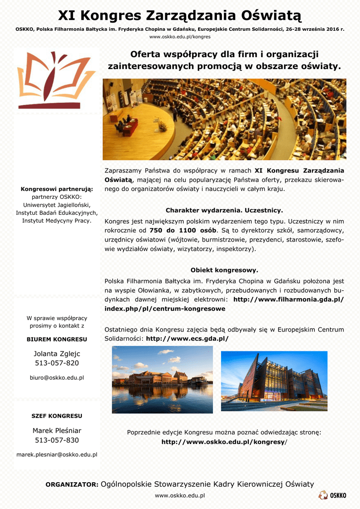XI Kongres Zarządzania Oświatą OSKKO, Polska Filharmonia Bałtycka im. Fryderyka Chopina w Gdańsku, Europejskie Centrum Solidarności, 26-28 września 2016 r. www.oskko.edu.pl/kongres Oferta współpracy dla firm i organizacji zainteresowanych promocją w obszarze oświaty. Zapraszamy Państwa do współpracy w ramach XI Kongresu Zarządzania Oświatą, mającej na celu popularyzację Państwa oferty, przekazu skierowaKongresowi partnerują: partnerzy OSKKO: Uniwersytet Jagielloński, Instytut Badań Edukacyjnych, Instytut Medycyny Pracy. nego do organizatorów oświaty i nauczycieli w całym kraju. Charakter wydarzenia. Uczestnicy. Kongres jest największym polskim wydarzeniem tego typu. Uczestniczy w nim rokrocznie od 750 do 1100 osób. Są to dyrektorzy szkół, samorządowcy, urzędnicy oświatowi (wójtowie, burmistrzowie, prezydenci, starostowie, szefowie wydziałów oświaty, wizytatorzy, inspektorzy). Obiekt kongresowy. Polska Filharmonia Bałtycka im. Fryderyka Chopina w Gdańsku położona jest na wyspie Ołowianka, w zabytkowych, przebudowanych i rozbudowanych budynkach dawnej miejskiej elektrowni: http://www.filharmonia.gda.pl/ index.php/pl/centrum-kongresowe W sprawie współpracy prosimy o kontakt z BIUREM KONGRESU Ostatniego dnia Kongresu zajęcia będą odbywały się w Europejskim Centrum Solidarności: http://www.ecs.gda.pl/ Jolanta Zglejc 513-057-820 [email protected] SZEF KONGRESU Marek Pleśniar 513-057-830 Poprzednie edycje Kongresu można poznać odwiedzając stronę: http://www.oskko.edu.pl/kongresy/ [email protected] ORGANIZATOR: Ogólnopolskie Stowarzyszenie Kadry Kierowniczej Oświaty www.oskko.edu.pl XI Kongres Zarządzania Oświatą OSKKO, Polska Filharmonia Bałtycka im. Fryderyka Chopina w Gdańsku, Europejskie Centrum Solidarności, 26-28 września 2016 r. www.oskko.edu.pl/kongres Opcje uczestnictwa dla Partnerów I. WYSTAWCA: Zachęcamy do wsparcia jednego z najważniejszych wydarzeń oświatowych, na którego dobrą opinię pracujemy już jedenasty rok. Jesteśmy otwarci na Państwa propozycje różnorodnych form współpracy. Informacji o koszcie udzielamy indywidualnie. Zapraszamy do przejrzenia relacji foto i stron sponsorów z poprzednich edycji Kongresu. W sprawie współpracy prosimy o kontakt z [email protected] SZEF KONGRESU Marek Pleśniar 513-057-830 [email protected] ORGANIZATOR: II. PARTNER = opcja I + dodatkowo: Status Partnera — informacja w materiałach informacyjnych, do wykorzystania w Państwa ofertach. Preferencyjne ulokowanie stoiska – pierwszeństwo jednak mają Partnerzy Główni (opcja III); powierzchnia dostosowana do Państwa potrzeb i możliwości przestrzennych. Logo i link do witryny na naszej stronie głównej (nie konferencyjnej) na okres - do końca grudnia 2016 r. Banner/stand reklamowy w auli głównej. Informacje o Partnerze w newsletterze Kongresu, docierającym do uczestników przed i po Kongresie. III. PARTNER GŁÓWNY = opcja I + II + dodatkowo: BIUREM KONGRESU Jolanta Zglejc 513-057-820 Stoisko wystawiennicze. Dystrybucja materiałów reklamowych wśród uczestników. Logo firmy w materiałach konferencyjnych. Logo oraz link w witrynie Kongresu. Logo może znajdować się w obiekcie tylko przy stoisku Reklamodawcy. Krótka informacja o firmie w wykazie sponsorów na stronie internetowej Kongresu w zakładce „Sponsorzy Kongresu”. Największe stoisko reklamowe — ulokowane w porozumieniu z Partnerami Głównymi i Organizatorem. Logo Partnera Głównego na pierwszej stronie materiałów. Znaki i bannery w najlepszym miejscu – w auli głównej na podium oraz w każdej sali kongresowej. Istnieje też możliwość ustawienia bannera przed obiektem – po konsultacji z nami. Współpracujemy przy organizacji dodatkowych wydarzeń w ramach konferencji. Państwa logo z linkiem zamieścimy do końca lutego 2017 r. w witrynie głównej OSKKO Logo, podziękowanie i link znajdzie się też w e-mailingu pokongresowym do uczestników oraz we wszystkich newsletterach kongresowych (do 3 przed i 1 po Kongresie) Informację o Kongresie i Partnerach Głównych zamieścimy w najbardziej poczytnym forum dla dyrektorów w Polsce: www.oskko.edu.pl/ forum/. Forum czyta 32 000 przedstawicieli kadry kierowniczej, w tym wszystkie kuratoria oświaty, minister resortu oświaty, pracownicy samorządów. Dodatkowym kosztem każdej z opcji będą koszty pobytu (noclegi i wyżywienie) przedstawicieli firm. Zapraszamy do zapoznania się z relacją z X Kongresu Zarządzania Oświatą oraz stroną sponsorów, którzy wsparli organizację imprezy. Ogólnopolskie Stowarzyszenie Kadry Kierowniczej Oświaty www.oskko.edu.pl