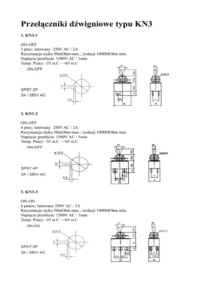 Przełączniki dźwigniowe typu KN3 1. KN3-1 ON-OFF 2 piny; lutowany 250V AC / 2A Rezystancja styku 50mOhm max.; izolacji 1000MOhm min. Napięcie przebicia: 1500V AC / 1min Temp. Pracy: -55 st.C - +65 st.C 2. KN3-2 ON-OFF 4 piny; lutowany 250V AC / 2A Rezystancja styku 50mOhm max.; izolacji 1000MOhm min. Napięcie przebicia: 1500V AC / 1min Temp. Pracy: -55 st.C - +65 st.C 3. KN3-3 ON-ON 6 pinów; lutowany 250V AC / 3A Rezystancja styku 50mOhm max.; izolacji 1000MOhm min. Napięcie przebicia: 1500V AC / 1min Temp. Pracy: -55 st.C - +65 st.C 4. KN3-402 ON-ON 12 pinów; lutowany 250V AC / 6A Rezystancja styku 50mOhm max.; izolacji 1000MOhm min. Napięcie przebicia: 1500V AC / 1min Temp. Pracy: -55 st.C - +65 st.C
