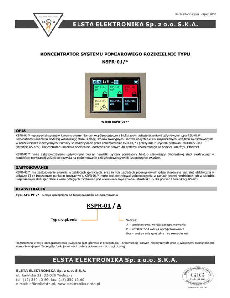 Karta informacyjna - lipiec 2016 KONCENTRATOR SYSTEMU POMIAROWEGO ROZDZIELNIC TYPU KSPR-01/* Widok KSPR-01/* OPIS KSPR-01/* jest specjalistycznym koncentratorem danych współpracującym z blokującymi zabezpieczeniami upływowymi typu BZU-01/*. Koncentrator umożliwia czytelną wizualizację stanu izolacji, stanów awaryjnych i innych danych z wielu rozproszonych urządzeń zainstalowanych w rozdzielnicach elektrycznych. Pomiary są wykonywane przez zabezpieczenia BZU-01/* i przesyłane z użyciem protokołu MODBUS RTU (interfejs RS-485). Koncentrator umożliwia opcjonalne udostępnianie danych do systemu zewnętrznego za pomocą interfejsu Ethernet. KSPR-01/* wraz zabezpieczeniami upływowymi tworzy niewielki system pomiarowy bardzo ułatwiający diagnostykę sieci elektrycznej w kontekście rezystancji izolacji co pozwala na podejmowanie działań prewencyjnych i zapobiegnie awariom. ZASTOSOWANIE KSPR-01/* ma zastosowanie głównie w zakładach górniczych, oraz innych zakładach przemysłowych gdzie stosowana jest sieć elektryczna w układzie IT (z izolowanym punktem neutralnym). KSPR-01/* może być kontrolować zabezpieczenia w ramach jednej rozdzielnicy lub w układzie rozproszonym zbierając dane z wielu odległych rozdzielnic pod warunkiem zapewnienia infrastruktury dla potrzeb komunikacji RS-485. KLASYFIKACJA Typ: ATS-PF /*– wersja uzależniona od funkcjonalności oprogramowania KSPR-01 / A Typ urządzenia Wersja: A – podstawowa wersja oprogramowania B – rozszerzona wersja oprogramowania Sxx – wykonanie specjalne (o symbolu xx) Rozszerzona wersja oprogramowania związana jest głownie z prezentacją i archiwizacją danych historycznych oraz z większymi możliwościami komunikacyjnymi. Szczegóły funkcjonalności zostały opisane w instrukcji obsługi. Karta informacyjna - lipiec 2016 PODSTAWOWE DANE TECHNICZNE 1. 2. 3. 4. 5. 6. 7. 8. 9. Znamionowe napięcie zasilania Un Pobór mocy Wyświetlacz Stopień ochrony obudowy Stopień ochrony panelu frontowego Temperatura otoczenia podczas pracy Ta Komunikacja podstawowa (downlink) Komunikacja opcjonalna Port komunikacyjne - 2 x USB - 2 x RJ45 - DSUB9 24V DC +10% /-5% maksymalnie 9W TFT Color LCD 3,5” 320 x 240 (QVGA) IP20 IP65 0ºC ÷ 40ºC RS-485 / Modbus RTU Ethernet Typ A oraz mini-B RS-485/232 oraz Ethernet CANOpen (opcja dla wersji S) RYSUNEK KATALOGOWY i CERTYFIKATY KSPR-01/* – rysunek katalogowy GWARANCJA I SERWIS Zapewniamy kompleksową obsługę w ramach świadczenia usług gwarancyjnych i pogwarancyjnych urządzeń naszej produkcji. Usługi te realizowane są wyłącznie przez producenta lub autoryzowany punkt serwisowy. W sprawie dodatkowych informacji prosimy o zapoznanie się z opisem zamieszczonym na stronie: https://www.elektronika.elsta.pl/pl/wspolpraca/serwis/ lub o bezpośredni kontakt z producentem.