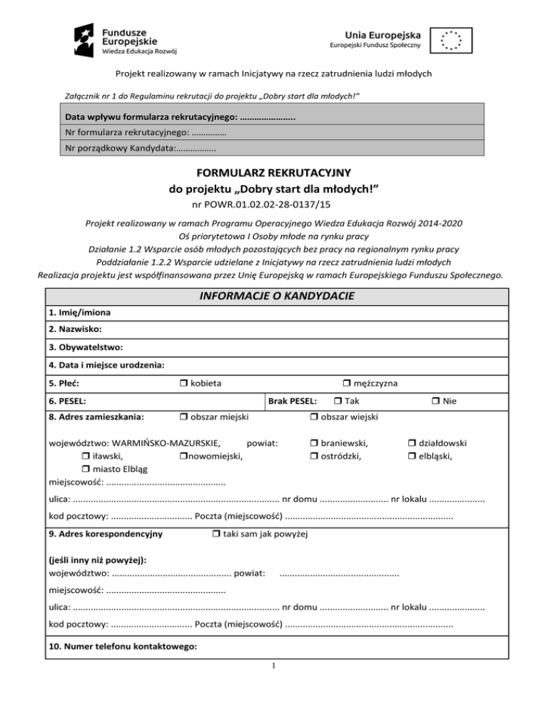 Projekt realizowany w ramach Inicjatywy na rzecz zatrudnienia ludzi młodych Załącznik nr 1 do Regulaminu rekrutacji do projektu „Dobry start dla młodych!” Data wpływu formularza rekrutacyjnego: ………………….. Nr formularza rekrutacyjnego: …………… Nr porządkowy Kandydata:…………….. FORMULARZ REKRUTACYJNY do projektu „Dobry start dla młodych!” nr POWR.01.02.02-28-0137/15 Projekt realizowany w ramach Programu Operacyjnego Wiedza Edukacja Rozwój 2014-2020 Oś priorytetowa I Osoby młode na rynku pracy Działanie 1.2 Wsparcie osób młodych pozostających bez pracy na regionalnym rynku pracy Poddziałanie 1.2.2 Wsparcie udzielane z Inicjatywy na rzecz zatrudnienia ludzi młodych Realizacja projektu jest współfinansowana przez Unię Europejską w ramach Europejskiego Funduszu Społecznego. INFORMACJE O KANDYDACIE 1. Imię/imiona 2. Nazwisko: 3. Obywatelstwo: 4. Data i miejsce urodzenia: 5. Płeć: kobieta 6. PESEL: 8. Adres zamieszkania: mężczyzna Brak PESEL: obszar miejski Tak Nie obszar wiejski braniewski, ostródzki, województwo: WARMIŃSKO-MAZURSKIE, powiat: iławski, nowomiejski, miasto Elbląg miejscowość: ............................................... działdowski elbląski, ulica: ................................................................................. nr domu ........................... nr lokalu ...................... kod pocztowy: ................................ Poczta (miejscowość) .................................................................. 9. Adres korespondencyjny taki sam jak powyżej (jeśli inny niż powyżej): województwo: ............................................... powiat: ............................................... miejscowość: ............................................... ulica: ................................................................................. nr domu ........................... nr lokalu ...................... kod pocztowy: ................................ Poczta (miejscowość) .................................................................. 10. Numer telefonu kontaktowego: 1 Projekt realizowany w ramach Inicjatywy na rzecz zatrudnienia ludzi młodych 11. Numer telefonu komórkowego (dodatkowy): 12. Adres poczty elektronicznej do kontaktu: 13. Status Kandydata oraz przynależność do grupy docelowej(proszę zaznaczyć znakiem „x”) osoba fizyczna w wieku 15-29 roku życia pozostająca bez pracy, która nie uczestniczy w kształceniu oraz szkoleniu (tzw. młodzież NEET1), zamieszkująca w rozumieniu kodeksu cywilnego obszar subregionu elbląskiego w okresie 01.04.2016-31.12.2016, z wyłączeniem grupy docelowej dla trybu konkursowego w Poddziałaniu 1.3.1 PO WER2, w tym: osoba bierna zawodowo3; osoba bezrobotna4, w tym: długotrwale bezrobotna5 Ponadto jestem osobą z niepełnosprawnościami. 14. Wykształcenie (proszę zaznaczyć znakiem „x” i uzupełnić) Poziom ISCED 2011 Nazwa programu/szkoły Poziom 0 Przedszkole/brak Poziom 1 Szkoła podstawowa Poziom 2 Gimnazjum Poziom 3 Liceum, Technikum, Zasadnicza szkoła zawodowa Poziom 4 Szkoły policealne Poziom 5 Studia krótkiego cyklu np. kolegium językowe, kolegium nauczycielskie Poziom 6 Studia licencjackie Poziom 7 Studia magisterskie, Studia uzupełniające magisterskie, Poziom 8 Studia doktoranckie Proszę podać nazwę ostatniej ……………..……………………………………………………………………………………………………. uczelni/szkoły 15. Posiadane doświadczenie zawodowe (proszę zaznaczyć znakiem „x” i uzupełnić) brak doświadczenia od 1 do 3 miesięcy od 3 miesięcy do 1 roku powyżej 1 roku Zawód wyuczony ………………………………………………………………………………………………… 16. OCZEKIWANIA ZWIĄZANE Z UDZIAŁEM W PROJEKCIE (proszę zaznaczyć znakiem „x” i /lub uzupełnić) Podniesienie zdolności do zatrudnienia □ tak □ nie Podjęcie pracy Nabycie lub zaktualizowanie posiadanych kwalifikacji Zwiększenie atrakcyjności na rynku pracy Zwiększenie wiary we własne siły, poczucia wartości, 2 □ □ □ □ tak tak tak tak □ nie □ nie □ nie □ nie Projekt realizowany w ramach Inicjatywy na rzecz zatrudnienia ludzi młodych potencjału społecznego i eliminacja barier Inne, jakie?............................................................................................................................................................... 17. Źródła informacji o projekcie (zakreślić odpowiednie) Ulotka/plakat informacyjny Ogłoszenie prasowe Spotkanie informacyjne Strona internetowa projektu Znajomi Inne (jakie?) …………………………………………………………………………………. Oświadczenia: Oświadczam, że wszystkie dane zawarte w niniejszym Formularzu Rekrutacyjnym są zgodne z prawdą. Oświadczam, że zapoznałem(am) się z Regulaminem rekrutacji i Regulaminem uczestnictwa. Ja niżej podpisany(a) wyrażam zgodę na przetwarzanie moich danych osobowych dla celów związanych z procedurą rekrutacji oraz realizacją projektu „Dobry start dla młodych!”, zgodnie z Ustawą z dnia 29.08.1997 r. o Ochronie Danych Osobowych (Dz. U. Nr 133 poz. 883). Wyrażam zgodę na prowadzenie wobec mojej osoby dalszego postępowania rekrutacyjnego, mającego na celu określenie moich predyspozycji do udziału w Projekcie. Zostałem(am) poinformowany(a), że Projekt jest finansowany ze środków Unii Europejskiej – Europejskiego Funduszu Społecznego. Mam świadomość, że szkolenie może odbywać się w miejscowości innej od mojego miejsca zamieszkania i wyrażam na to zgodę. Jestem świadomy(a), iż złożenie Formularza rekrutacyjnego nie jest równoznaczne z zakwalifikowaniem do udziału w projekcie. Zostałem(am) pouczony(a) o odpowiedzialności za składanie oświadczeń niezgodnych z prawdą lub zatajenie prawdy, niniejszym oświadczam, że ww. dane są prawdziwe. Jednoc