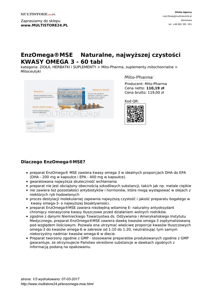 Glinka Agency mail;[email protected] Zapraszamy do sklepu www.MULTISTORE24.PL Warszawa tel. +48 602 395 051 EnzOmega®MSE Naturalne, najwyższej czystości KWASY OMEGA 3 - 60 tabl kategoria: ZIOŁA, HERBATKI i SUPLEMENTY > Mito-Pharma, suplementy mitochonrialne > Mitoceutyki Producent: Mito-Pharma Cena netto: 110,19 zł Cena brutto: 119,00 zł Kod QR: Dlaczego EnzOmega®MSE? preparat EnzOmega® MSE zawiera kwasy omega 3 w idealnych proporcjach DHA do EPA (DHA - 200 mg w kapsułce i EPA - 400 mg w kapsułce). gwaratowana najwyższa skuteczność wchłaniania preparat nie jest obciążony obecnością szkodliwych substancji, takich jak np. metale ciężkie nie zawiera też pozostałości antybiotyków i hormonów, które mogą występować w olejach z niektórych ryb hodowlanych proces destylacji molekularnej zapewnia najwyższą czystość i jakość preparatu bogatego w kwasy omega-3- o najwyższej bioaktywności. preparat EnzOmega®MSE zawiera niezbędną witaminę E- naturalny antyoksydant chroniący nienasycone kwasy tłuszczowe przed działaniem wolnych rodników. zgodnie z danymi Niemieckiego Towarzystwa ds. Odżywiania i Amerykańskiego Instytutu Medycznego, preparat EnzOmega®MSE zawiera dawkę kwasów omega-3 zoptymalizowaną pod względem ilościowym. Pozwala ona utrzymać właściwe proporcje kwasów tłuszczowych omega-3 do kwasów omega-6 w zakresie od 1:10 do 1:20, neutralizując tym samym niekorzystny nadmiar kwasów omega-6 w diecie. Preparat tworzony zgodnie z GMP - stosowanie preparatów produkowanych zgodnie z GMP gwarantuje, że otrzymujecie Państwo określone substancje w dawkach zgodnych z informacją podaną na opakowaniu. strona: 1/3 wydrukowano: 07-03-2017 http://www.multistore24.pl/enzomega-mse.html EnzOmega®MSE zawiera koncentrat oleju rybnego pozyskiwanego z małych ryb dalekomorskich i dzięki temu wykazuje najwyższy poziom czystości. W przeciwieństwie do olejów rybnych pochodzących z ryb hodowlanych kapsułki EnzOmega®MSE są wolne od antybiotyków, hormonów wzrostu oraz metali ciężkich. Czystość i jakość preparatu jest zagwarantowana również dzięki efektywnej i kontrolowanej procedurze produkcji - destylacji molekularnej. Istotnym składnikiem preparatu EnzOmega®MSE jest również witamina E zapobiegająca szkodliwym procesom utleniania kwasów omega-3 wewnątrz mitochondriów. Preparaty z omega 3 mają nad rybami tę przewagę, że zawierają stałą, wystandaryzowaną ilość kwasów tłuszczowych omega 3. W wypadku ryb ilośc ta ulega znacznym wahaniom w zależności od obszaru i czasu połowu, czy gatunku ryby. Poza tym ryby mogą zawierać substancje szkodliwe , takie jak metale cięzkie lub dioksyny. Proporcja kwasów strona: 2/3 wydrukowano: 07-03-2017 http://www.multistore24.pl/enzomega-mse.html omega 3 do omega 6. Kwasy tłuszczowe omega 6 są – analogicznie do kwasów tłuszczowych omega 3 – częścią składową błon oraz substancji wyjściowych w produkcji hormonów tkankowych. W procesach przemiany materii kwasy tłuszczowe omega 6 są poniekąd „przeciwnikami” kwasów tłuszczowych omega 3. Mogą bowiem niekorzystnie wpływać na krzepnięcie i płynność krwi w naczyniach krwionośnych. Ponieważ obie te grupy kwasów tłuszczowych zachowują się jak „konkurenci” i do przekształcenia się w hormony tkankowe wymagają tych samych enzymów, niezwykle istotna jest właściwa proporcja kwasów tłuszczowych omega 3 do omega 6 wynosząca 1:5. Przeważająca liczba konsumentów spożywa w rzeczywistości więcej kwasów tłuszczowych omega 6. Z tego powodu oczekiwana proporcja ulega niekorzystnej zmianie. Nadmiar kwasów omega-6 w stosunku do kwasów omega-3 prowadzi więc do intensyfikacji stanów zapalnych, procesów aterogennych (zaburzenia w stężeniach substancji tłuszczowych we krwi zwiększające ryzyko miażdżycy) i procesów protrombotycznych (wzrost ryzyka powstawania skrzepów). Zwiększa się też zagrożenie arytmią i zwężeniem naczyń krwionośnych oraz wzrostem tkanki tłuszczowej. Obniżony stosunek kwasów omega-3 do omega-6 w błonie komórki i jej organelli negatywnie wpływa na działanie błon i żywotność komórki. Rola witaminy E w preparatach z kwasami omega 3 Podobnie jak większość nienasyconych kwasów tłuszczowych także kwasy omega-3 podatne są na agresywne działanie reaktywnych form tlenu powstających w mitochondriach podczas działania łańcucha oddechowego – głównego mechanizmu energetycznego komórki. Naturalnym antyoksydantem chroniącym nienasycone kwasy tłuszczowe przed utlenieniem jest witamina E. Bez osłony przeciwutleniającej nawet optymalnie dobrane prozdrowotne dawki kwasów omega-3 mogły by przynieść szkodę zamiast spodziewanych korzyści. strona: 3/3 wydrukowano: 07-03-2017 http://www.multistore24.pl/enzomega-mse.html