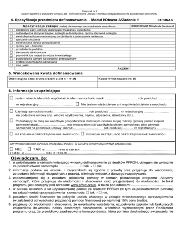 Załącznik nr 2 Należy wypełnić w przypadku wniosku dot. dofinansowania zakupu / montażu oprzyrządowania do posiadanego samochodu 4. Specyfikacja przedmiotu dofinansowania - Moduł I/Obszar A/Zadanie 1 ORIENTACYJNA CENA brutto (kwota w zł) Specyfikacja z akupu (rodzaj planowanego oprzyrządowania samochodu) STRONA 5 dodatkowe pasy, uchwyty ułatwiające wsiadanie i wysiadanie automatyczna skrzynia biegów, sprzęgło automatyczne, ręczny sterownik sprzęgła elektrohydrauliczne mechanizmy do obniżania i podnoszenia nadwozia specjalne siedzenia elektroniczna obręcz przyspieszenia ręczny gaz – hamulec przedłużenie pedałów sterowanie elektroniczne podnośnik lub najazd do wózka inwalidzkiego przeniesienie dźwigni lub pedałów, przełączników system wspomagania parkowania inne, jakie: R AZ E M 5. Wnioskowana kwota dofinansowania Orientacyjna cena brutto (razem z pkt 4 – w zł) Kwota wnioskowana (w zł) 6. Informacje uzupełniające Jestem właścicielem lub współwłaścicielem samochodu marki:...................................rok produkcji .............., nr rejestracyjny ..................................... Nie jestem właścicielem ani współwłaścicielem samochodu Użytkuję samochód marki ..................................... rok produkcji ........... nr rejestracyjny .......................... na podstawie umowy (np. umowa użytkowania, najmu, użyczenia, dzierżawy itd.). Pozostający ze mną we wspólnym gospodarstwie domowym członek mojej rodziny (proszę podać stopień pokrewieństwa)...............................jest właścicielem lub współwłaścicielem samochodu albo użytkuje samochód na podstawie umowy: marka:........................... rok produkcji .........., nr rejestracyjny ................ NIE POSIADAM OPRZYRZĄDOWANIA SAMOCHODU POSIADAM NASTĘPUJĄCE OPRZYRZĄDOWANIE SAMOCHODU: ............................................................................................................................. CZY WNIOSKODAWCA UZYSKAŁ WCZEŚNIEJ POMOC W ZAKUPIE OPRZYRZĄDOWANIA SAMOCHODU: NIE TAK w . . . . . . . . . . . . r o k u w r a m a c h . . . . . . . . . . . . . . . . . . . . . . . . . . . . . . . . . . . . . . . . . . . . . . . . . . . . . . . . . . . . . . . . . . . . . . . . . . . . . . . . . . . . . . . . . . . . . . a także w .................... roku w ramach ............................................................................... ............................ Oświadczam, że: 1. o wnioskowane w ramach niniejszego wniosku dofinansowanie ze środków PFRON, ubiegam się wyłącznie za pośrednictwem samorządu ..................... tak - nie, 2. informacje podane we wniosku i załącznikach są zgodne z prawdą oraz przyjmuję do wiadomości, że podanie informacji niezgodnych z prawdą, eliminuje wniosek z dalszego rozpatrywania, 3. zapoznałam(em) się z zasadami udzielania pomocy w ramach pilotażowego programu „Aktywny samorząd”, które przyjmuję do wiadomości i stosowania oraz przyjęłam(em) do wiadomości, że tekst programu jest dostępny pod adresem: www.pfron.org.pl, a także pod adresem: ........................................... 4. w okresie ostatnich 3 lat uzyskałam(em) pomoc ze środków PFRON (w tym za pośrednictwem powiatu) na zakup/montaż oprzyrządowania samochodu: tak - nie, 5. posiadam środki finansowe na pokrycie udziału własnego w zakupie wnioskowanego oprzyrządowania (w zależności od wysokości przyznanej pomocy finansowej co najmniej 15% ceny brutto), 6. przyjmuję do wiadomości i stosowania, że ewentualne wyjaśnienia, uzupełnienia zapisów lub brakujących załączników do wniosku należy dostarczyć niezwłocznie, w terminie wyznaczonym przez Realizatora programu oraz, że prawidłowo zaadresowana korespondencja, która pomimo dwukrotnego awizowania nie zostanie odebrana, uznawana będzie za doręczoną, 7. w ciągu ostatnich 3 lat byłem(am) stroną umowy dofinansowania ze środków PFRON i rozwiązanej z przyczyn leżących po mojej stronie: tak - nie, STRONA 6 8. przyjmuję do wiadomości i stosowania, iż złożenie niniejszego wniosku o dofinansowanie nie gwarantuje uzyskania pomocy w ramach realizacji programu oraz, że warunkiem zawarcia umowy dofinansowania jest spełnianie warunków uczestnictwa określonych w programie także w dniu podpisania umowy, 9. przyjmuję do wiadomości i stosowania, iż w przypadku przyznanego dofinansowania, przekazanie środków finansowych PFRON następuje na rachunek sprzedawcy przedmiotu zakupu, na podstawie przedstawionej i podpisanej przez Wnioskodawcę faktury VAT. Wnioskodawca nie mogący pisać, lecz mogący czytać, zamiast podpisu może uczynić na dokumencie tuszowy odcisk palca, a obok tego odcisku inna osoba wypisze jej imię i nazwisko umieszczając swój podpis; zamiast Wnioskodawcy może także podpisać się inna osoba, z tym że jej podpis musi być poświadczony przez notariusza lub wójta (burmistrza, prezydenta miasta), starostę lub marszałka województwa z zaznaczeniem, że podpis został złożony na życzenie nie mogącego pisać, lecz mogącego czytać. ...................................... dnia ..... /....... /20... r. ............................ podpis Wnioskodawcy 7. Załączniki: wymagane do wniosku oraz dodatkowe (wiersze 6 - 12) WYPEŁNIA WYŁĄCZNIE REALIZATOR PROGRAMU (należy zaznaczyć właściwe) Nazwa załącznika Dołączono do wniosku Uzupełniono 1. Kserokopia aktualnego orzeczenia o znacznym lub umiarkowanym stopniu niepełnosprawności lub orzeczenia równoważnego albo orzeczenia o niepełnosprawności podopiecznego (osoby do 16 roku życia) 2. Oświadczenie o wysokości średnich miesięcznych dochodów w przeliczeniu na jednego członka rodziny pozostającego we wspólnym gospodarstwie domowym (sporządzone wg wzoru określonego w załączniku nr 1 do wniosku) 3. Oświadczenie o wyrażeniu zgody na przetwarzanie danych osobowych (sporządzone wg wzoru określonego w załączniku nr 3 do f