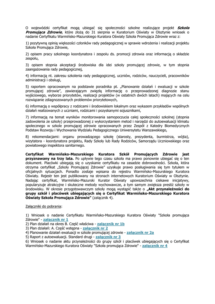 O wojewódzki certyfikat mogą ubiegać się społeczności szkolne realizujące projekt Szkoła Promująca Zdrowie, które złożą do 31 sierpnia w Kuratorium Oświaty w Olsztynie wniosek o nadanie Certyfikatu Warmińsko-Mazurskiego Kuratora Oświaty Szkoła Promująca Zdrowie wraz z: 1) pozytywną opinią większości członków rady pedagogicznej w sprawie wdrożenia i realizacji projektu Szkoła Promująca Zdrowie, 2) opisem pracy szkolnego koordynatora i zespołu ds. promocji zdrowia oraz informacją o składzie zespołu, 3) opisem stopnia akceptacji środowiska dla idei szkoły promującej zdrowie, w tym stopnia zaangażowania rady pedagogicznej, 4) informacją nt. zakresu szkolenia rady pedagogicznej, uczniów, rodziców, nauczycieli, pracowników administracji i obsługi, 5) raportem opracowanym na podstawie poradnika pt. „Planowanie działań i ewaluacji w szkole promującej zdrowie”, zawierającym zwięzłą informację o przeprowadzonej diagnozie stanu wyjściowego, wyborze priorytetów, realizacji projektów (w ostatnich dwóch latach) mających na celu rozwiązanie zdiagnozowanych problemów priorytetowych, 6) informacją o współpracy z rodzicami i środowiskiem lokalnym oraz wykazem przykładów wspólnych działań realizowanych z uczniami, rodzicami i pozyskanymi sojusznikami, 7) informacją na temat wyników monitorowania samopoczucia całej społeczności szkolnej (stopnia zadowolenia ze szkoły) przeprowadzonej z wykorzystaniem metod i narzędzi do autoewaluacji klimatu społecznego w szkole promującej zdrowie opracowanych przez Zespół z Katedry Biomedycznych Podstaw Rozwoju i Wychowania Wydziału Pedagogicznego Uniwersytetu Warszawskiego, 8) rekomendacjami: organu prowadzącego szkołę (starosty, prezydenta, burmistrza, wójta), wizytatora - koordynatora projektu, Rady Szkoły lub Rady Rodziców, Samorządu Uczniowskiego oraz powiatowego inspektora sanitarnego. Certyfikat Warmińsko-Mazurskiego Kuratora Szkół Promujących Zdrowie jest przyznawany na trzy lata. Po upływie tego czasu szkoła ma prawo ponownie ubiegać się o ten dokument. Placówki ubiegają się o uzyskanie certyfikatu na zasadzie dobrowolności. Szkoła, która otrzyma certyfikat „Szkoły Promującej Zdrowie” uzyskuje prawo posługiwania się tym tytułem w oficjalnych sytuacjach. Ponadto zostaje wpisana do rejestru Warmińsko-Mazurskiego Kuratora Oświaty. Rejestr ten jest publikowany na stronach internetowych Kuratorium Oświaty w Olsztynie. Nadając certyfikat, Warmińsko-Mazurski Kurator Oświaty upowszechnia ciekawe inicjatywy, popularyzuje atrakcyjne i skuteczne metody wychowawcze, a tym samym zwiększa prestiż szkoły w środowisku. W okresie przygotowawczym szkoły mogą wystąpić także o „Akt przynależności do grupy szkół i placówek ubiegających się o Certyfikat Warmińsko-Mazurskiego Kuratora Oświaty Szkoła Promująca Zdrowie” (załącznik 4). Załączniki do pobrania: 1) Wniosek o nadanie Certyfikatu Warmińsko-Mazurskiego Kuratora Oświaty "Szkoła promująca Zdrowie" - załącznik nr 1 2) Plan działań na okres B. Część właściwa - załącznik nr 1b 3) Plan działań: A. Część wstępna - załącznik nr 2 4) Planowanie działań ewaluacji w szkole promującej zdrowie - załącznik nr 2a 5) Raport z autoewaluacji. Standard drugi - załącznik nr 3 6) Wniosek o nadanie aktu przynależności do grupy szkół i placówek ubiegających się o Certyfikat Warmińsko-Mazurskiego Kuratora Oświaty "Szkoła promująca Zdrowie" - załącznik nr 4